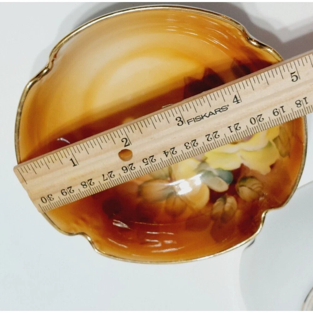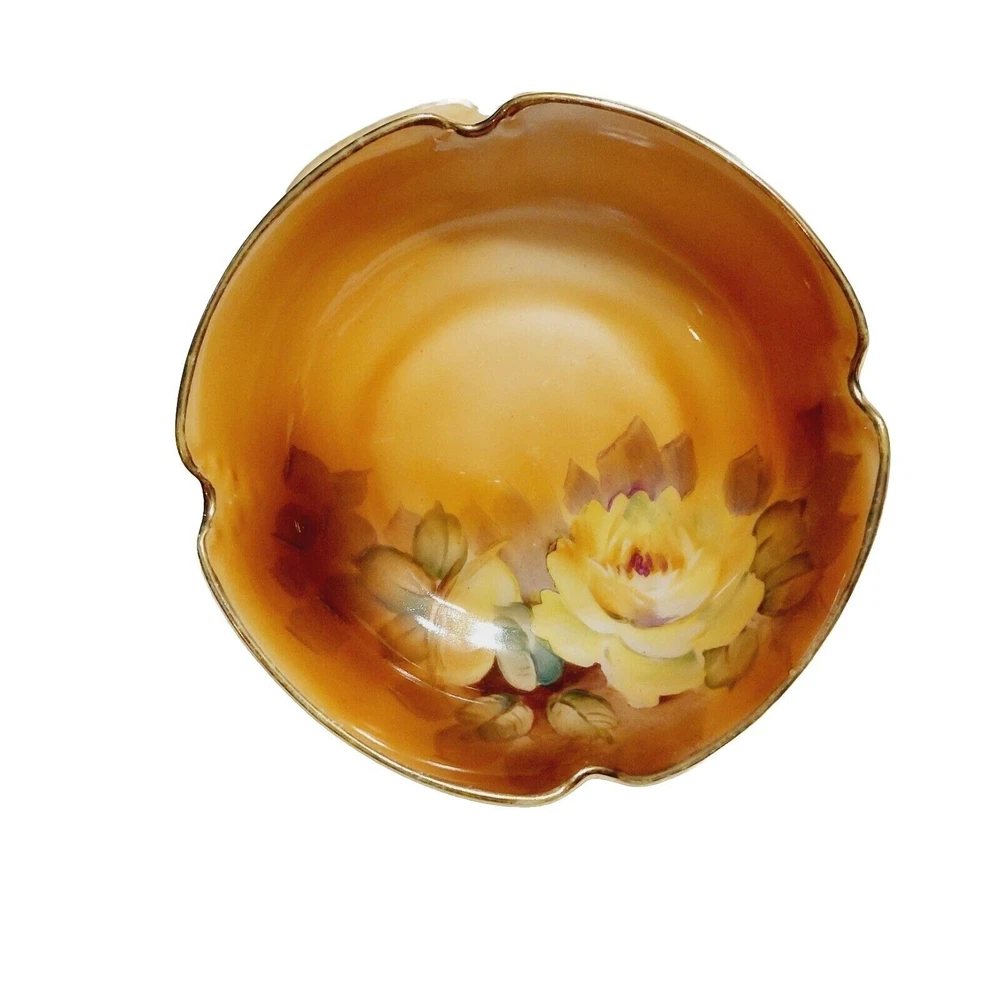 Nippon Bowl Porcelain Brown Yellow Roses Crimped Edges Hand Painted Set Of 2