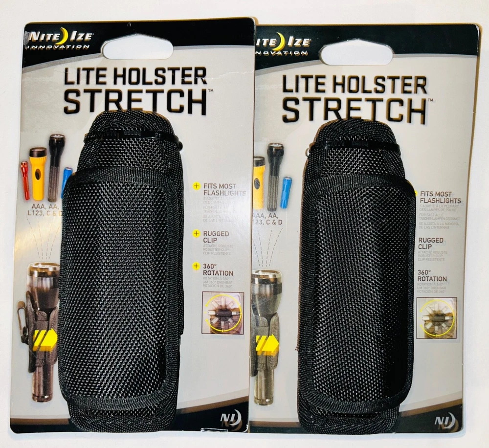 New - Nite Ize Lite Holster Stretch Flashlight Holster 2-Pack With its sturdy construction, molded foam insulation, and high-quality elastic side panels, our Lite Holster Stretch keeps flashlights of nearly every size safe at your side. In its relaxed state, a mini AAA flashlight is snug and secure, and the panels expand to provide a close fit for larger flashlights up to and including wide D cell models. Because its "over and under" clip rotates 360 degrees and locks in eight different positions, our Lite Holster Stretch also doubles as a useful hands-free device - angle up to see, read, or work with both hands on anything above waist level, or downward to illuminate your footpath in dim light. Open-ended design allows easy access to the flashlight's tail cap. Bid with confidence view my FEEDBACK IF YOU ARE SATISFIED WITH YOUR PURCHASE CAN YOU PLEASE LEAVE POSITIVE FEEDBACK. EBAY REQUIRES ALL SELLERS TO MAINTAIN A CERTAIN FEEDBACK LEVEL WHICH IN TURN ALLOWS SELLERS TO OFFER COMPETITIVE PRICING ON THEIR ITEMS. Payment: All items sold must be paid for immediately . Shipping: NO PO BOXES, NO APO ADDRESSES… I NTERNATIONAL SHIPMENTS are processed through the eBay Global Shipping Program . All related international shipping fees associated with the program are the buyers responsibility. I offer shipping to all continuous 48 USA states unless otherwise stated. ALASKA, HAWAII, PUERTO RICO and other U.S. territories please contact me prior to purchasing this item. (Additional shipping charges may apply) All shipping costs will be paid by the buyer unless otherwise stated in the listing. Combined shipping is available. All Items are inspected prior to shipping Return Policy: DEFECTIVE ITEMS ONLY ….I have a 30 day return policy. You must contact me through eBay the moment your concern or problem with the item is realized, I will issue a return shipping label . The item must be returned in the same packaging and include the original accessories and manual(s). I will contact you after I receive and inspect the item. Upon inspection if the item is found defective I will issue a full refund. (The serial number must match my records)