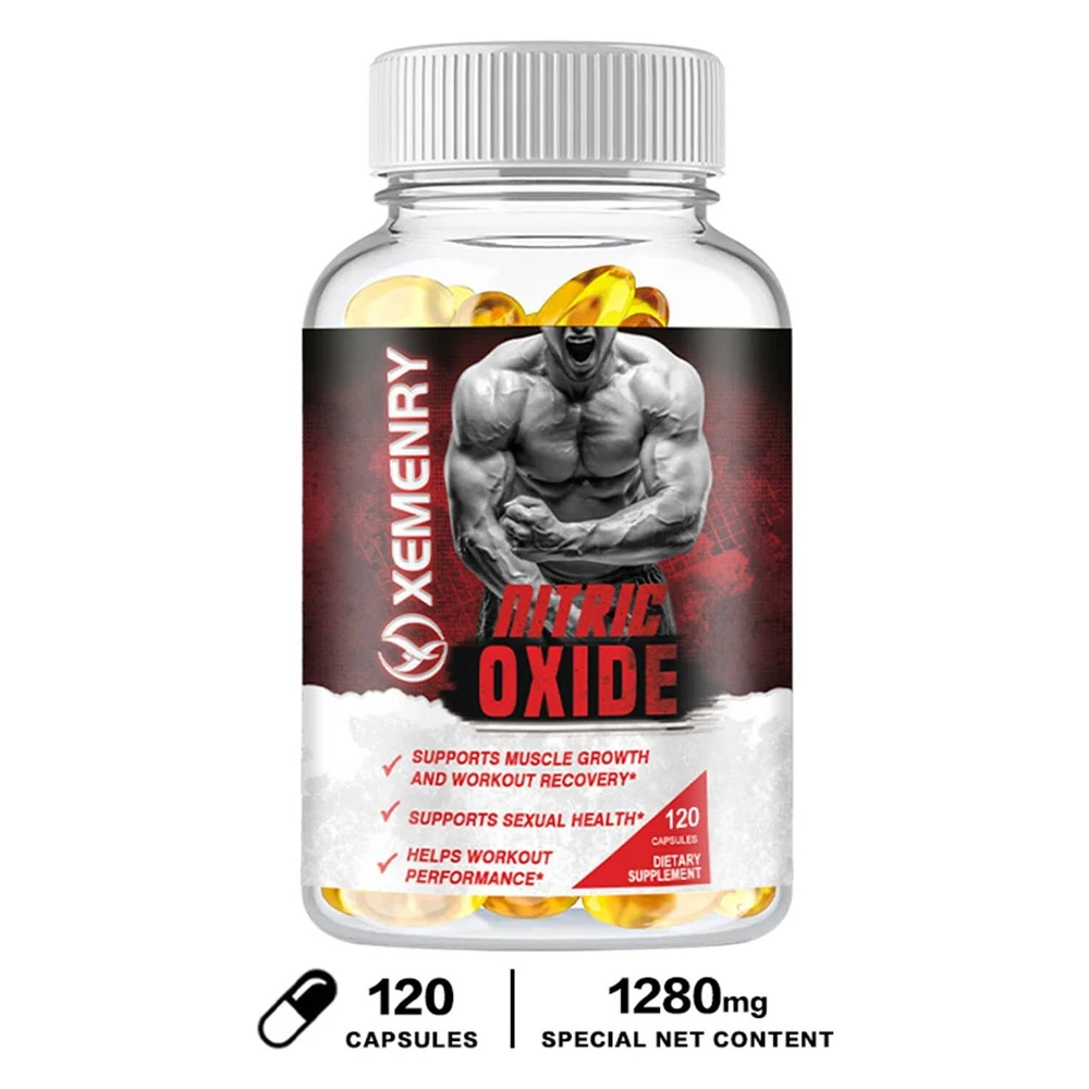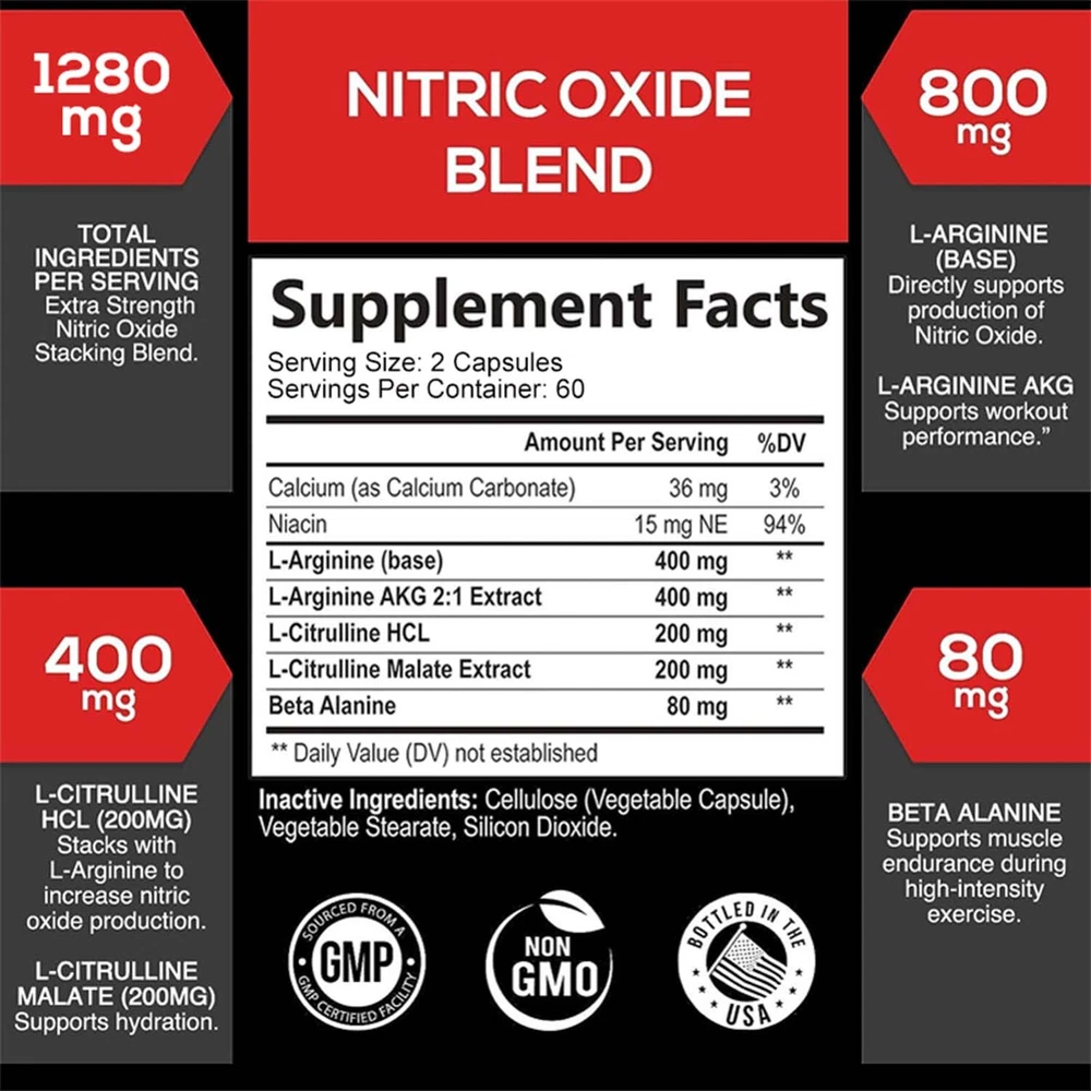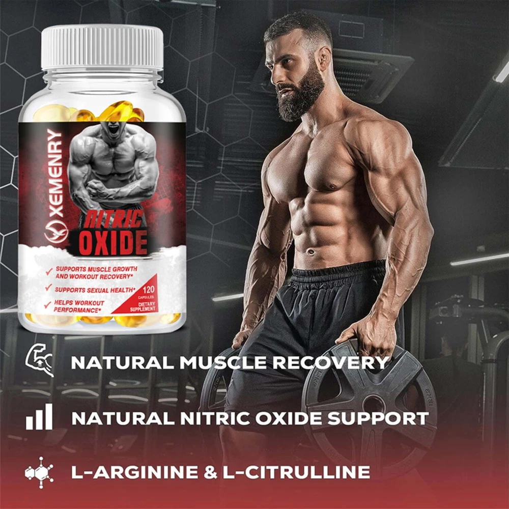 Effects: Testosterone Booster, Energy & Endurance Ingredients: L-Arginine Directions: Take 2 capsules once daily after a meal. Shipping: Ships within 48 hours on working days. Shelf life: 2 years Description: BUILD MUSCLE MASS AND RECOVERY: Nitric Oxide capsules are specially formulated with L-Citrulline and L-Arginine to support heart and muscle health, improve circulation and normal post-workout recovery. Workout Supplement - Our Nitric Oxide helps maintain energy levels during exercise. Feel the difference before, during and after your workout and get to your workout level. You can expect significant and reliable increases in energy, focus, pump, strength and muscular endurance. TRUSTED FORMULA: Our Nitric Oxide capsules are formulated and bottled under strict GMP guidelines. Third party tested to ensure quality and purity. Document