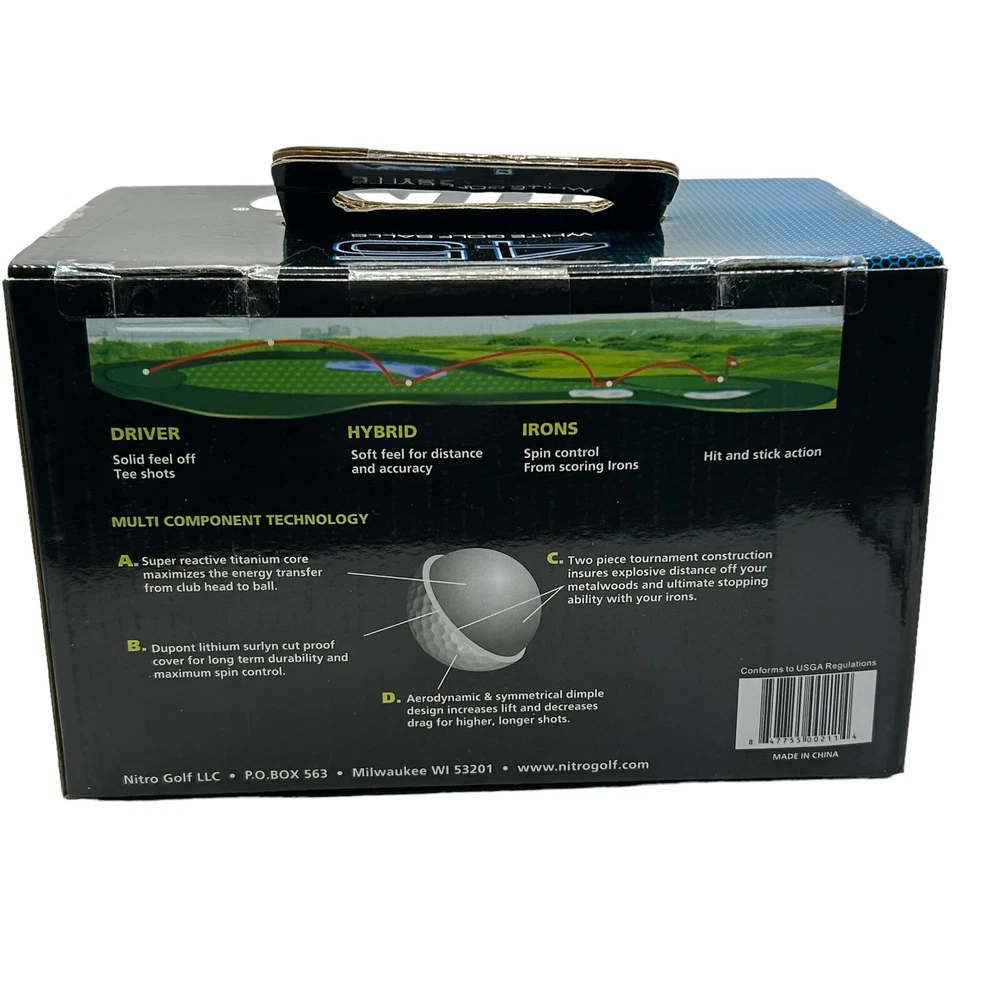 gtin13:629721555493Assembled Product Weight:4.8 lbsColor:WhiteManufacturer Part Number:NUD45WBXUPC:629721555493Ball Construction:2-piecePersonalize:NoBrand:Nitro GolfSport/Activity:GolfVintage:NoFeatures:DistanceCountry/Region of Manufacture:ChinaModel:Nitro Golf Ultimate DistanceAssembled Product Dimensions (L x W x H):6.00 x 5.20 x 8.50 InchesNumber of Items in Set:45