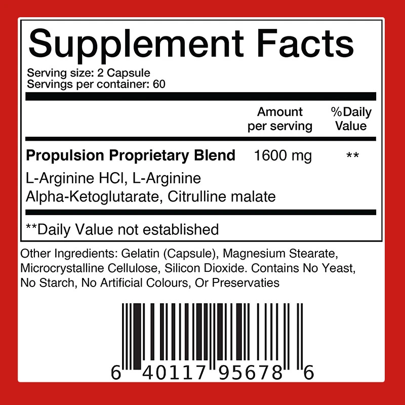 Effects: Energy & Endurance Ingredients: L-Arginine Directions: Take 1-2 capsules twice a day after meals. Shipping: Ships within 48 hours on working days. Shelf life: 2 years Description: BOOST YOUR MASCULINITY: Want to increase your stamina and confidence? Maintaining healthy testosterone levels will help boost your manliness, allowing you to focus on bigger things, improve physical performance, and keep your energy levels high all night long. PEAK PERFORMANCE: Want to boost your strength during workouts at the gym? Do you want to have lasting energy to power through your day? Higher testosterone levels can increase your confidence, drive, and enthusiasm. POWERFUL INGREDIENTS: Low testosterone levels can affect your manliness, health, and well-being. It contains L-Arginine HCI, L-Arginine, Alpha-Ketoglutarate and Citrulline malate. Document