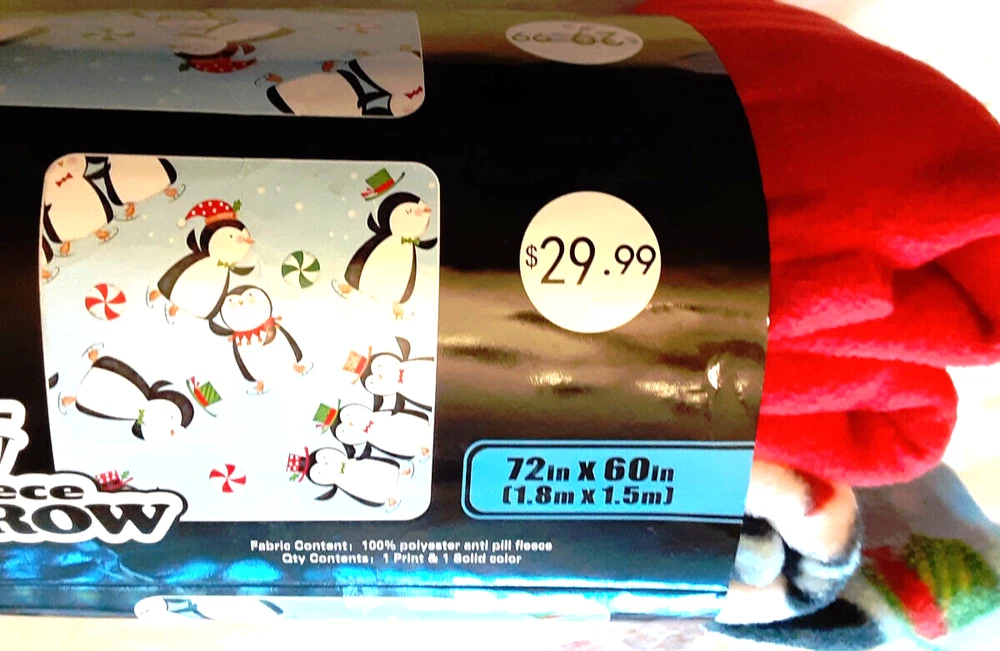 No-Sew Fleece Throw 72 x 60 - Winter Penguins in the snow with peppermint candy. And Red blanket. Great gift for all ages.