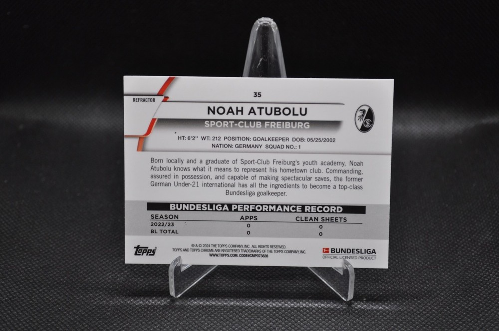 The product is a 2023-24 Topps Chrome Bundesliga trading card featuring Noah Atubolu, a rookie player from SC Freiburg. This specific card is from the Pulsar Refractor insert set, known for its eye-catching design and being part of a parallel variety. As a non-autographed card, it is a valuable addition for collectors looking to complete their collection of sports trading cards, particularly in the soccer category. With its unique features and limited availability, this Noah Atubolu trading card is a sought-after item for fans and enthusiasts alike.
