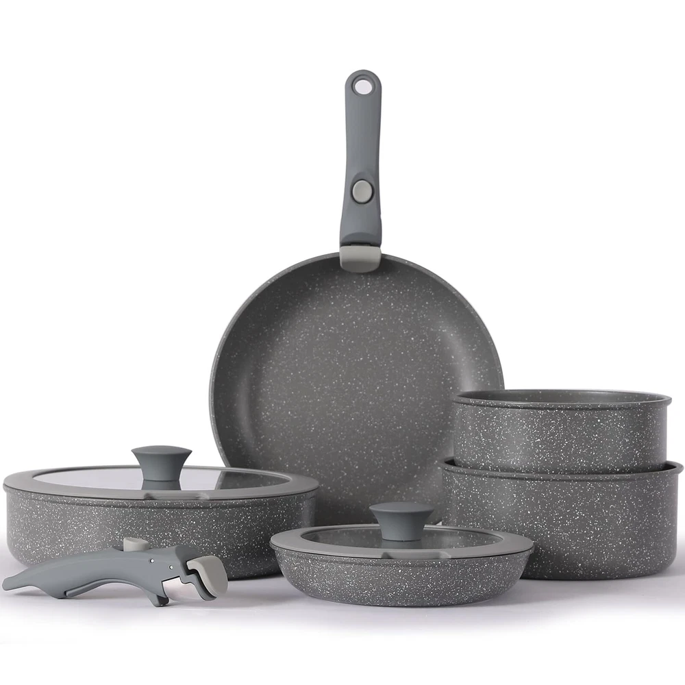Vkoocy Non Stick Pot and Pan Set with Removable Handle, Ceramic Cookware Set Detachable Handle, Induction Kitchen Camping Stackable Pots Pans, Dishwasher/Oven Safe, Grey [Complete set] : 8" Frying pan with lid (for 2.5 Qt saucepan), 10" Frying pan with lid (for 10" deep frying pan), 1.5 Qt saucepan, 2.5QT Saucepan, 10" Deep Frying Pan and two detachable handles. [Space saving] : This pot set can save more than 70% of the space in your drawer or cabinet, and the POTS with removable handles are easy to stack for optimal storage. It fits easily in the trunk of a car and is ideal for travel, camping, motorhomes and kitchens. [Easy to clean] : This ceramic coating does not contain PFOA, PFAS, PTFE, PB, cadmium, non-toxic and healthy. Very easy to clean and dishwasher-safe, with just a dab of a rag or sponge to remove stains. [For all stoves] : Suitable For All Stoves : High magnetic conductive stainless steel base allows our non stick kitchen cookware to work on all cooktops, like Electric, Halogen, Ceramic, Gas, Induction and Oven (Lids and handles are not recommended for the oven). The Extended and Thicken Bottom Design also makes the cookware durable and heats up quickly and evenly. [Customer Service]: VKoocy cookware set has 100% passed the quality tests before they leave the factory! If you have any questions during use, please feel free to contact us. We take your problem seriously and guarantee a 100% solution to your problem 1 SHIPPING Domestic Buyers - We ship within 3 business days of payment, usually sooner - We offer FREE shipping on all orders! - We only ship to the lower 48 states, no APO/FPO addresses or PO Boxes allowed - We have confidence in our products, but if you are not fully satisfied please contact us within 30 days of purchase and you will get full refund. International buyers – please note: Import duties, taxes, and charges aren't included in the item price or postage cost. These charges are the buyer's responsibility. - Please check with your country's customs office to determine what these additional costs will be prior to bidding or buying. Return Policy - This product comes with 30-Days Money Back Guarantee. - If you receive an item and it doesn't work properly or you don't like it because of any reason at all, - we have a 100% refund/return policy. We will ship you a new item or refund your money for the full sale amount. - For all returned products, buyers MUST contact us for the returning address. * Order Cancellation Policy ** You can return a product for up to 30 days from the date you purchased it. 1. The seller reserves the right to cancel the special case only due to eBay cancellation fee. 2. The decision of seller is the final. 3. The seller will respond to the cancellation request within 2 business days. Please wait for the result of cancellation. 4. In case the cancellation is not completed by some reasons, the buyer can follow the options below to get the refund. 4.1 The buyer can reject the item when it arrives. 4.2 The buyer can send the item back to the seller within 30 days If the buyer receives item (USA Shipment ONLY). The seller will provide the FREE return label to the buyer when the buyer opens " Return Item" case on eBay by using the reason as "Change my mind" ONLY. 5. When buyer has placed the order. The order will be processed and completed by automatic warehouse system within 5 minutes. In case that buyer sends the cancellation request after 5 minutes of placing the order, the request will be rejected. **Sending direct message to cancel the order is not allowed for every case.* Return Policy For the return case - If buyer would like to return the items for refund or replacement, please CONTACT SELLER to receive the free return label from seller. The refund or replacement will be processed with the tracking number of return label which is provided by seller only. The other ways of return which are not approved by seller will not be processed for the refund or replacement.