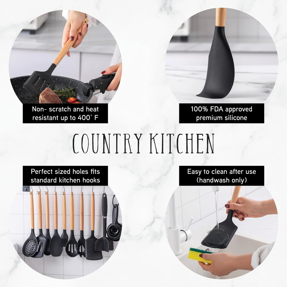 will give you all the reasons to LOVE your kitchen utensils! Cook, bake and serve with this fashionable cooking tool set that is sturdy and easy to clean! Kitchen beauties that won't disappoint! Comprehensive Set: From spatulas, spoons, and ladles to tongs, whisk, and more, this 38-piece set covers the entire spectrum of cooking tasks, enabling you to prepare meals with precision and finesse, whether you're a seasoned chef or a home cook. Sleek Storage and Maintenance: The included bamboo utensil holder not only keeps your kitchen organized but also adds a touch of elegance to your countertop. Cleaning is a breeze - the silicone tops are dishwasher-safe, and the bamboo handles can be easily wiped clean for long-lasting beauty and functionality. Versatile Silicone Tops: Each utensil is equipped with durable silicone tops that are heat-resistant and safe for non-stick cookware, ensuring effortless cooking, stirring, flipping, and serving without scratching your precious pots and pans.