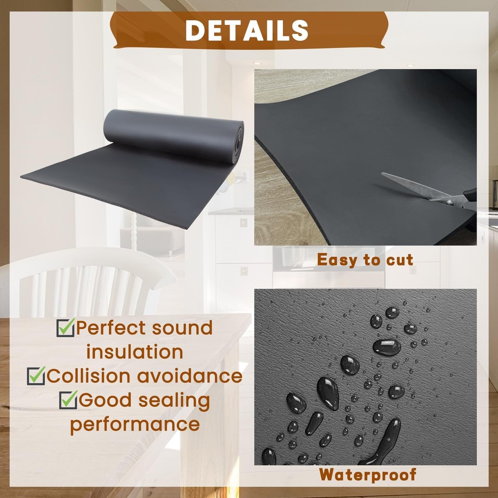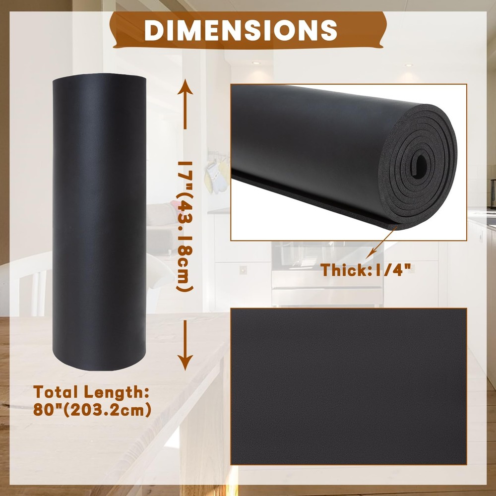 Features: This premium quality foam rubber padding offers oil resistance, tear resistance, weather resistance, and flame retardancy for long-lasting performance. neoprene sheet withstands temperatures from -40°F to 155°F, providing reliable sealing and cushioning in diverse conditions. Our foam rubber can effortlessly cut with scissors for various applications like weather stripping, padding, and insulation. This foam gasket material is suitable for window sealing, soundproofing, wind buffering, and expansion joints in both residential and commercial settings. Measuring 1/2" Thick × 17" Wide × 60" Long, our foam padding ensures dependable performance for your DIY projects. Package include: 1/4" Thick × 17" Wide × 80" Long Neoprene Foam Rubber Wide Temperature Range: neoprene sheet withstanding temperatures from -40°F to 155°F, provides reliable performance in diverse conditions, ensuring effective sealing and cushioning against air, moisture, and impact. Premium Quality Material: This foam rubber padding is constructed from solid neoprene rubber, boasts excellent properties including oil resistance, tear resistance, weather resistance, and flame retardancy, ensuring long-lasting performance and durability. Adjustable & Easy to Cut: The foam rubber can be effortlessly cut into desired shapes and sizes using scissors, allowing for customizable solutions for weather stripping, padding, insulation, and more around windows, doors, or within toolboxes and cabinets. Versatile Usage: neoprene foam is ideal for window sealing, soundproofing, wind buffering, and concrete and steel expansion joints, meets a wide variety of needs in both residential and commercial environments. Reliable Performance: this foam gasket material is measuring 1/2" Thick × 17" Wide × 60" Long, it has a wide temperature range and versatile features to ensure reliable performance, making it a great addition to your DIY kit.