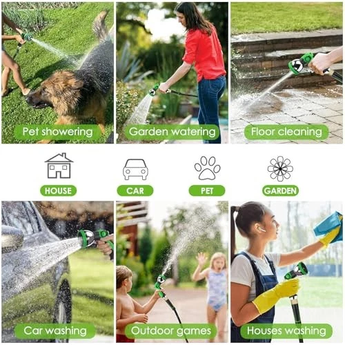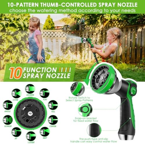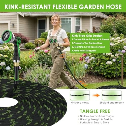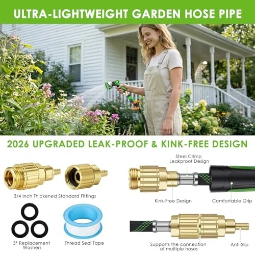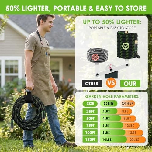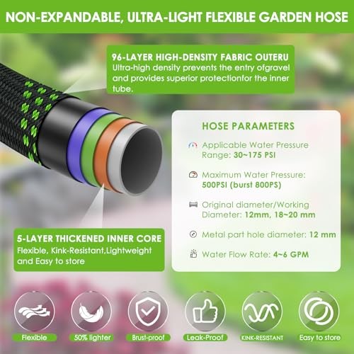 About this itemUltra Lightweight, Flexible, Kink-Free: Stop wrestling with heavy rubber hoses! At 50% lighter than traditional hoses, this non-expandable hose eliminates arm fatigue during long watering sessions. Simply walk forward while holding the nozzle—kinks will disappear as you go. Includes a portable storage strap for tangle-free, space-saving organization.Non-Expandable Design, Ultra-Durable: Built to last with high-density braided fabric outer layer and 5-layer reinforced flexible inne