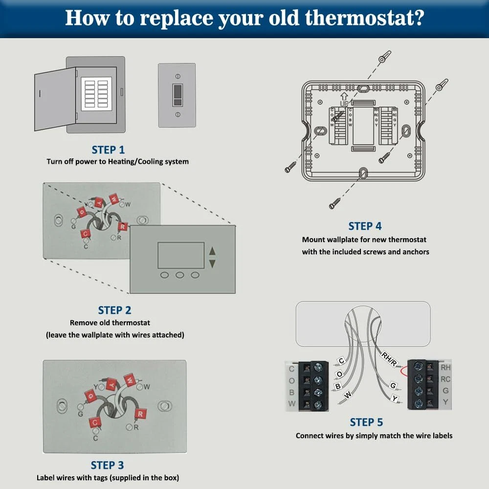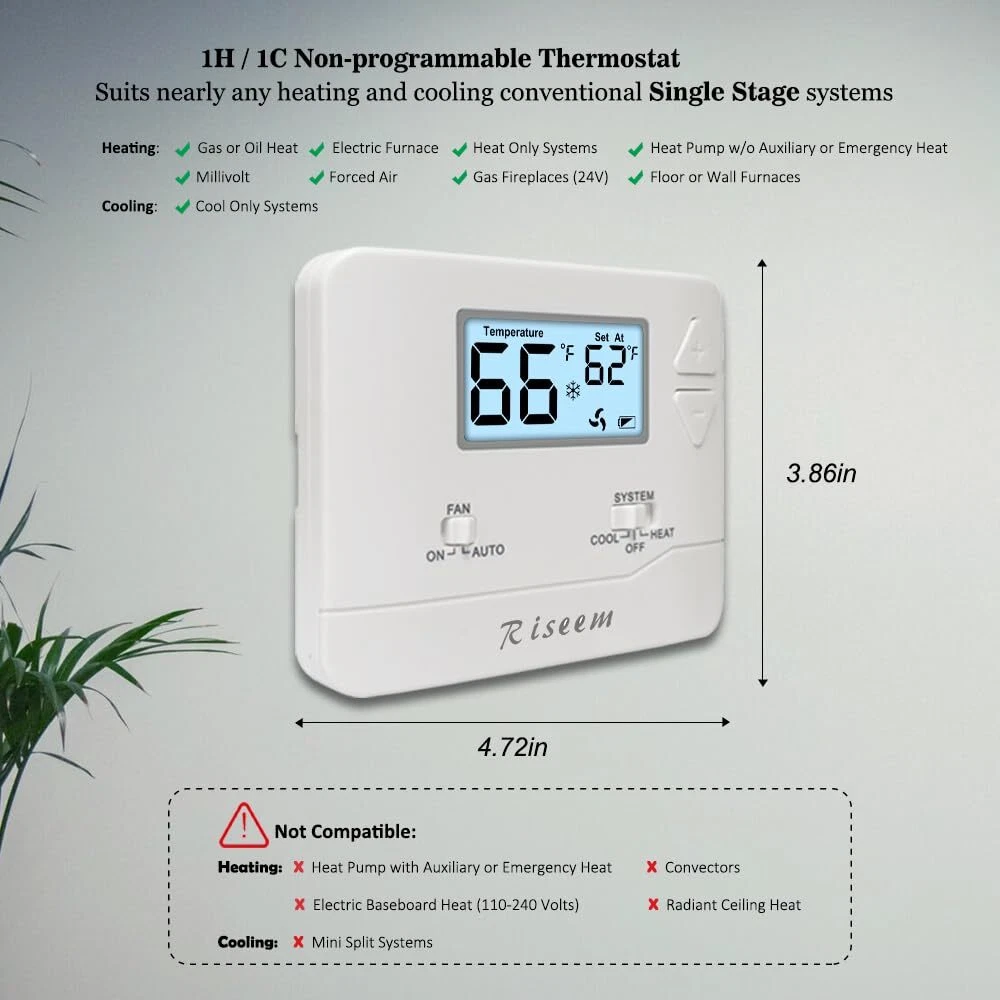 High Compatibility: Forced air (gas, oil or electric), Electric furnace, Hot water steam or gravity radiant heat, Heat only systems, Heat pump w/o auxiliary or emergency heat, Millivolt, Gas fireplaces (24V), Floor or wall furnaces, Cool only systems.(TIP: Before purchasing, check to see if this thermostat is compatible with your system.) Not Compatible: Heat pump with auxiliary or emergency heat, Dual fuel/hybrid heating, Electric baseboard heat (110-240 volts), Line voltage, Convectors, Radiant-ceiling heat, Mini split systems and 12V RV systems. Easy to Install and Use: Large terminal blocks with universal sub-base, can be installed within 30 minutes, clear, easy-to-read backlight LCD display and easy controls make for a user-friendly experience. Simple but Powerful Control: Easy-access front-load battery compartment, adjustable temperature differential (swing) for energy optimization and maximum system life, Support temperature display calibration, Convert °C/°F units, compressor delay protection (selectable on or off). Dual Power Supply: Can be powered by 24VAC power or 2 AAA batteries, No common wire (C-wire) required on most systems (only required on heat only and cool only systems).