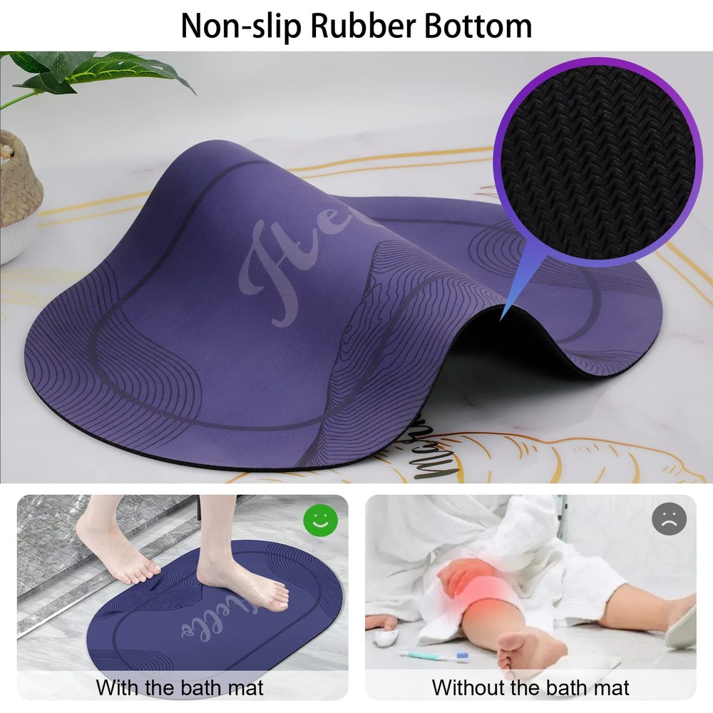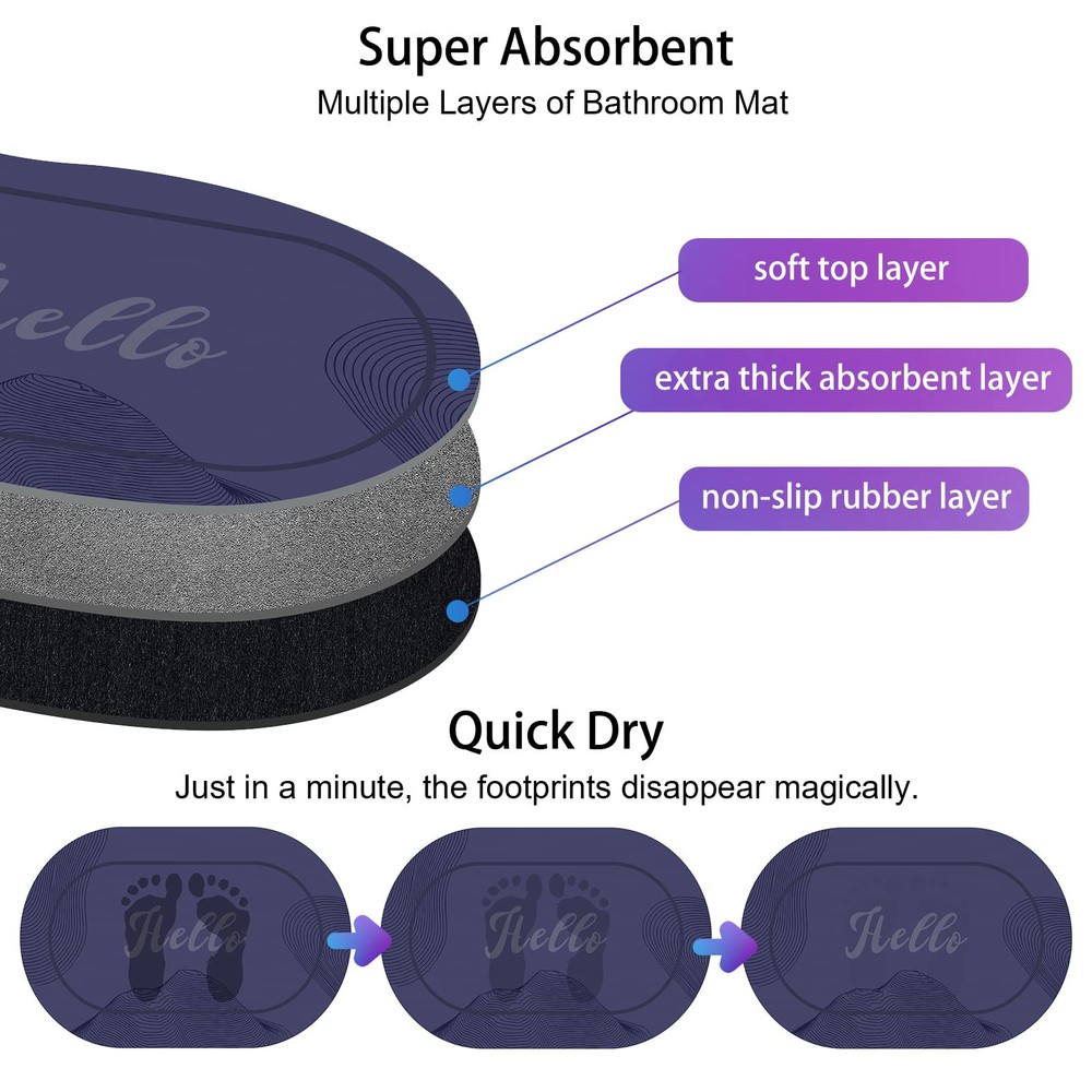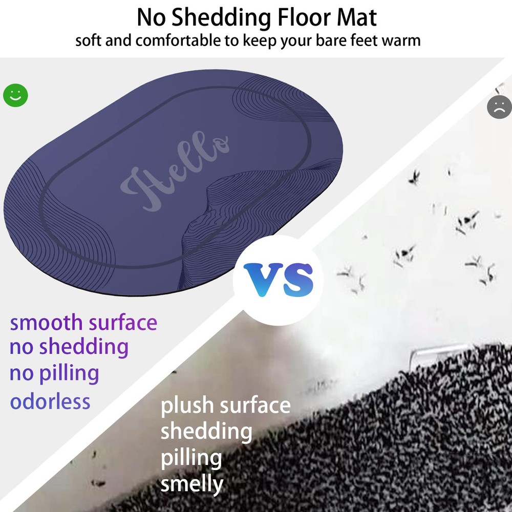 Absorbent & Quick Dry: The 3.5mm thickened soft diatom mud layer has better water absorption. With many small holes inside, this mat can speed up the penetration and evaporation of water, increase the surface to the air and make wet footprints disappear magically in just a few minutes. Super Non-slip Bottom: The anti-slip rubber backing has a special texture, which can firmly fix the bathroom mat on the wet floor and avoid accidents. Washable & Dirt Resistant: The mat is machine washable. It has a smooth surface and super easy to clean. You can get it clean with the shower head and make it like new. Soft Touch & No Shedding: The surface of the mat is made of high-quality faux suede fabric, which is soft and comfortable to keep your bare feet warm even in cold weather. Unlike plush floor mats that contain a lot of microfiber, this product does not shed lint everywhere. Suitable for multiple scenes: This Hello doormat can be used not only in the bathroom, but also on the front door, entryway, stairs, patio, laundry, balcony, kitchen or any area where it can be used to decorate the house and greet guests.