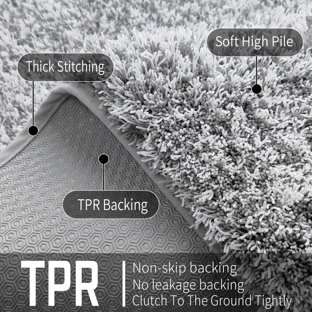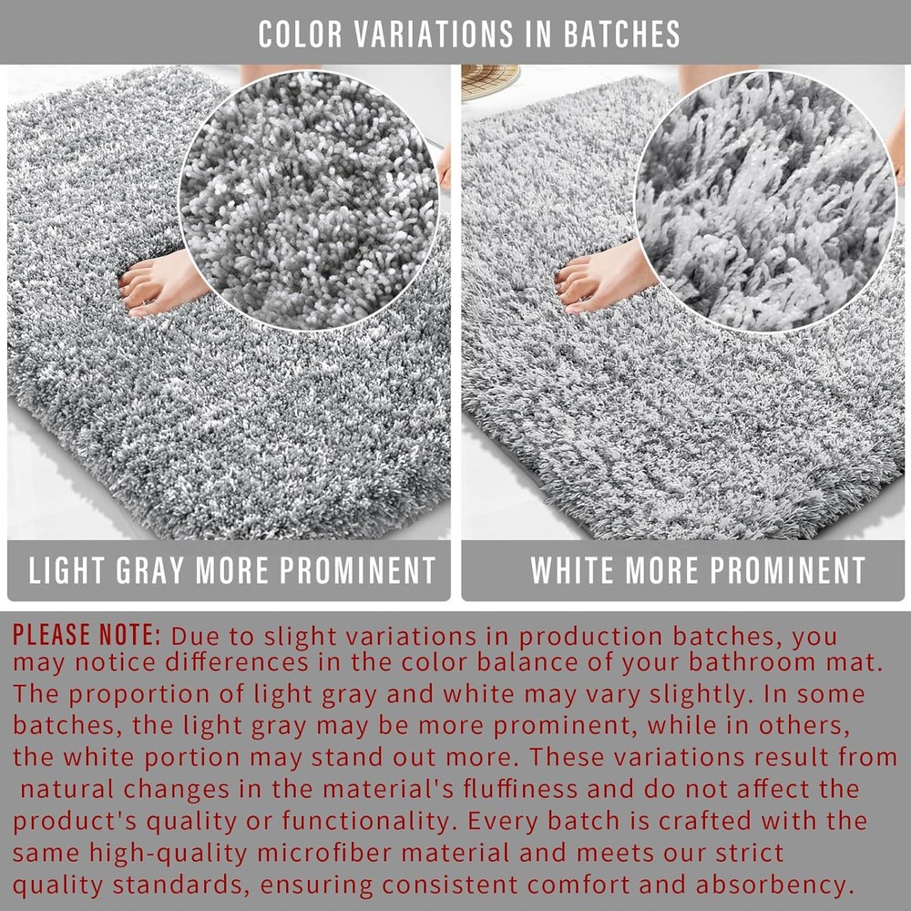 Yimobra Bathroom Rugs Non Slip Washable 17" x 24", Light Gray and White Product Details Brand: Yimobra Size: 17" x 24" Material: Rubber Weave Type: Machine Made Item Weight: 16 ounces Pile Height: High Pile Construction Type: Machine Made Back Material Type: Thermoplastic Rubber (TPR) Color: Light Gray and White Indoor/Outdoor Usage: Indoor Theme: Clouds Is Stain Resistant: Yes Product Care Instructions: Machine Wash Pattern: Solid Special Feature: Fluffy, Dry Quick, Non Slip, Washable Room Type: Laundry Room, Bathroom, Bedroom, Living Room Product Dimensions: 17"L x 24"W Rug Form Type: Bath Mat Style: Shaggy Occasion: Housewarming Number of Pieces: 1 Item Thickness: 2 Centimeters Water Resistance Level: Not Water Resistant Is Autographed: No Age Range (Description): Adult Item Weight: 1 pounds Manufacturer: Yimobra Fabric Type: Microfiber Assembly required: No Batteries required: No Microfiber [ MULTIPLE MACHINE WASHES WITHOUT CLUMPING OR TANGLING ] Our fluffy bathroom rug can maintains its pristine shape and texture even after numerous machine washes. Unlike other bath mats on the market prone to clumping and tangling, our plush bath rug is crafted from sturdy, reliable materials that ensure long-lasting use. Cleaning is a breeze—whether hand-washing or using a machine, this bath mat emerges looking brand new, maintaining its quality through time [ FLUFFY SOFTNESS and RESILIENT AGAINST FOOT TRAFFIC] Yimobra's luxurious bathroom rugs have been elevated with new elastic microfiber, ensuring the preservation of their fresh appearance and plush feel even after repeated use. With an ability to resist sinking or flattening, our rug offers an unparalleled walking experience, akin to strolling on clouds. The rug's thickness and softness are especially convenient for tasks like bathing kids, providing a comfortable surface to kneel on [ ULTRA-ABSORBENT and QUICK-DRYING ] Our plush bath rugs for the bathroom showcase a dense pile of absorbent fibers that effortlessly soak up water. Step onto the mat with confidence right after your shower, preventing any water from being tracked onto your bathroom floor. The high-density material excels not only in moisture absorption but also in providing a cushioned haven for your feet, ensuring warmth and coziness even on the coldest tiles [ PATENTED NON-SLIP TPR BOTTOM FOR ENHANCED SAFETY ] Our bath rug featuring a patented hexagon suction cup-inspired bottom design that firmly anchors the mat in place. This ingenious structure effectively prevents water from seeping through, adding an extra layer of security for both you and your loved ones. Engage in your bathroom activities with peace of mind, knowing you are safeguarded against slips and falls [ VERSATILE USAGE SCENARIOS ] Our luxury shaggy microfiber bathroom rugs effortlessly harmonize with various bathroom settings. With an array of colors and sizes to choose from, you can find the perfect fit for your decor. Enhance your shower, bathtub, master bathroom, kids' bathroom, or vanity area with these rugs. Their warm and cozy surface invites relaxation, transforming your bathroom into an oasis of comfort and style