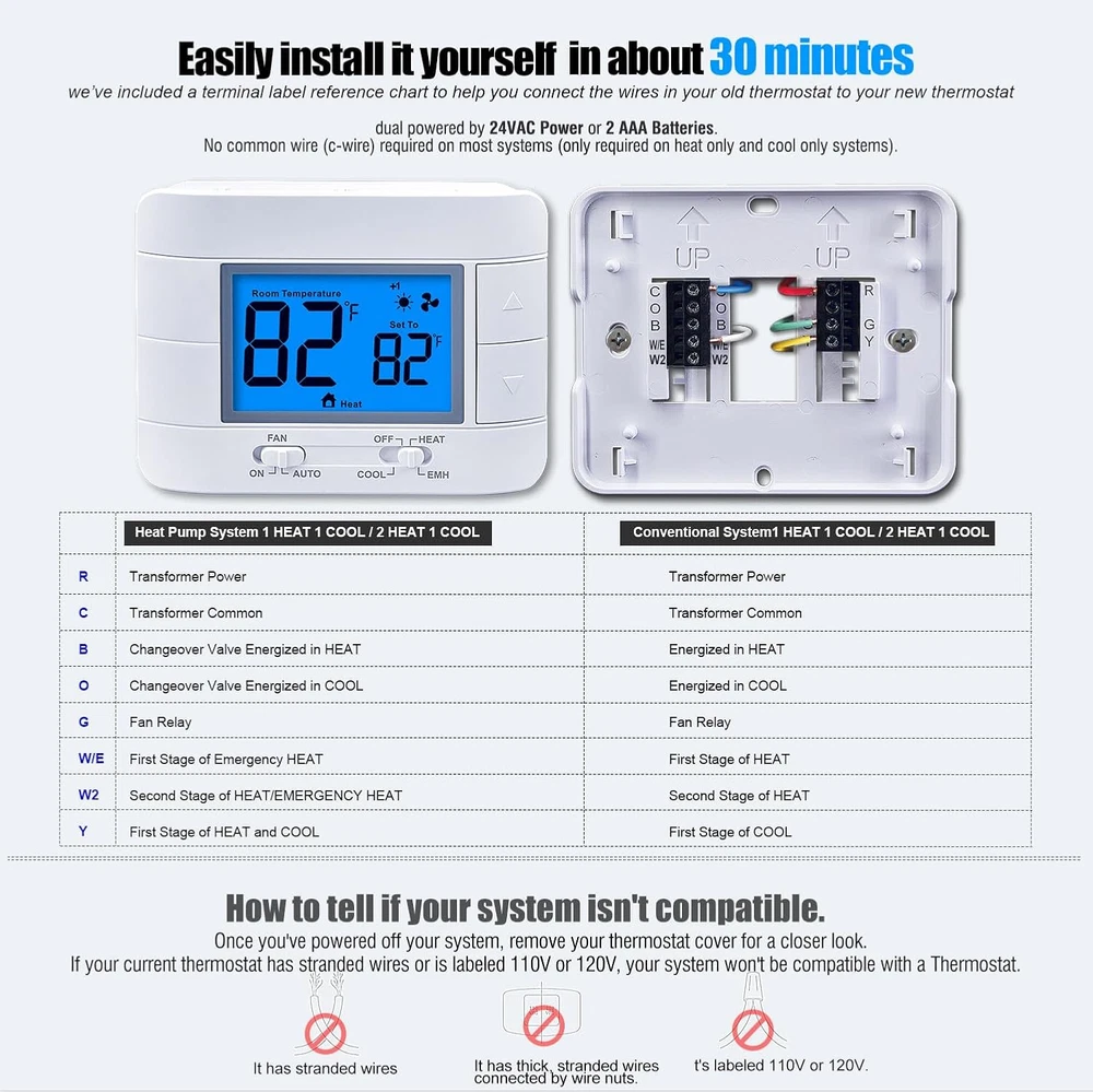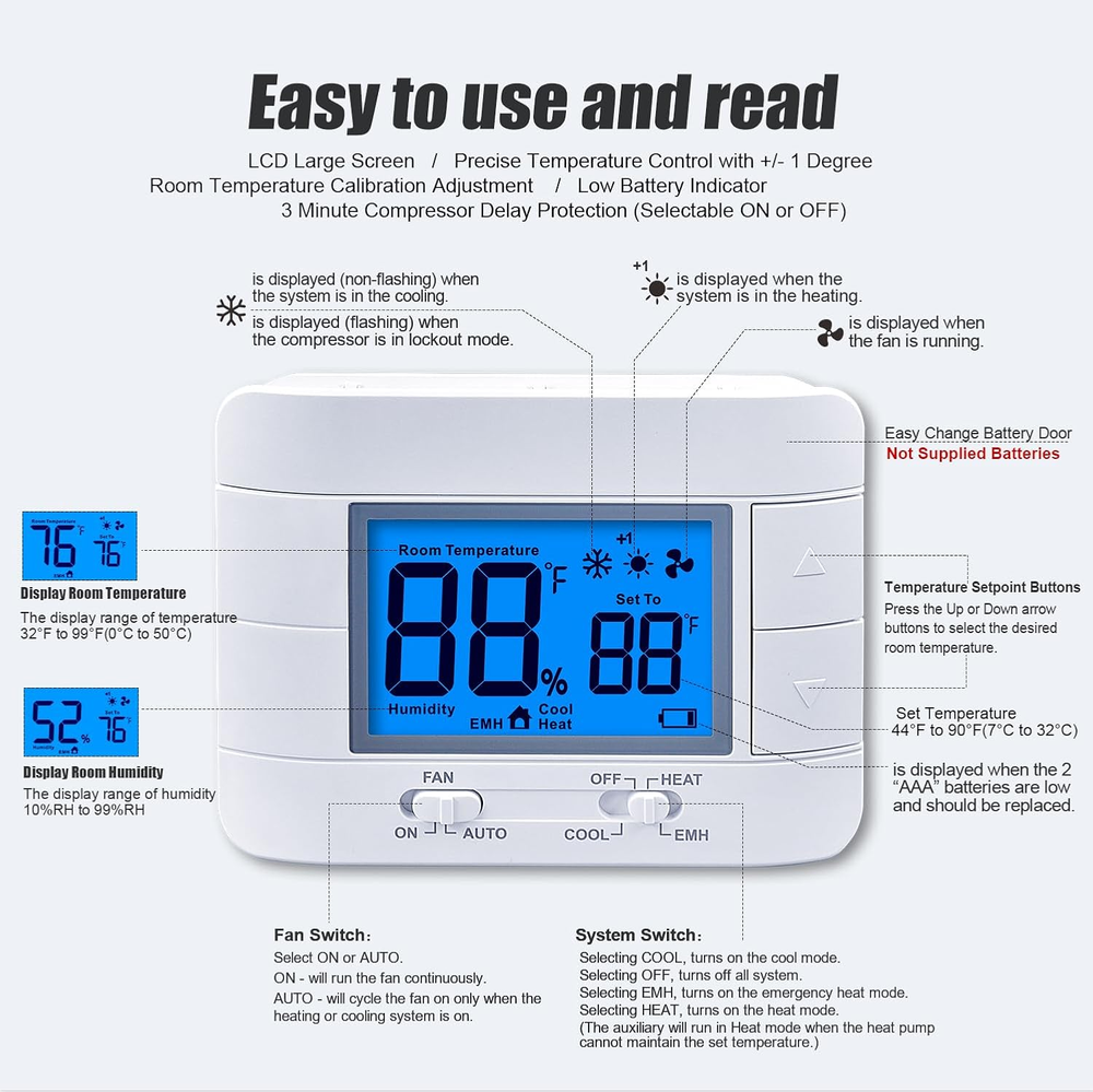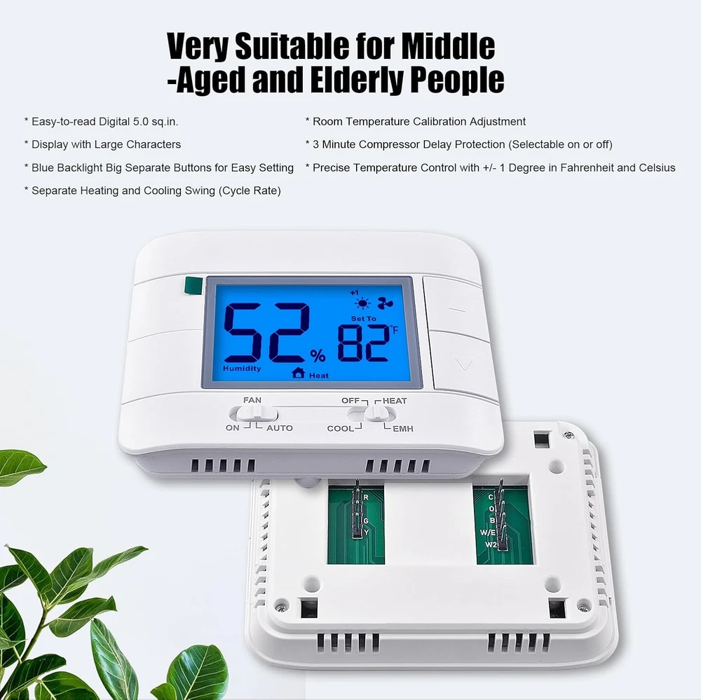 Store New Arrivals Add to Favorite View Feedback Contact Thermostat Non Programmable Heat Pump Thermostat for House 2H/1C, with Large LCD Display of Room Temperature and Humidity Description Item model number M721 Style Heat Pump Thermostat Power Source [User-Determined: 24VAC or Battery] Control Method Remote Temperature Control Type Manual Controller Type Push Button Control Type Button Control Product Dimensions 0.99"D x 4.92"W x 3.73"H Material Plastic Model Name Heat Pump Thermostat Specific Uses For Product Heat Pump Thermostat Included Components Temperature Sensor Country of Origin China Item Weight 5.6 ounces Special Feature Large Display Display Type LCD Mounting Type Wall Mount Color Blue Backlight Shape Rectangular Voltage 24 Volts (AC) Manufacturer Mroinge Brand Mroinge Backlight Yes Non-programmable heat pump thermostat for home up to 2 heat/ 1 cool, it is designed for easy installation and operation. (Kind reminder: Before purchasing, please check if this thermostat is compatible with your old thermostat) Large Numbers Display: The thermostat features a large display with clear and easy-to-read numbers, making it convenient for anyone to check the temperature and humidity levels at a glance. Does Not Work with 110-240V HVAC systems, Does Not Work with 120/240V electric baseboard heat / line voltage systems, and Does Not Work with RV thermostat. Compatible: heat pump systems and central gas, oil, or electric furnace systems, our thermostat can efficiently control the heating and cooling of your home, providing maximum comfort. Power Options: The heat pump thermostat can be powered either by a 24VAC power source or 2 AAA batteries (C-wire is not required), giving you flexibility in choosing the power supply that suits your needs. Temperature Calibration: Our thermostat allows for temperature calibration, ensuring accurate and precise temperature control, so you can enjoy the perfect indoor climate. Compressor Delay Protection: Equipped with compressor delay protection, our thermostat prevents frequent cycling of the compressor, extending its lifespan and saving energy. Separate Heating and Cooling Swing: The heating and cooling swing feature of our thermostat allows for better temperature control, ensuring optimal comfort in your home. with 2-year warranty. Product Description Mroinge M721 Non Programmable Heat Pump Thermostat Mroinge M721 non programmable heat pump thermostat is the perfect solution for homeowners looking for a reliable and easy-to-use thermostat for their heating and cooling systems. With its easy installation process, even Middle-Aged Elderly People can effortlessly set it up without any hassle. The thermostat features a large display with clear and easy-to-read numbers, making it convenient for anyone to check the temperature and humidity levels at a glance. Designed to be compatible with heat pump systems and central gas, oil, or electric furnaces systems, this thermostat offers versatility and flexibility for different heating options. You can rest assured knowing that it will seamlessly integrate with your existing system. The thermostat operates on 2 AAA batteries, ensuring long-lasting and reliable performance. With the heating and cooling swing feature, you have the flexibility to set the temperature range within which the thermostat will activate the heating or cooling system. This allows for optimal comfort and energy efficiency. Additionally, the thermostat offers temperature calibration, allowing you to fine-tune the temperature readings for precise control. One of the standout features of this thermostat is the built-in compressor delay protection. This feature helps to extend the lifespan of your heating and cooling system by preventing frequent cycling, reducing wear and tear on the compressor. In summary, the non programmable heat pump thermostat is a reliable and user-friendly option for homeowners seeking a hassle-free solution for their heating and cooling needs. Its easy installation, large display, compatibility with various systems, and additional features such as temperature calibration and compressor delay protection make it a top choice for anyone looking for a non-programmable heat pump thermostat. ABOUT US We offer the best prices around on high quality products. Our E-store includes media such as books, movies, music and games while offering electronics, toys, sporting apparel, clothing, tools, general home, garden items and more. SHIPPING We are always working hard to ensure your package arrives as soon as possible. Please understand that some factors like weather, high postal traffic, and the performance of shipping companies are outside of our control. We offer free shipping to the lower 48 states and ship within 2 business days of payment, usually sooner. We do not accept P.O. Boxes. Please provide a physical address. RETURNS We offer a 30-Day Return Policy on items which you are not completely satisfied with. You have the option for a full-refund or an exchange of the item. No returns are available on items shipped outside of the USA. PAYMENT We accept PayPal. CONTACT US This page content is yet to come Please ad us to your favorite seller and visit again later Thank You CUSTOMER SATISFACTION We try our very best to make sure every customer is completely satisfied. If there's a problem, message us! We're happy to help.