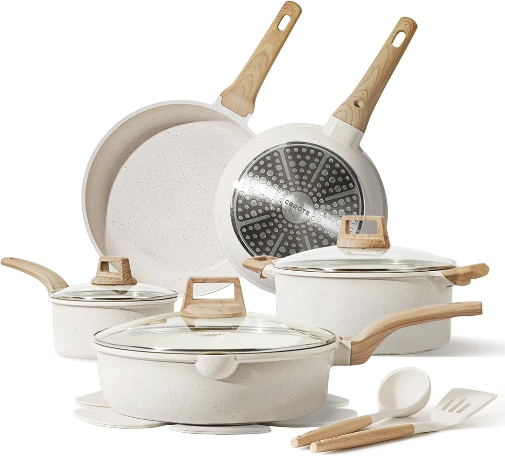 Store New Arrivals Add to Favorite View Feedback Contact Nonstick Cookware Set Kitchen Cooking Set Pots & Pans Set 14 Pcs FREE SHIP USA Description Item model number A08308 Closure Material Aluminum Number of Pieces 14 Item Volume 14.7 Quarts Color Cream White Included Components 8 inch Frying Pan, 11 inch Frying Pan, 1.8 QT Saucepan with Lid, 2.4 QT Saucepan with Lid, 6QT Casserole Pot with Lid, 4.5QT Saute Pan with Lid, White Silicone Turner Material Aluminum Country of Origin China Is Dishwasher Safe Yes Item Weight 14.87 pounds Is Oven Safe Yes Handle Material Bakelite Utensil Compatibility Multiple-utensil compatible Material Type Free PFOA Free Special Feature Gas Stovetop Compatible, Electric Stovetop Compatible, Induction Stovetop Compatible Product Dimensions 15 x 13 x 7 inches Compatibility Options Electric Stove, Gas Stove, Induction Size 14 Piece Sturdy Die-Cast Aluminum Body: The reinforced die-cast aluminum construction of this kitchen pots and pans set ensures long-term durability and reliability while maintaining a lightweight design. This lightweight feature brings convenience to your cooking experience. CAROTE 14-Piece Cookware Set Includes 8 inch Frying Pan, 10 inch Frying Pan, 1.8 QT Saucepan with Lid , 4.5QT Casserole Pot with Lid, 3QT Saute Pan with Lid, utensil*2 . Our favourite non-stick pots and pans set meets all your needs for everyday cooking White Granite – A top-level, harder nonstick granite material with 10x Ultra Non-stick performance, our cookware ensures your daily cooking is always safer and healthier. Easy To Clean – Just wipe it with a paper towel or rinse it with water, Less CO2 emission and Less water wasted. Recommend hand washing the cookware as it is effortless to clean. Suitable For All Stoves – Heats up quickly and evenly with an extended bottom design. A high magnetic conductive stainless steel base allows our nonstick cookware to work on all cooktops, including induction. Product Description CAROTE Cream White Cookware Easy to clean Cleaning is a Breeze. Easy to clean set finished with an enhanced nonstick exterior makes cleanup easy. What's Behind ? We found that the natural material extracted from cream white granite has extra durability and has impressive non-stick properties. After two years of experimentation and improvement, we are proud to represent this collection. " Carote white stone collection has been sold in 30 countries and regions in the world, it's becoming the most popular item of the brand, we could see the trend of this amazing product. " -- Alex.Z. Director of the Brand Carote. CAROTE Cream White Cookware A Better Nonstick Cookware Set A top level, harder nonstick granite pan with 10x Ultra Non-stick performance. Even the simplest recipes get star treatment with Carote's unique and stylish kitchen pots and pans set. Heavy-gauge base makes this kitchen pots and pans set safe for all stovetops and durable enough for long-time use. 1 Heat Up Fast and Evenly 2 Pros with White Granite CAROTE Nonstick Cookware Material Granite Material Granite Material Granite What's included 9.5'' +11'' Fry Pan, Egg pan,1.7 QT Saucepan, 4.3QT Casserole, 4.5QT Saute Pan What's included 9.5'' +11'' Fry Pan, Egg pan,1.7 QT Saucepan, 4.3QT Casserole, 4.5QT Saute Pan What's included 9.5'' +11'' Fry Pan, Egg pan,1.7 QT Saucepan, 4.3QT Casserole, 4.5QT Saute Pan ABOUT US We offer the best prices around on high quality products. Our E-store includes media such as books, movies, music and games while offering electronics, toys, sporting apparel, clothing, tools, general home, garden items and more. SHIPPING We are always working hard to ensure your package arrives as soon as possible. Please understand that some factors like weather, high postal traffic, and the performance of shipping companies are outside of our control. We offer free shipping to the lower 48 states and ship within 2 business days of payment, usually sooner. We do not accept P.O. Boxes. Please provide a physical address. For shipping outside of the continental USA, we only use eBay's Global Shipping Program.The item is shipped to KY and then sent to the rest of the world. International customers are responsible for all duties and taxes. Continue to check out in order to calculate costs for shipping the item to your country. Messages regarding eBay's Global Shipping Program MUST be directed at eBay EXCLUSIVELY. RETURNS We offer a 30-Day Return Policy on items which you are not completely satisfied with. You have the option for a full-refund or an exchange of the item. No returns are available on items shipped outside of the USA. PAYMENT We accept PayPal. CONTACT US This page content is yet to come Please ad us to your favorite seller and visit again later Thank You CUSTOMER SATISFACTION We try our very best to make sure every customer is completely satisfied. If there's a problem, message us! We're happy to help. WE ACCEPT Copyright © 2021 AutoDS. | All Rights Reserved