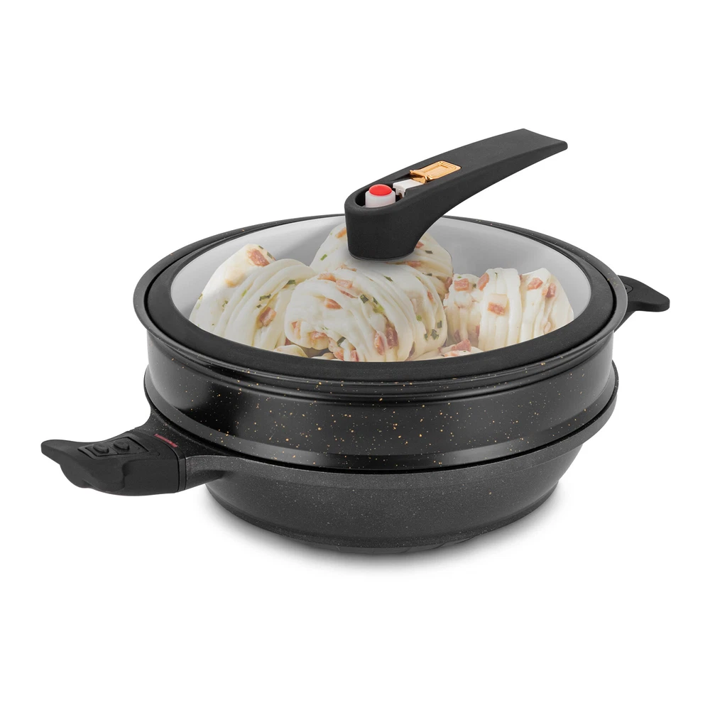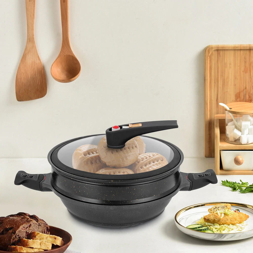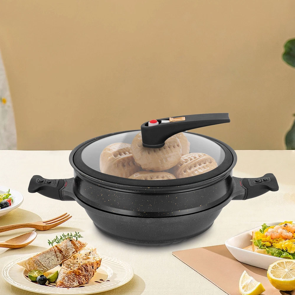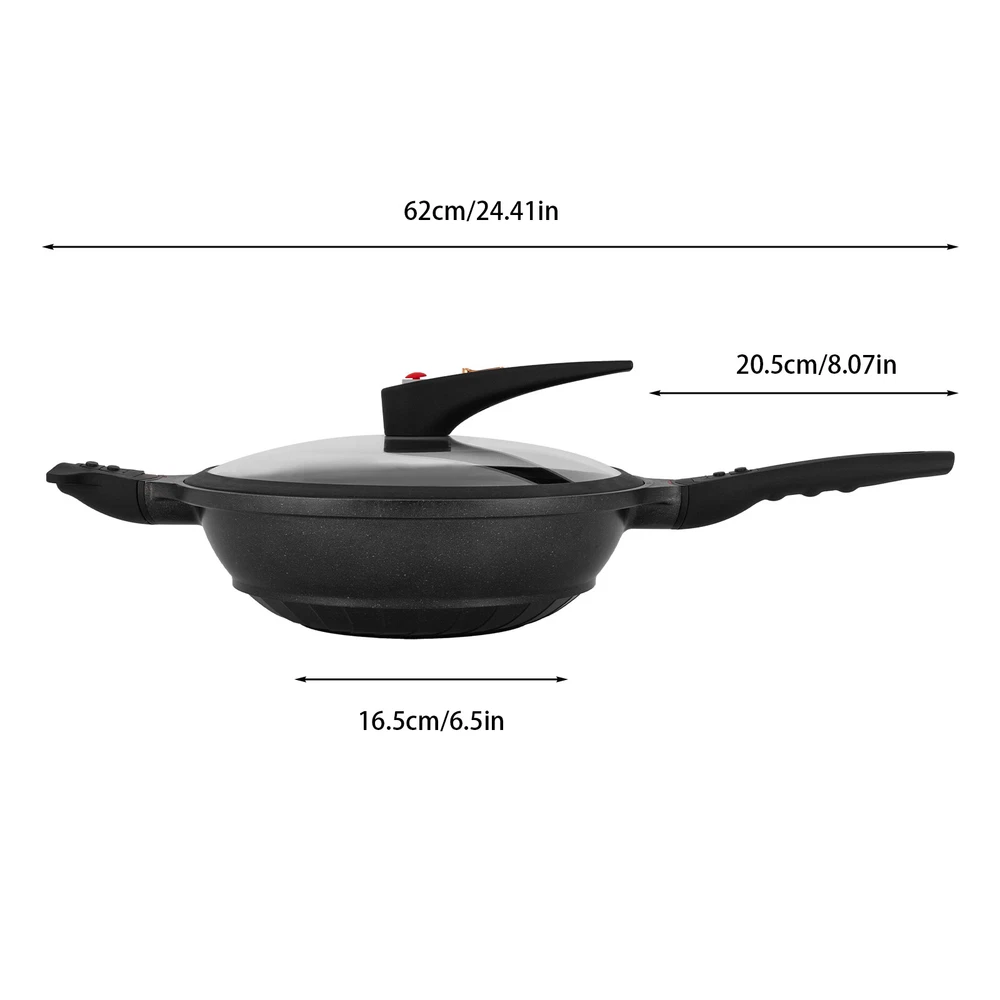 Specifications Material: Aluminum Alloy, Bakelite, Tempered Glass Process: Polishing, Sanding, Blasting, Coating Shape: Round Color: Black Style: Modern Assembly Required: Yes Machine Washable: No Applicable Number of People: 3-8 Maximum Temperature Resistance: 380°C/716°F Opening Diameter: 32cm/12.6in Pot Depth: 9.5cm/3.74in Overall Product Length: 62cm/24.41in Handle Length: 20.5cm/8.07in Bottom Diameter: 16.5cm/6.5in Gross Weight: 4.5kg/9.92lbs Net Weight: 4kg/8.82lbs Package Size: 44.5*35.5*23cm/17.52*13.98*9.06in Package Included 1*Frying Pan 1*Steamer Basket 1*Lid 1 Pair* Anti-scald Gloves Other Accessories for Installation WELCOME~ Description If you love cooking, you can try this micro-pressure frying pan. It is made of high-quality materials and adapts non-coating technology, which is not only smooth and easy to clean but also safe to use. The wok with a steamer basket allows you to cook and steam food at the same time for your convenience. The versatile modern design will add a touch of character to your home, so come and pick one up. Key Features Sturdy and Durable : High-quality aluminum alloy, bakelite , tempered glass, and polishing, sanding, blasting, and coating processes make the product strong, corrosion-proof , rust-proof , and long-lasting. Enjoy Delicious Food : The micro-pressure cooking technology locks in the moisture inside the pan during the braising process to keep the meat fresh, and you only need to use medium-low heat to finish cooking throughout the whole cooking process. The composite pan bottom heats up evenly, and the non-stick coating makes food less likely to stick to the pan, so you can heat your ingredients quickly and enjoy a delicious meal. Multifunctional Cooking : The pot can be used for frying, stir-frying, stewing, deep-frying, and boiling, equipped with a steamer basket that can steam buns, steamed buns, dumplings, etc. to meet your various cooking needs. You can also steam buns while boiling to save your time. Large Capacity : The 12.6" opening diameter and 3.74" depth provide you with plenty of cooking capacity for about 3-8 people, fully meeting your daily cooking needs for your family. User-friendly : The clear lid makes it easy for you to observe the cooking status of your food and reduces the frequency of opening the lid. The handle of the lid is also convenient for you to hold and use. Effortless Clean : A smooth surface, simple construction, non-stick technology, and detachable design make this product easy to clean. You can simply rinse it with water and detergent and dry it. Easy to Use: The long ergonomic handle allows you to toss the pan and stir fry as you please without burning your hands. You can also replace it with equipped double-ear handles for convenient boiling or stewing. Versatile Appearance : It adopts a classic black design that can match most decorating styles and color themes, suitable for most use scenarios. Ideal Gift : Thanks to its exquisite design and practical function, you can choose this product as a housewarming gift for your family or friends who like cooking. Details Pressure Relief Valve : It allows you to easily release pressure and open the lid. Anti-scald Gloves : Two anti-scald gloves can protect your hands from high-temperature burns and provide you with more convenience. Sealing Ring : It makes the connection of the lid and lid handle more tight, reducing air leakage and ensuring safe use. Application It is compatible with gas hob, induction hob, and ceramic hob and is safe to use at temperatures up to 716°F. It is suitable for stir-frying, steaming, stewing, and deep-frying at homes, restaurants, hotels, fast-food shops, and so on. Specifications Material: Aluminum Alloy, Bakelite , Tempered Glass Process: Polishing, Sanding, Blasting, Coating Shape: Round Color: Black Style: Modern Assembly Required: Yes Machine Washable: No Applicable Number of People: 3-8 Maximum Temperature Resistance : 380°C/716°F Opening Diameter: 32cm/12.6in Pot Depth: 9.5cm/3.74in Overall Product Length: 62cm/24.41in Handle Length: 20.5cm/8.07in Bottom Diameter: 16.5cm/6.5in Gross Weight: 4.5kg/9.92lbs Net Weight: 4kg/8.82lbs Package Size: 44.5*35.5*23cm/17.52*13.98*9.06in Package Included 1*Frying Pan 1*Steamer Basket 1*Lid 1 Pair* Anti-scald Gloves Other Accessories for Installation Notes Please note that this product does not contain any food. Air must be released from the valve before opening the lid after cooking to avoid overpressure. This product is not recommended to be washed in a dishwasher. When using it for the first time, please wash the pan with a neutral detergent first. After washing, you can coat the surface of the pan with oil to extend the life of the pan. It is recommended to use a silicone spatula or a wooden spatula and to use spatulas sparingly. Pour in the oil before turning on the heat, please do not dry cook in an empty pan. We recommend cooking over medium-low heat. Please cook shellfish ingredients with care. At the end of each cooking session, rinse the pan after it cools down naturally and then wipe it dry. Please allow the slight color difference caused by the shooting light and the 1-3 cm error due to manual measurement, and make sure you do not mind before ordering. Payment Delivery details Terms of sales About us Contact us Payment We accept ebay payment 。 Fees such as import duties, taxes are not included in the item price or shipping costs. These charges are the buyer's responsibility. Delivery details Shipping: 2-9 working days to: USA Terms of sales We maintain high standards of excellence and strive for hundred percent customer satisfaction. Feedback is very important to us. We hope that you contact us immediately before you give neutral or negative feedback, so that we can address your concerns. It is impossible to address issues if we do not know about them! About us Your satis faction is our ultimate goal. We work hard to earn your trust and future business. Our certified tec