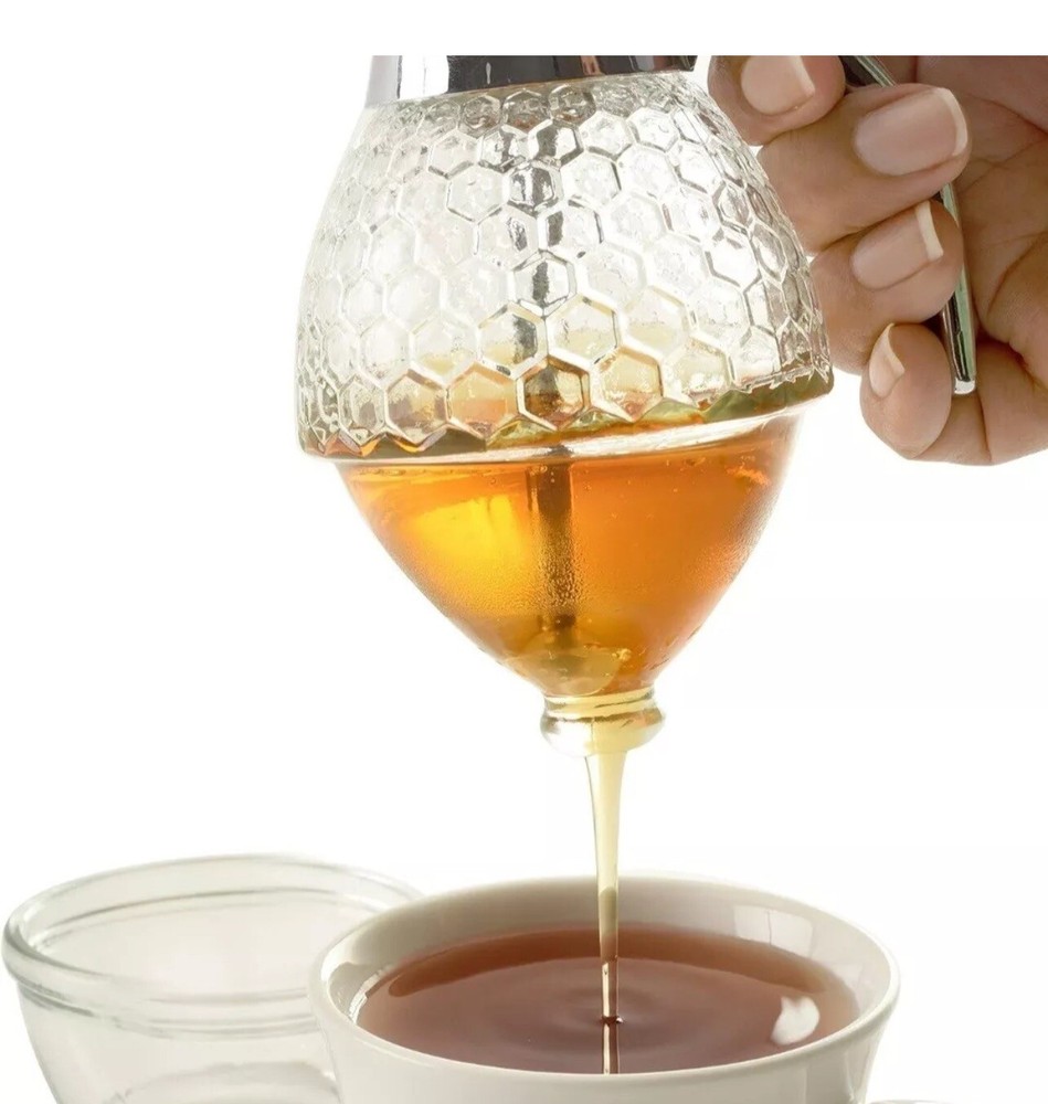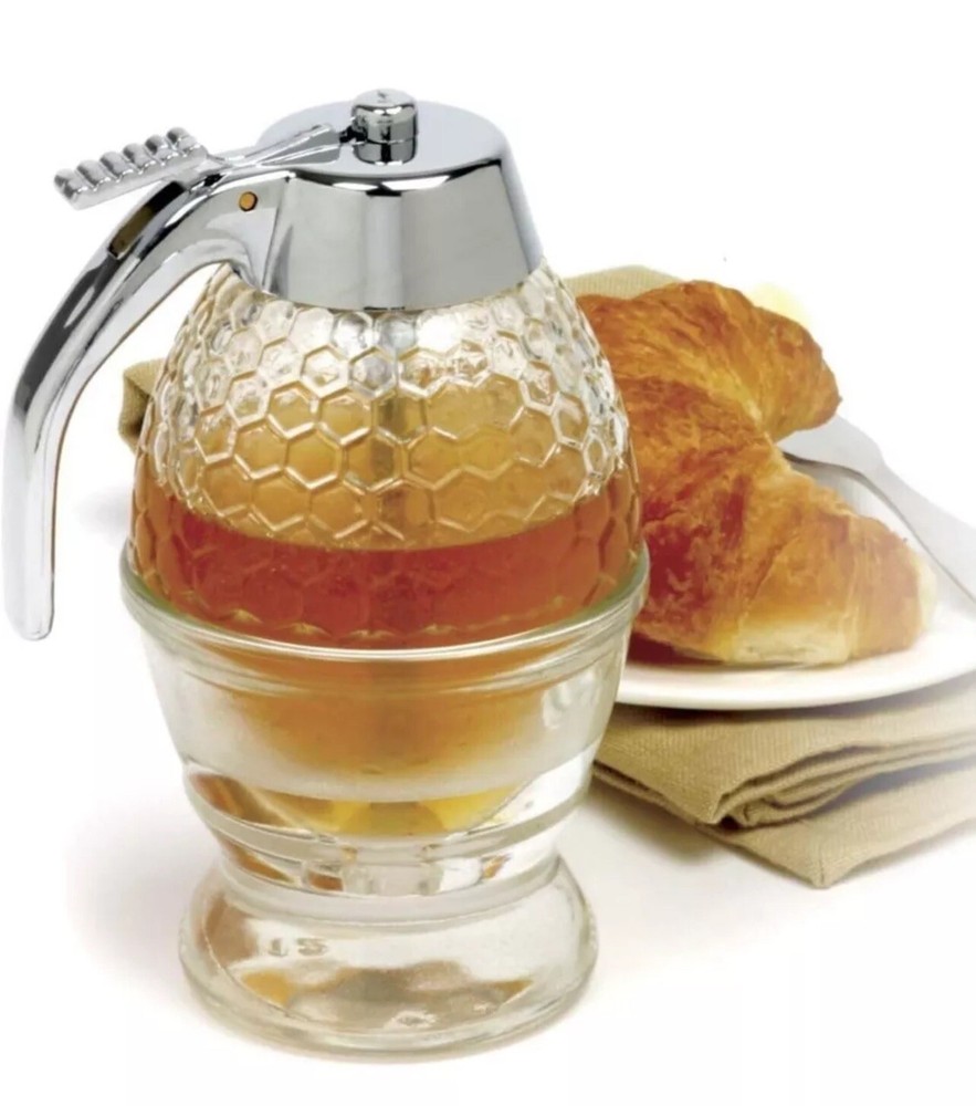 This Norpro Premium dispenser pot/jar is perfect for storing and dispensing honey syrup or other beverages. The clear glass material and bee hive pattern add a touch of elegance to any kitchen or dining area. Measuring 4.5 inches in length, 3.5 inches in width, and 6 inches in height, this unit is compact and easy to use. The dispenser pot/jar is manufactured in Taiwan and comes with an 8 ounce cap. It is a great addition to any kitchen tools and gadgets collection. Personalization is not available for this item. Get your hands on this high-quality Norpro Premium dispenser pot/jar today!