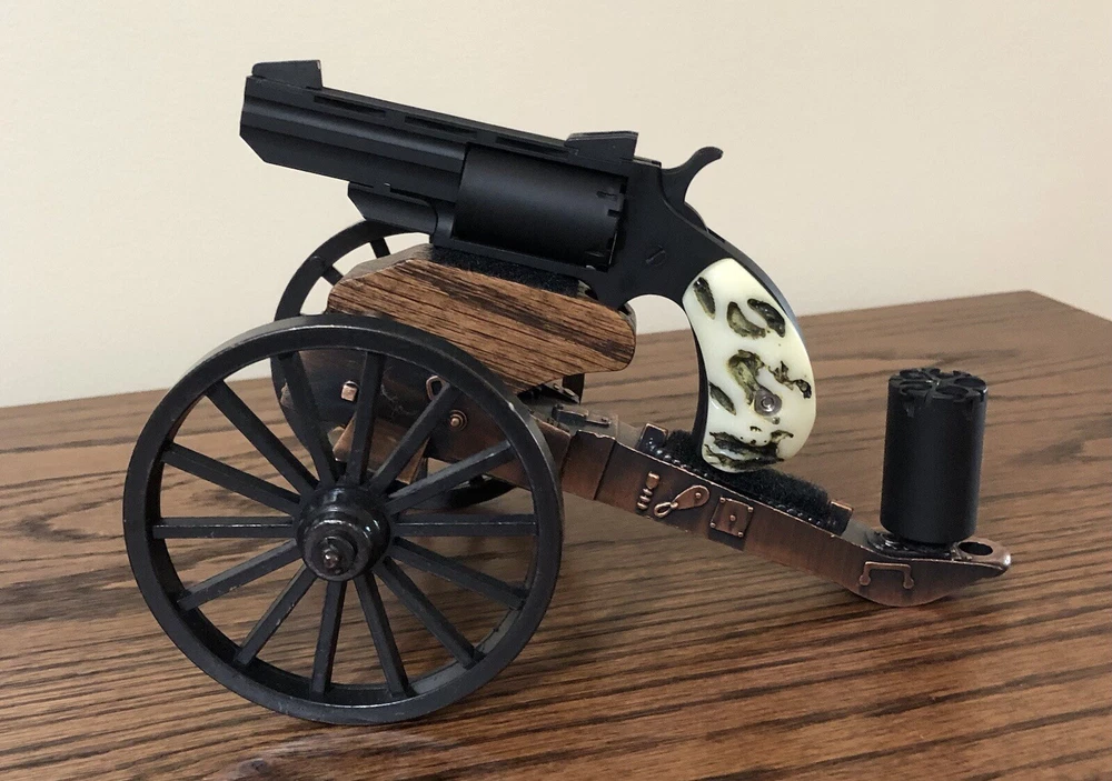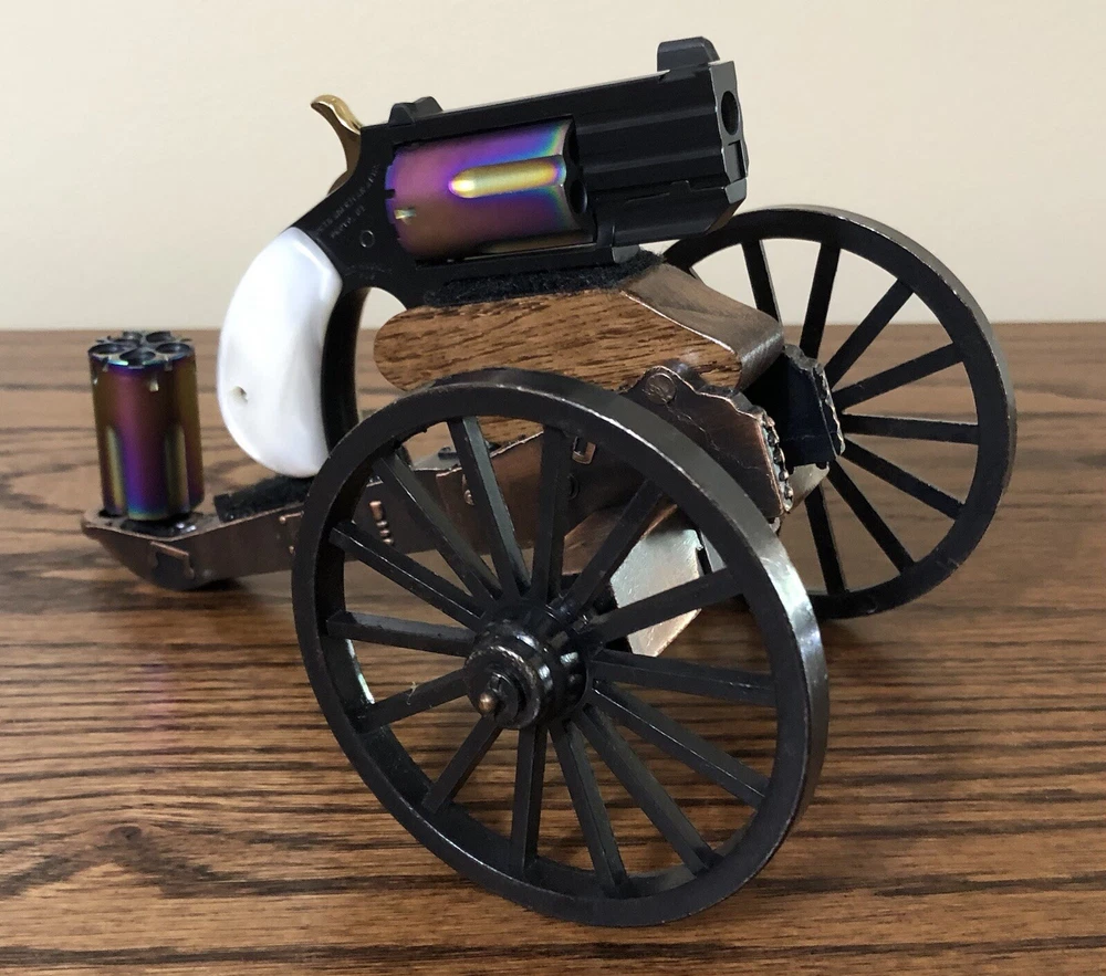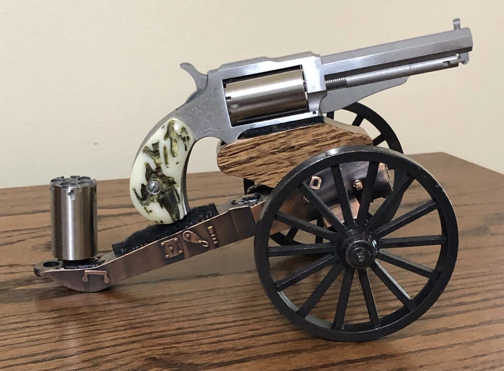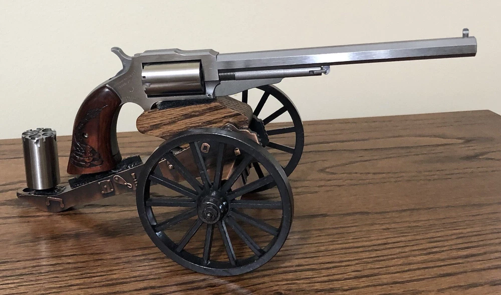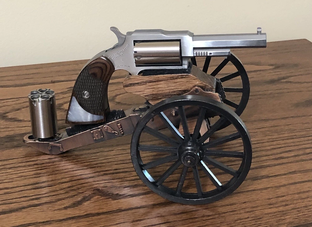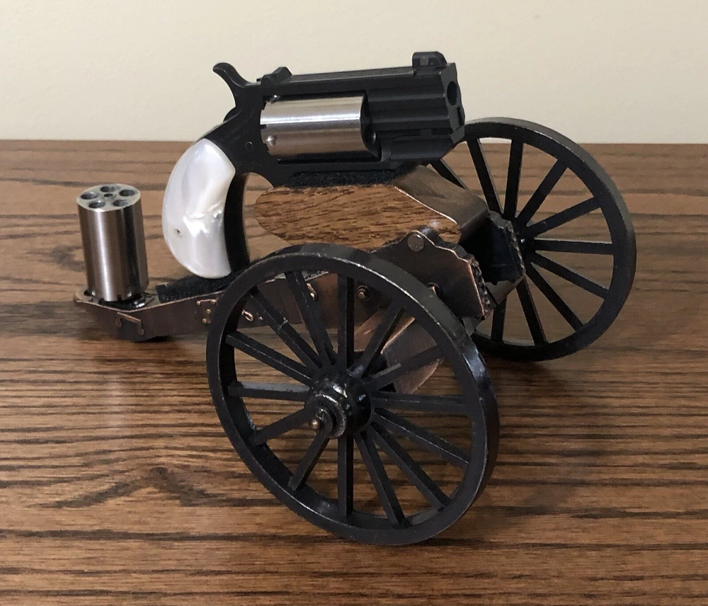 This handsome and quality made stand is a unique and creative way of displaying your favorite North American Arms. Makes your derringer look like a miniature version of a 19th century artillery cannon. Solid metal frame with metal wheels. This stand fits all 22 magnum frames. There is an adjustment screw underneath the oak mounting block for adjusting the mounting block to accommodate different grip sizes. Stand come with extra cylinder storage. Our customer love our stands. We also make hand cannon display stands for NAA 22 LR Frames, Bond Arms, Cowboy 6 shot revolvers, 1911s, Walther PPK and PPK/S and Kimber micro 380. See our other listings or feel free to contact us for more information. Thank you. FIREARM NOT INCLUDED
