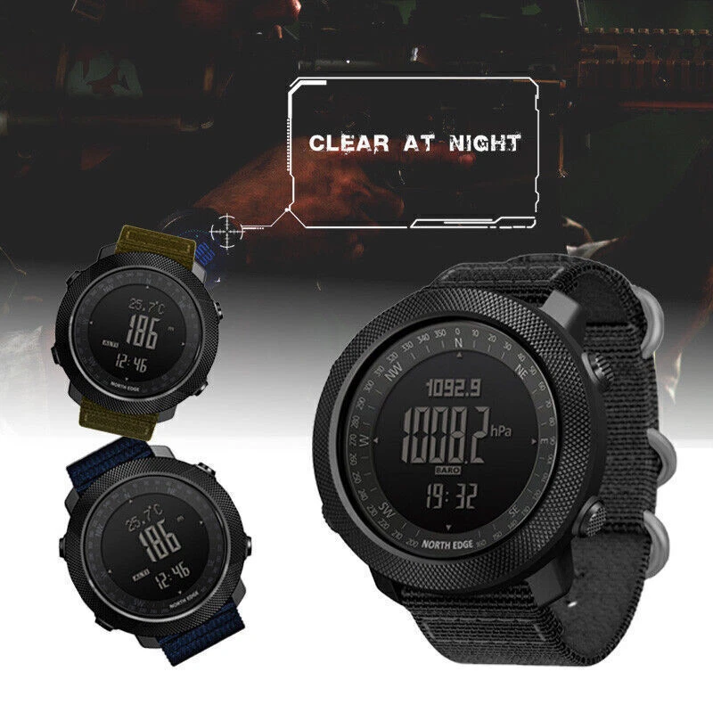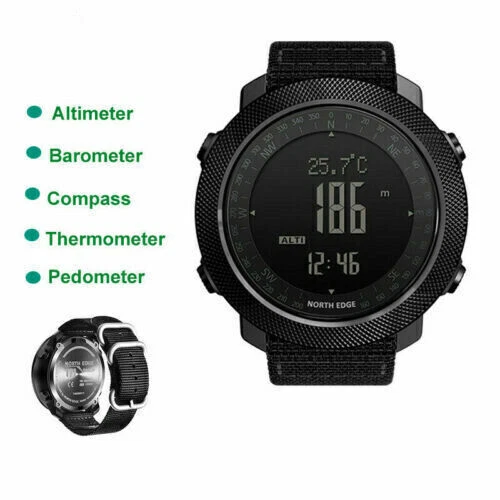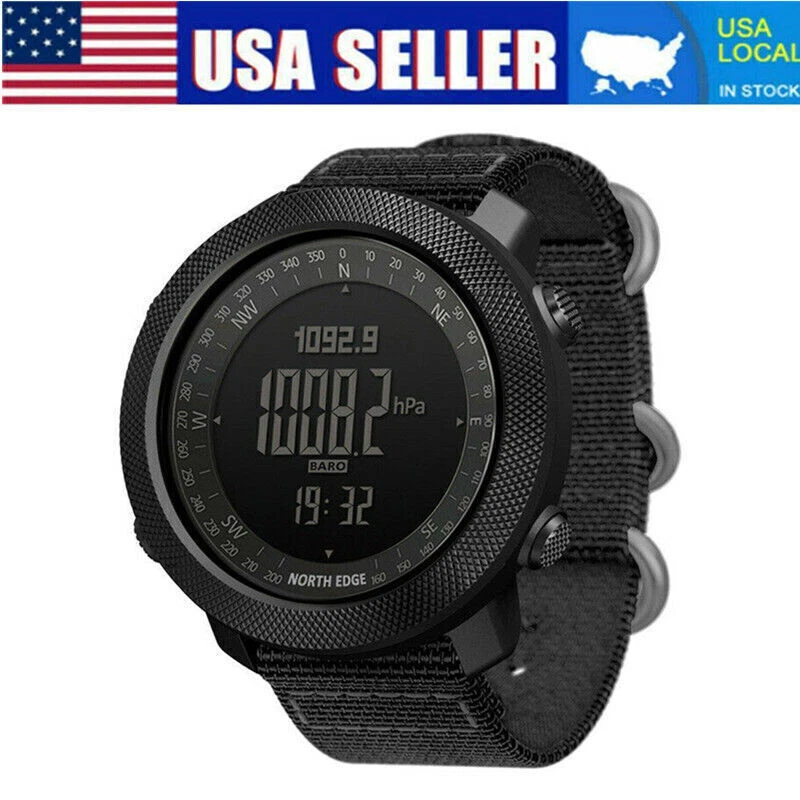 Description: North Edge Apache 3 Smart Military Sport Digital Barometer Barometer Watch Men A Characteristic: 1. It is waterproof in depth, up to 50 meters deep. It can accompany you to swim in the water world and give you advice on time in different places 2. High strength outdoor use function, making you not confused outdoors 3. The product is designed with compass and backlight, and the light is weak, which can soothe the soul 4. When there is no direction, it can accompany you out of difficulties and around Function: 1. Altimeter (altitude trend chart and rising speed) 2. Barometer 3. Compass 4. Thermometer 5. Weather forecast, world time 6. Pedometer, calories, distance recording 7. Time function: hour, minute, second, year (2000-2099), month, day, week 8. Alarm clock (2 alarm clocks) 9. Countdown (99:59:59~0) 10. Stopwatch (0~: 59:59), 12. Second time function 13. Compass, altimeter, barometer, thermometer, barometric trend, altitude trend and altitude trend 14. Button tone on or off 15. Battery life reminder 16, EL backlight Wearing mode: wrist strap Communication function: not supported Battery model: CR2032 Operation mode: button type Product size: 46 * 46 * 14mm Net weight of product: about 95g Screen resolution: 240 * 240 Wrist strap material: nylon Band width: 22mm Function: waterproof 50m Band size: about 26cm Endurance: 21 days and above Color classification: black Screen type: IPS Product List: Watch * 1 Instructions * 1 Payment: We accept PayPal ONLY currently. Please make sure you have a valid/confirmed PayPal account prior buying. Item will be shipped within 1-5 business days as soon as the payment verified. We ship to PayPal registered address, please make sure your address in PayPal was matched with your current location. Shipping: Shipping Estimated Delivery Time 1.Economy(without tracking): 11-35 working days 2.SpeedPAK(with tracking): 8-12 working days 3.EMS(with tracking): 7-10 working days, need to pay extra shipping cost 4.DHL(with tracking): less than 7 working days, need to pay extra shipping cost For faraway region or countries, the transit time may be longer than Overall Transit Time Frame. Notes, the delivery time may vary due to public holidays, natural disasters, customs issue and other unexpected impact, etc. Feedback: Please leave us a Positive Feedback if there is nothing wrong with the item, we will appreciate it and do the same for you.