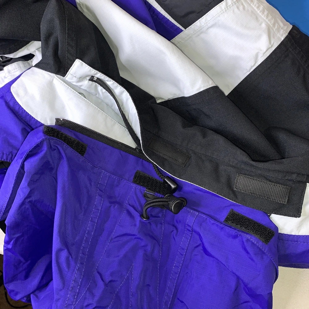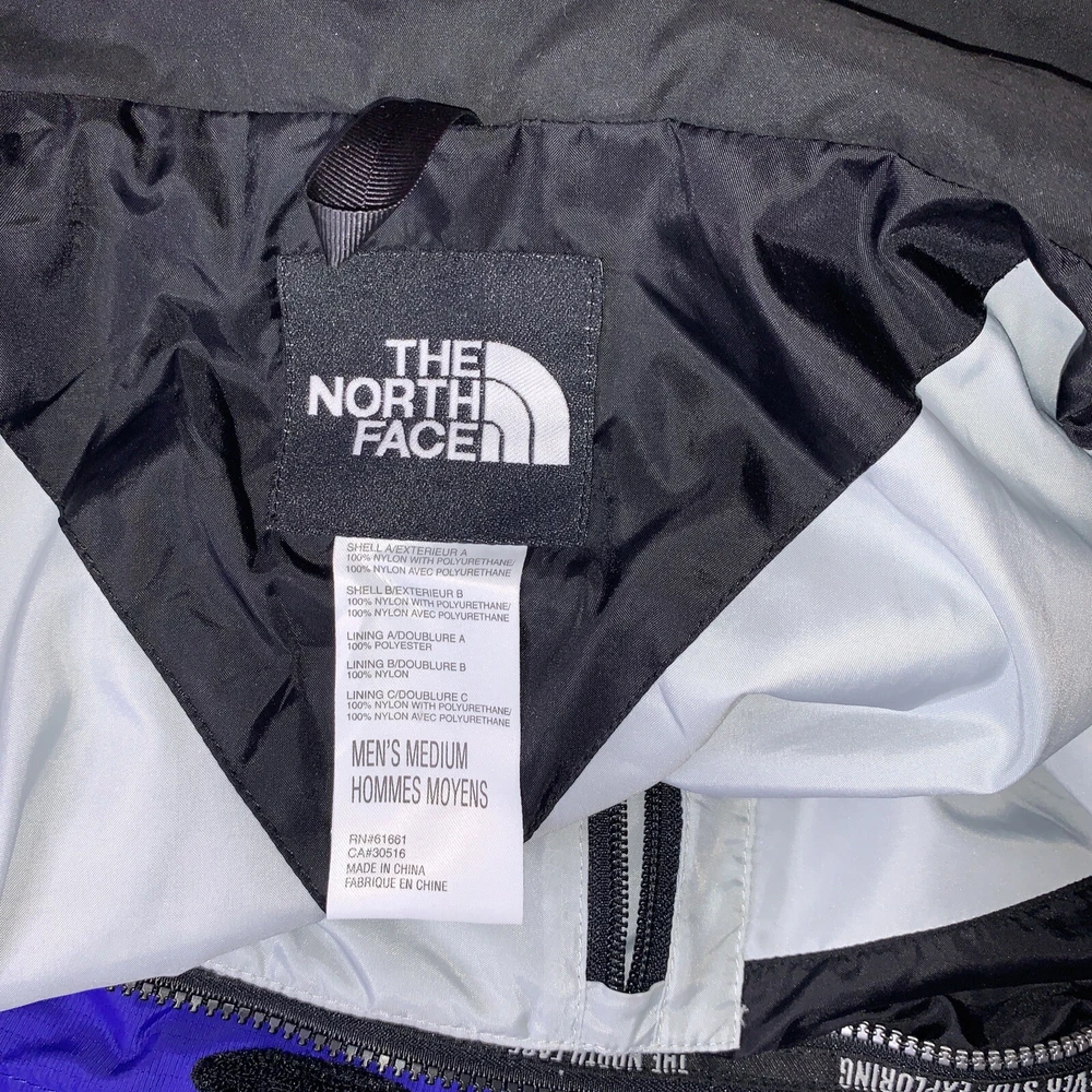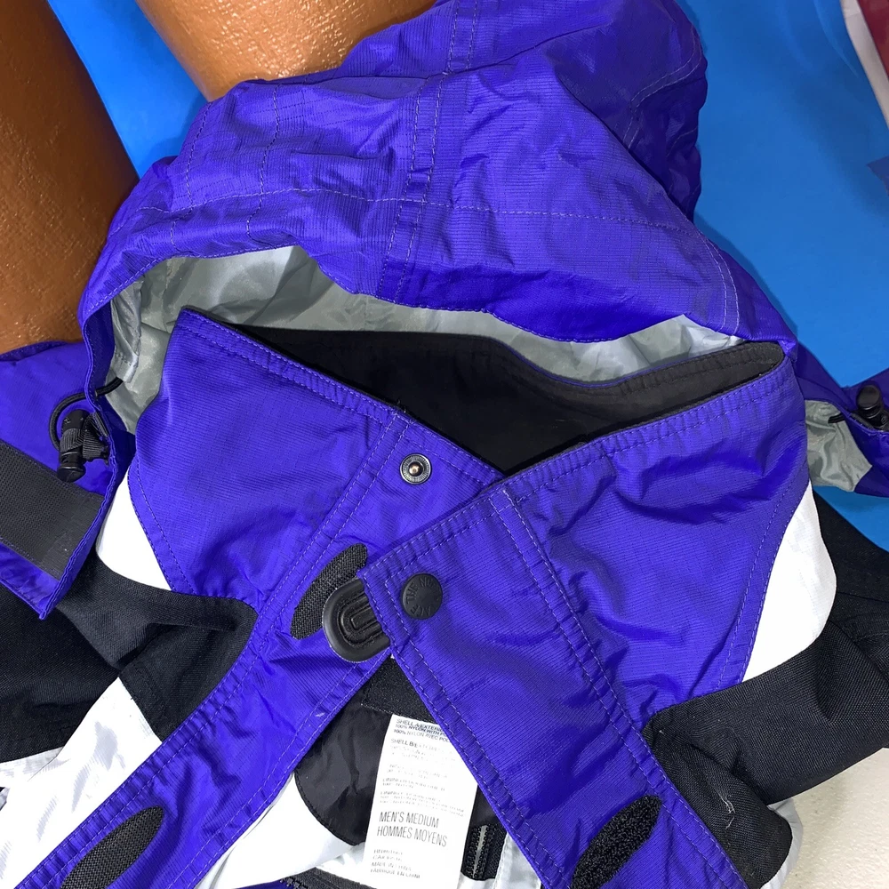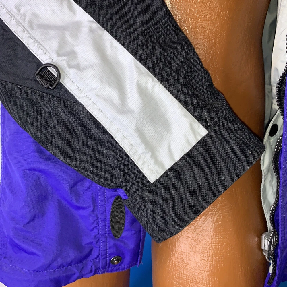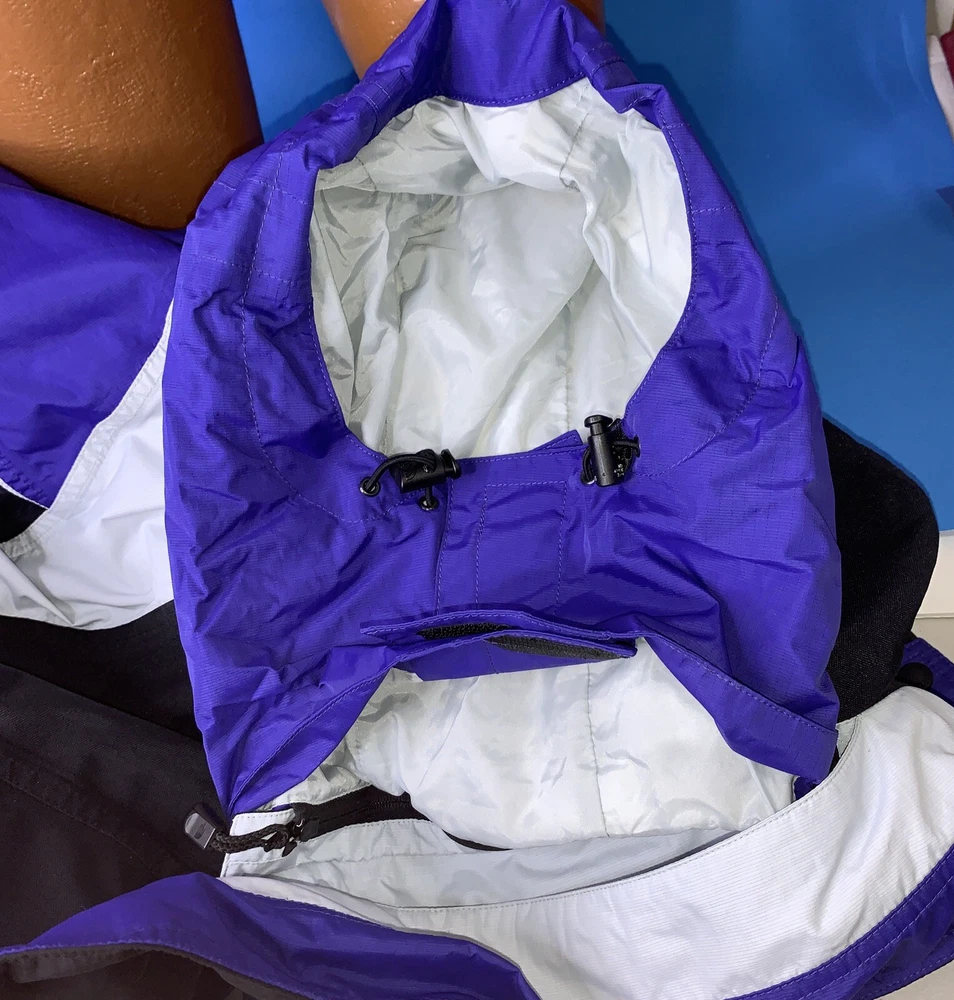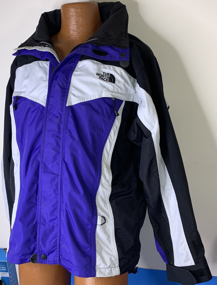 The North Face Jacket Medium Winter Ski Outer Shell Jacket Black Silver Purple Nice heavy outer shell, no inner (zippered) liner is included. (w.o liner, weighs over 2 lbs) The model and complimentary inner detachable liner info is unknown. Pre-owned. Shell only, the inner removable liner is not included. Nice condition, with working zippers, hook and loop, pulls. The zippered, detachable hood with hook and loop is included. See photos. The inner waist elastic, buttons and hook and loop all in great condition. The zippered, upper front chest is vented and good. The 2 outer zipper pockets are good.The 2 inner upper pockets are good.