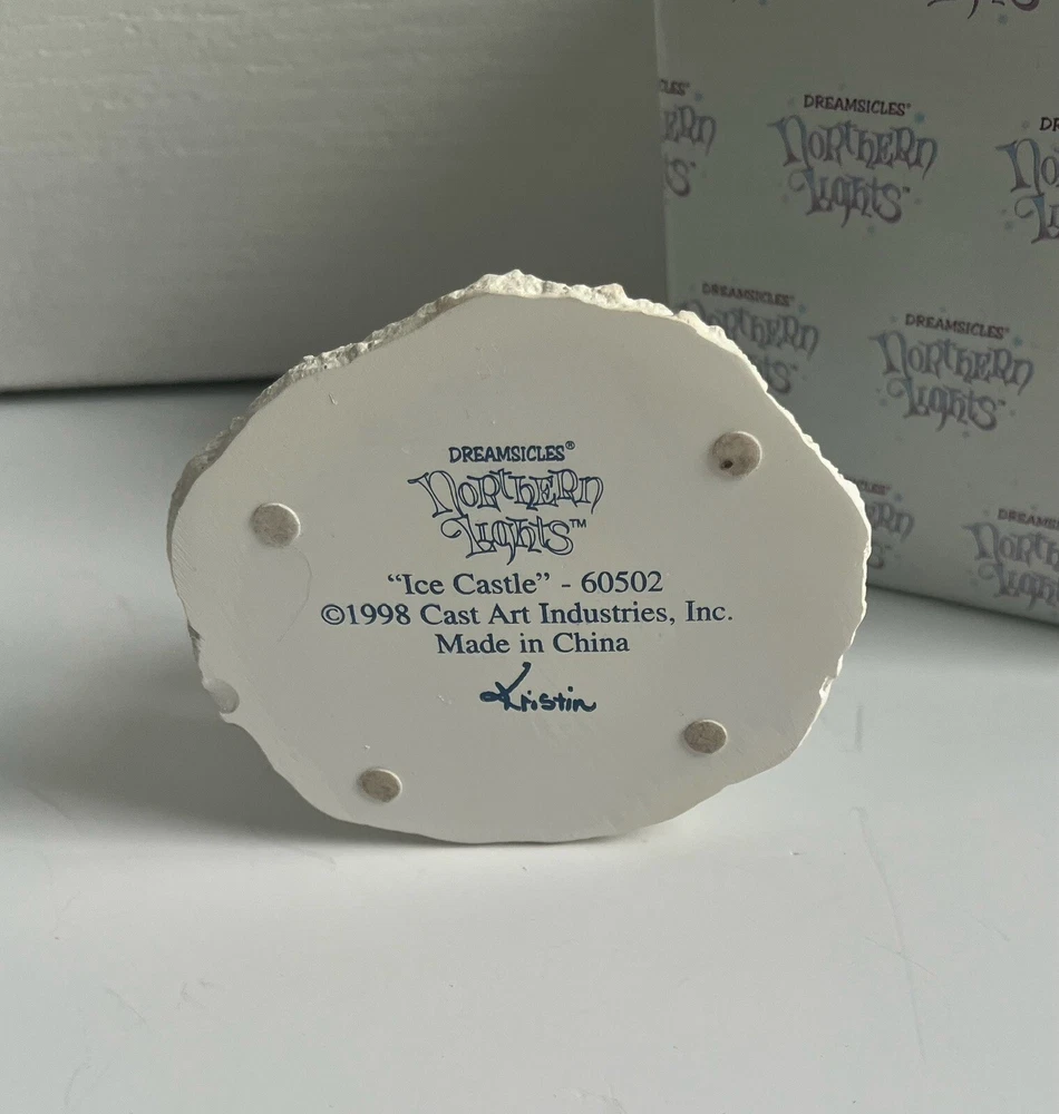 This stunning Dreamsicles sculpture by Kristin is a must-have for any collector of seasonal and decorative items. The ice castle, featuring intricate blue details, was manufactured in China in 1998 and is a beautiful addition to any display. The subject of the sculpture is an ice castle, and it is sure to bring a touch of whimsy to any room. This item falls under the categories of Collectibles, Decorative Collectibles, and Sculptures & Figurines. Don't miss out on the opportunity to add this unique piece to your collection.