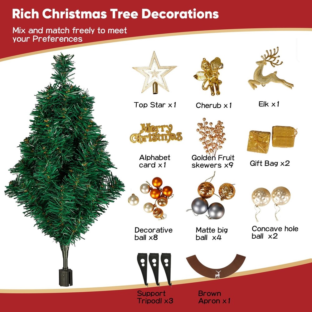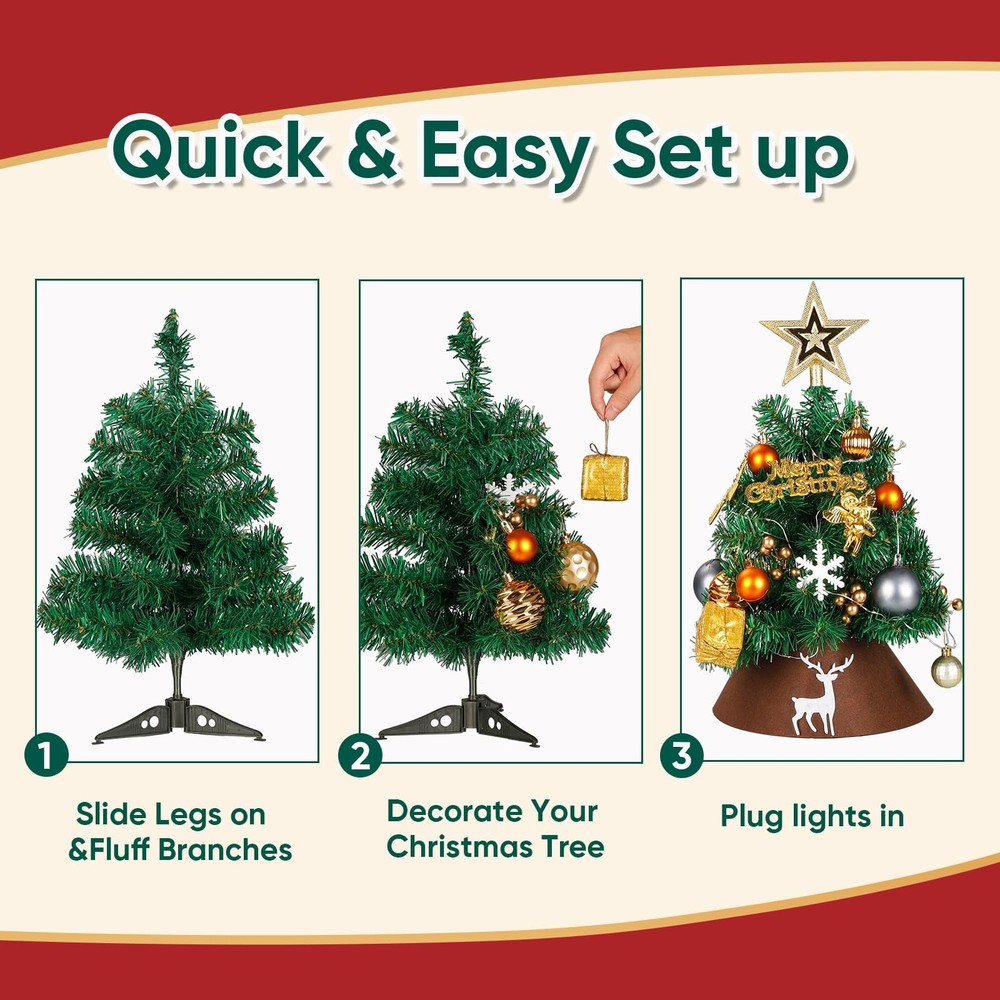 24 Inch Tabletop Christmas Tree, Artificial Mini Xmas Pine Tree with 30 LED String Lights,Small Xmas Star Tree for Christmas Decor Perfect Tabletop Size – 60 cm / 23.6 in tall with 75 branch tips across 8 graduated tiers plus a crowning top branch; slim 35 cm / 13.8 in Ø footprint fits desks, mantels, dorms and entryways. Heavy-Duty Construction – built on a 7.8 mm thick steel pole for upright stability season after season; flame-retardant PVC needles offer lifelike color and zero shedding. Deluxe Ornament Kit – arrives complete with 1.6 m grey-kraft ribbon, 15 cm tree-top star, 14.5 cm gold “Merry Christmas” plaque, white deer head, golden reindeer & angel, 5 white snowflakes, 2 gift boxes, 9 golden berry picks, 21 mixed-matte & shiny baubles (6 cm & 4 cm), mini burlap sack and a 3 m 30-LED warm-white battery string. Tool-Free Setup & Storage – hinged branches drop into place in minutes; everything tucks back into the reusable box for compact off-season storage. Safe & Versatile Décor – UL-certified light set, low-heat LEDs and sturdy metal base make it ideal for indoor or covered-porch use; a charming gift or centerpiece for Christmas, weddings and winter parties.