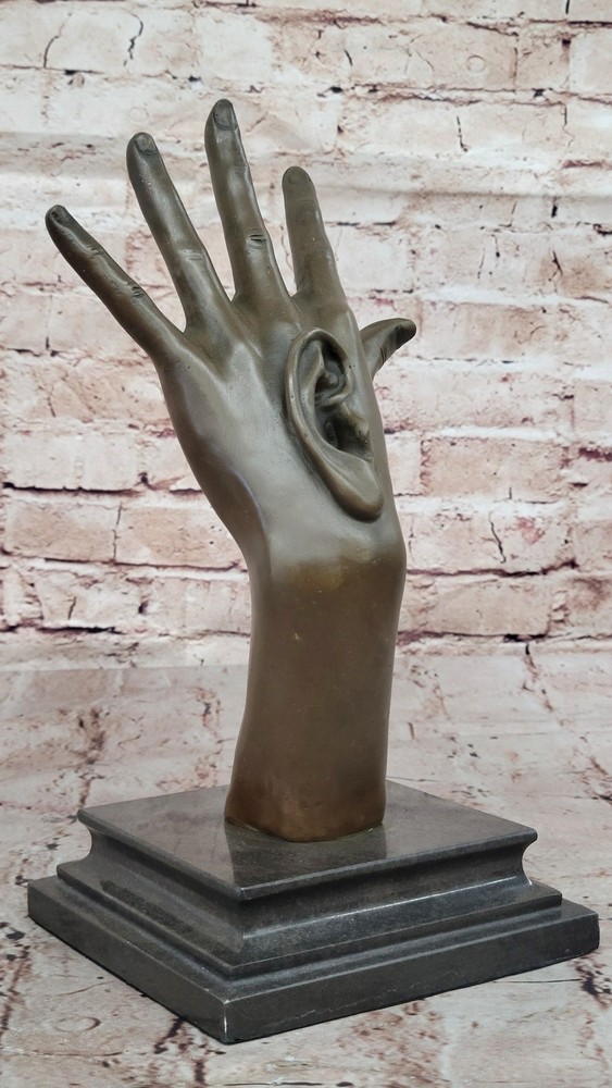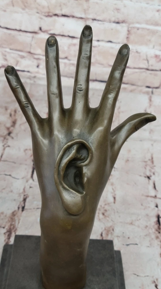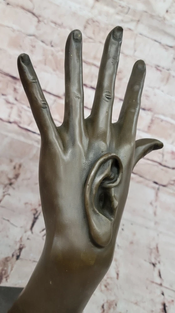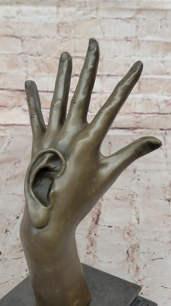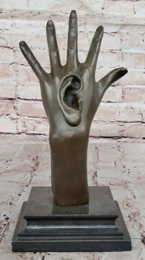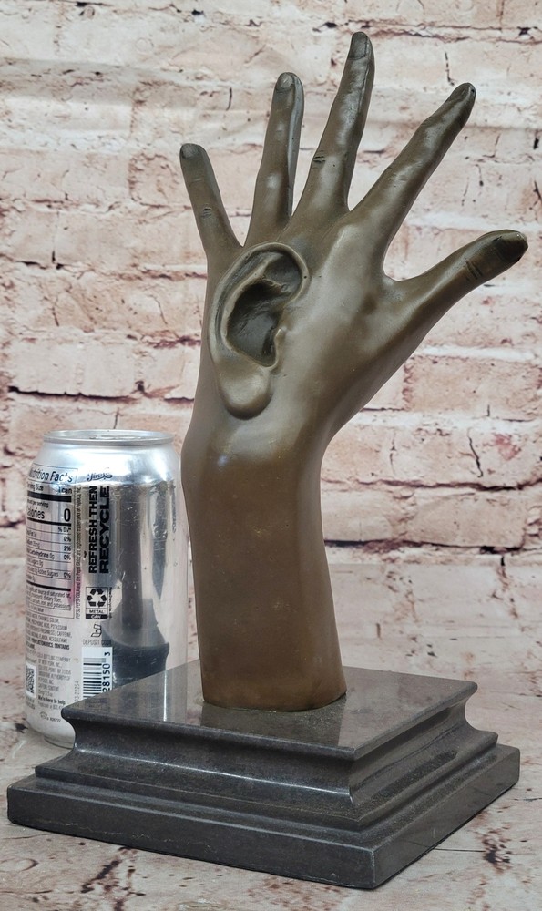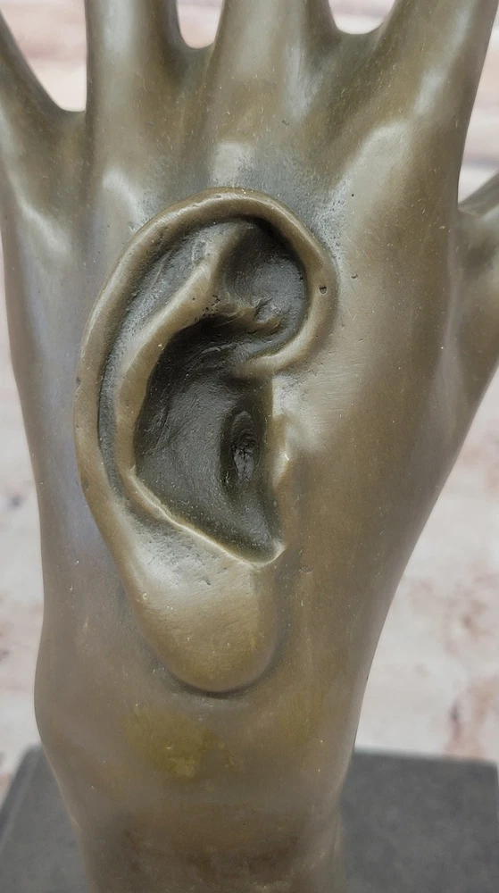 Condition : This sculpture is in perfect condition. Bronze Dimensions with Marble Base: Height 13" X Width 5" Marble Dimensions: 5" X 5" Height without base:9" Weight:9 LBS Inventory:28DS3464282 This work of art is fantastic down to the last intricate detail. Every line is crafted to perfection, from the fingers to the fingernails and the subtle hand cuts. What makes this sculpture truly unique is the ear sticking out of the statue's hand, adding an intriguing and unconventional element to the piece. The figurine was cast using the ancient "Old Lost Method" and is stained with a brown patina finish to ensure its preservation. It is 100% handmade and 100% bronze, showcasing the artist's dedication to quality and traditional craftsmanship. Mounted atop a black marble base, this sculpture is a striking and one-of-a-kind addition to any art collection. Its meticulous detailing and unusual design make it a captivating and conversation-starting piece, reflecting both artistic skill and creative vision. Surreal Bronze Sculpture Hand w/ Ear Statue Modern Art Abstract Signed Original 13\" x 5\" DS-346 Video will open in a new window Using the eBay App? Paste link into a browser window: [isdntekvideo]