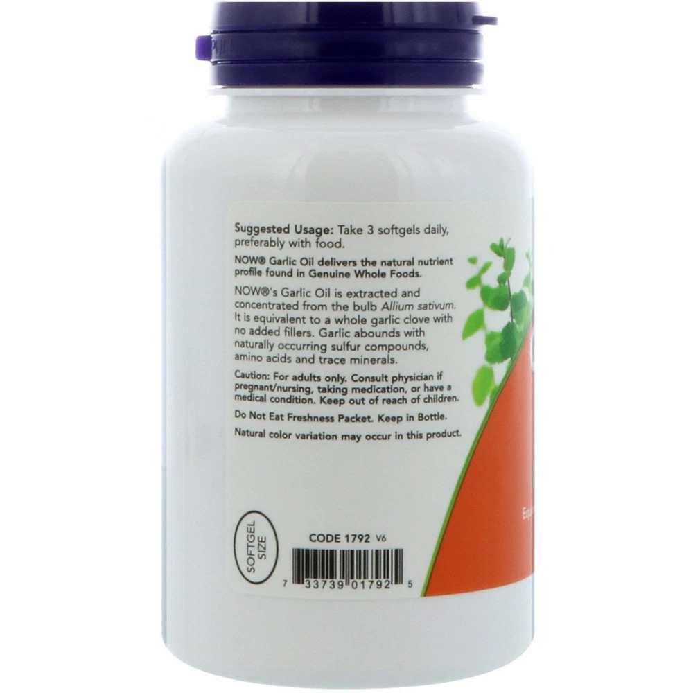1,500 mg Herbal Supplement Equivalent to Whole Clove Garlic A Dietary Supplement Botanicals/Herbs Family Owned Since 1968 GMP Quality Assured NOW® Garlic Oil delivers the natural nutrient profile found in Genuine Whole Foods. NOW's® Garlic Oil is extracted and concentrated from the bulb Allium sativum. It is equivalent to a whole garlic clove with no added fillers. Garlic abounds with naturally occurring sulfur compounds, amino acids and trace minerals. Our eBay Store About Us Contact Us Add to Favorite Sellers Supplement Facts Serving Size: 3 Softgels Servings Per Container: 83 Amount Per Serving % Daily Value Garlic Oil Concentrate (Allium sativum) (Bulb) (Equivalent to 4,500 mg of Whole Clove Garlic) 9 mg * * Daily Value not established. Expiration Date: 08/01/2027 Disclaimer: Our receiving department does its best to verify and then enter the correct expiration dates for all incoming products. However, discrepancies do occur from time to time. This being said, the exceptionally high turnover at iHerb ensures that our inventory is among the freshest in the industry. NOW Foods, Garlic Oil, 1,500 mg, 250 Softgels DESCRIPTION: 1,500 mg Herbal Supplement Equivalent to Whole Clove Garlic A Dietary Supplement Botanicals/Herbs Family Owned Since 1968 GMP Quality Assured NOW® Garlic Oil delivers the natural nutrient profile found in Genuine Whole Foods. NOW's® Garlic Oil is extracted and concentrated from the bulb Allium sativum. It is equivalent to a whole garlic clove with no added fillers. Garlic abounds with naturally occurring sulfur compounds, amino acids and trace minerals. SUGGESTED USE: Take 3 softgels daily, preferably with food. INGREDIENTS: Soybean oil and softgel capsule (gelatin, glycerin, water). Not manufactured with yeast, wheat, gluten, milk, egg, fish or shellfish ingredients. Produced in a GMP facility that processes other ingredients containing these allergens. WARNINGS: Caution: For adults only. Consult physician if pregnant/nursing, taking medication, or have a medical condition. Keep out of reach of children. Do not eat freshness packet. Keep in bottle. Natural color variation may occur in this product. Store in a cool, dry place after opening.