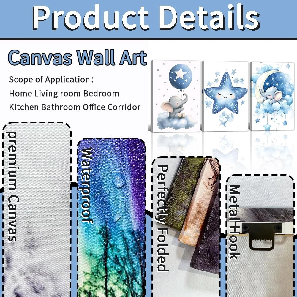 Cute animal canvas wall art is one of the modern decoration methods, which shows your unique artistic taste, breaks the monotony of the wall and gives new life to the space Wide Use: Nursery wall art is suitable for the space decoration of living room, bedroom, bathroom, restaurant, corridor, apartment, hotel, office, spa, lounge and other different places. Nursery elephant canvas wall art painting is unique, which can not only add personality and charm to the space, but also enhance the decorative effect of the room and make the space more beautiful Points for Attention:Please note that the displayed pictures are for reference only and do not represent the actual exhibition hall setting or actual product size. Please be sure to accurately measure the wall size to ensure that you buy the right size Warm Prompt:Because different monitor brands may have chromatic aberration, the product color may be slightly different from the picture display Quality Service:If you have any questions about our products, please feel free to contact us and we will reply you within 24 hours. Please feel free to buy Advantages: Nursery canvas wall art paintings bring you a pleasant visual experience with unique colors and patterns. They not only relax you, but also cultivate your aesthetics, enhance your artistic accomplishment, and enrich your life during the appreciation process High Quality: Using HD printing technology, the image is printed on high-quality canvas, creating exquisite nursery animal canvas wall art for you. The image is clear, with vibrant colors and rich detail. The texture of canvas is fine, waterproof and easy to clean Easy to Hang: We have fixed the canvas on the high-quality solid wood frame, and equipped with a metal hook that can be hung, so that you can easily hang it immediately after receiving the cute elephant painting prints, adding artistic charm to your space Perfect Gift: Elephant canvas wall prints are not only great as gifts for your family on Christmas, New Year, weddings, birthdays, anniversaries, Thanksgiving, Mother's Day, Father's Day, Valentine's Day and other holidays. It is also a unique gift to express friendship to friends, business partners, and lovers Service: We are committed to customer satisfaction. If you have any questions about the products, please feel free to contact us. We promise to help you within 24 hours, Please feel free to buy