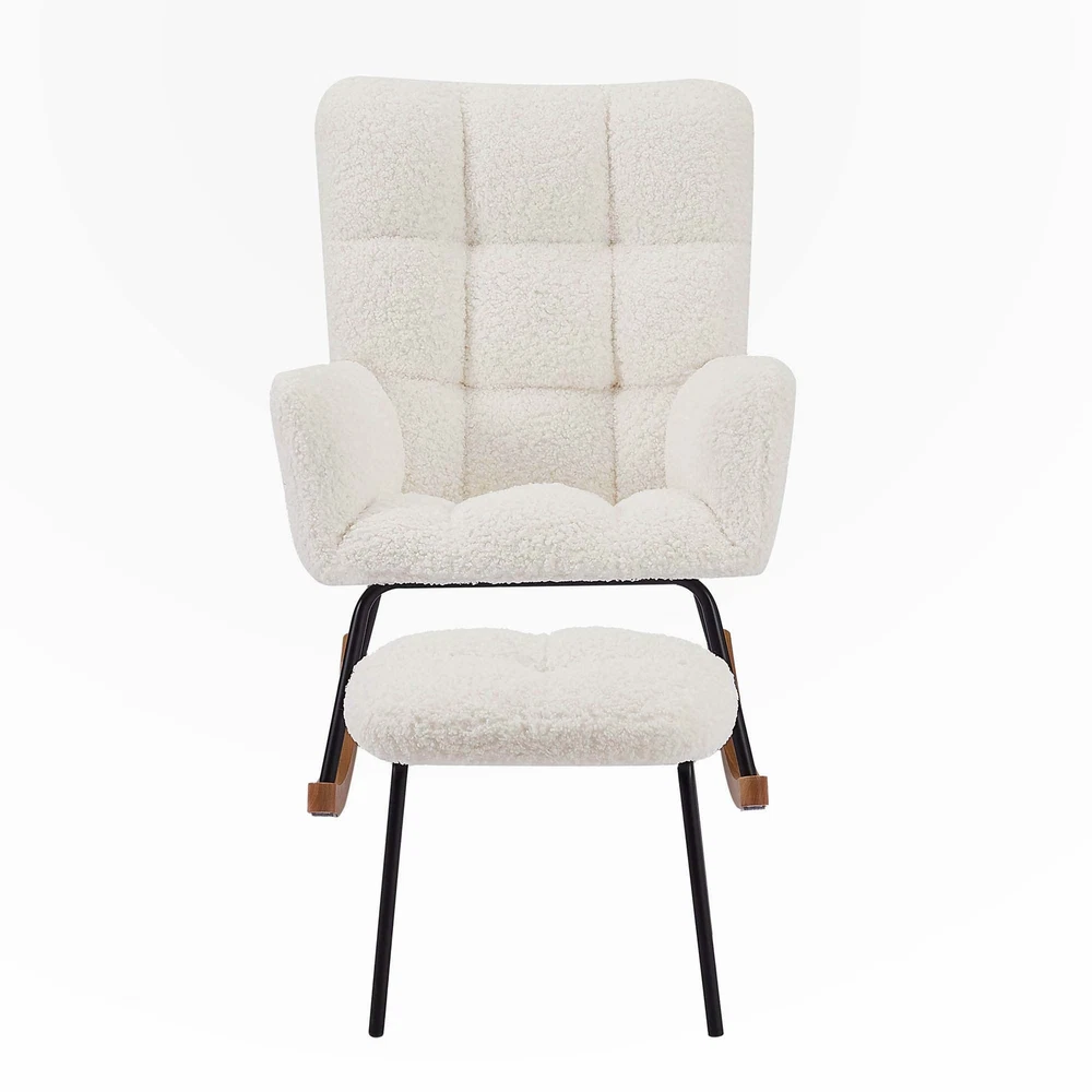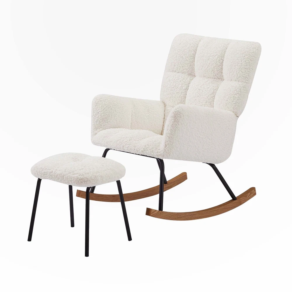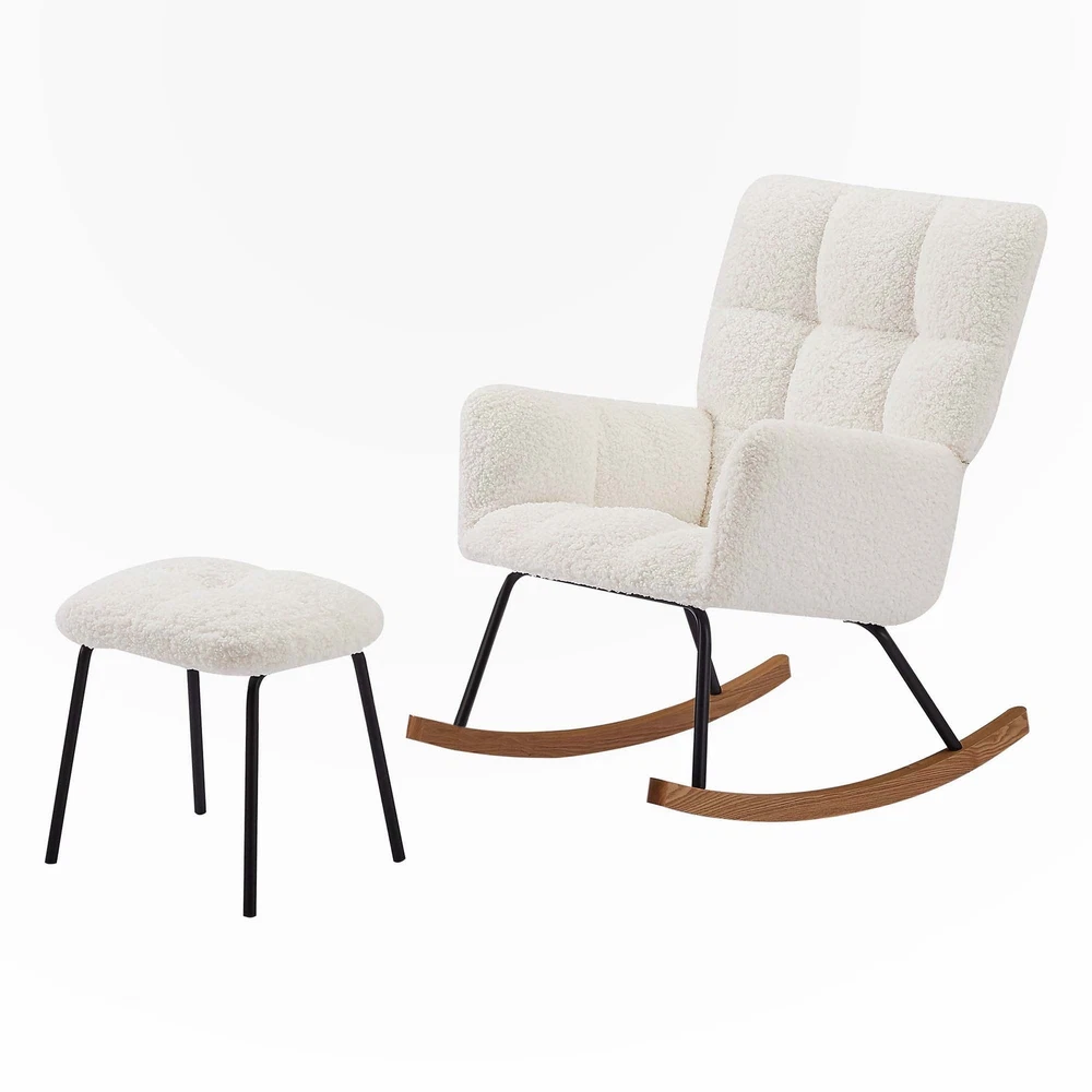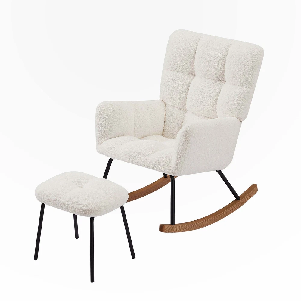 Nursery Rocking Chair Armchair for Mom and Baby Modern Glider Chair with Soft Seat and High BackrestERGONOMIC DESIGN - The tilt angle of the backrest of this rocking chair is designed with an ergonomic curve, and the high backrest provides perfect support for the back. Including the armrests of the chair, providing great comfort. Lying on the rocking chair and shaking, we can feel a lot of relaxation.EASY ASSMBLE - Assembling this rocking arm chair is not difficult. This rocking chair can be easily assembled by following the clear instructions.SUPERB QUALITY - The seats are made of soft and skin boucle, which is durable and not easily deformed.STURDY and STABLE - The rocking chair is made of a mix of metal and solid wood, which provides reliable and stable support. During nap time, gently Free Shipping Over $49.99* Details Nursery Rocking Chair Armchair for Living Room Product Description: Nursery Rocking Chair Armchair for Mom and Baby Modern Glider Chair with Soft Seat and High BackrestERGONOMIC DESIGN - The tilt angle of the backrest of this rocking chair is designed with an ergonomic curve, and the high backrest provides perfect support for the back. Including the armrests of the chair, providing great comfort. Lying on the rocking chair and shaking, we can feel a lot of relaxation.EASY ASSMBLE - Assembling this rocking arm chair is not difficult. This rocking chair can be easily assembled by following the clear instructions.SUPERB QUALITY - The seats are made of soft and skin boucle, which is durable and not easily deformed.STURDY and STABLE - The rocking chair is made of a mix of metal and solid wood, which provides reliable and stable support. During nap time, gently shake the baby to fall asleep.Ergonomic glider and footrest setErgonomic glider and footrest setWith high back,wide armrest and seat,What is more,the ottoman provides an ideal place to hold your legs, reliving back and hip pressure and relaxing your feet.Upholstered rocking chairUpholstered recliner ensures ideal balance and smooth movement,not only suitable for the elderly to sit on the rocking chair to read the newspaper or watch TV, but also very suitable for mom to sit on the gliding recliner to put the child to sleep.Product FeaturesRocking ChairRocking chair with pedalArmchair for Living Room Bedroom Balcony OfficesModern Glider Chair with Soft Seat and High BackrestPackage size:28.35*28.38*14.57inchProduct FeaturesStyleModernRoom TypeBedroom, Living Room, NurseryArm StyleWith armsForm FactorErgonomic,Modern,Rocking,TiltCountry of OriginChinaMain MaterialBoucle+metal + solid woodNotes1.Size Notice:Manual measurement has been used, there may be some reasonable errort, thanks for your understanding.2.Color Notice:Due to factors such as display equipment and shooting environment, the color of the item may be slightly different from the picture, which is a normal phenomenon, please refer to the actual item3.Assembly Notice:Please read assemble manual in advance. Please do not over-tighten nuts, as this may cause distortion or breakage.4.It is recommended to put a layer of foam or soft cushion on the floor when installing to avoid scratching the floor.5.If the item has any defects, damage or missing parts, please contact us with pictures or videos so that we can understand your needs and help you quickly, and always remember to retain its original packaging to ensure any return requests. We will try our best to solve any problems you may have.6.If you receive the wrong product, please attach the product picture, the infographic of the outer package and the picture containing SKUs, so that we can verify and quickly deal with it for youKeep it looking its best1.Fabric furniture Care;Dust regularly. Clean gently with a clean, slightly damp cloth. Professional cleaning is recommended.2.Wood Furniture Care:We recommend dusting frequently with a clean, soft, dry, lint-free cloth. Clean the surface by rubbing in the direction of the grain and wipe dry.3.Avoid direct sunlight.4.Avoid the use of all chemicals, household cleaners, abrasives, or cleaners that contain lemon, vinegar, or other acids that may damage the finish.5.Do not place hot appliances, such as curling irons and hot hair dryers directly on the countertop.6.Spot clean using distilled water and water-based cleaning agents, foam or mild water-free cleaning solvents. 7.Always test a small inconspicuous area first.8.Hardware may loosen over time; periodically check to make sure all connections are tight