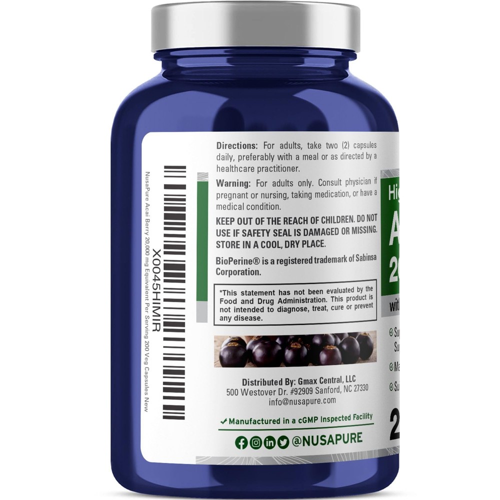 NusaPure Acai Berry Capsules 20000mg | 200 Veggie Caps | Non-GMO, Extract 50:1, Bioperine Product Overview Formulation: Capsule Brand: NusaPure Features Acai Berry: Indigenous to Brazil, this superfruit is a natural source of polyphenols Provides the equivalent of 20000mg of Acai Berry per serving in high-absorption veggie capsules A 50:1Extract, Vegan/vegetarian, Non-GMO 200 veggie capsules for a 100-day supply Manufactured in a cGMP inspected facility Details Brand: NusaPure Flavor: Unflavored Unit Count: 200 Count Item Form: Capsule Product Benefits: Antioxidant Age Range (Description): Adult Package Information: Bottle Number of Items: 1 Dosage Form: Capsule Material Feature: Vega, Gluten Free Ingredient, GMO Free Package Dimensions : 4.41 x 2.28 x 2.28 inches; 3.84 ounces Date First Available : March 1, 2024 Manufacturer : NusaPure Country of Origin : USA Quality Products Have peace of mind knowing that your order will arrive original factory sealed packaging. That means that you'll have the full force of the manufacturer's warranty to protect your purchase. WHY CHOOSE US: It is our goal to make your shopping experience a smooth and painless process. Our priority is your complete satisfaction and to provide you with great customer service. All our supplements are manufactured in the USA in production facilities that comply with strict new FDA GMP rules. We Do Not Sell Imported Nutritional Supplements. Quality, safety and effective products are our #1 priority. Our finished products undergo a stringent 3-step quality, purity and compound test to ensure that they are 100% as specified with the ingredients as required in our product formulas. We sell premium nutritional supplements that are shipped in a new, factory sealed condition. Fast - Free Shipping - RETURNS/EXCHANGES/REPLACEMENTS You're already purchasing the item. Why pay additional for shipping, especially slow shipping? We get your order shipped out and delivered to your doorstep as quickly as possible. RETURNS/EXCHANGES/REPLACEMENTS: Returns are accepted within 30 Days. Our return policy is 100% money back for the product only, less the shipping cost, for any unopened and factory sealed products. Buyer is responsible for all costs of shipping the item back to us. Refund will be given upon our receipt of product. Tracking number must be provided for the returned package. Returns will be processed within 2 business days after we have received your package. Commitment We are committed to making sure that you leave this transaction satisfied. That means having access to real people that get your questions and concerns answered quickly. Give us a shot and we will make sure that you will look to us again! DISCLAIMER: *These statements have not been evaluated by the FDA. This product is not intended to diagnose, treat, cure, or prevent any disease, but rather a dietary supplement intended for nutritional support. The above description is for information and knowledge purpose, not a healthcare professional advice. Please consult your doctor and/or pharmacist before you take this vitamin. Pregnant or lactating women, diabetics, hypoglycemics, and people with known medical conditions and/or taking drugs, should consult with a licensed physician and/or pharmacist prior to starting any supplementation program.