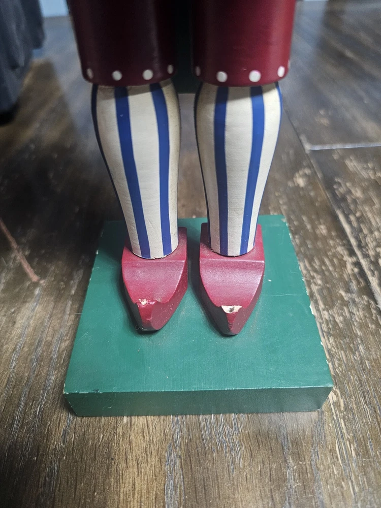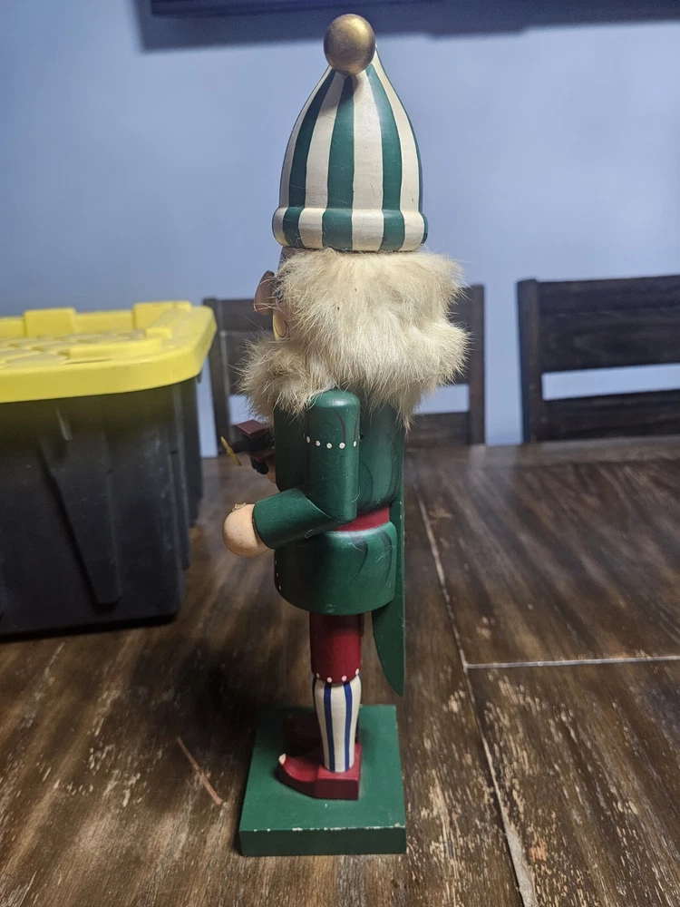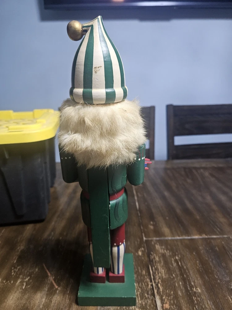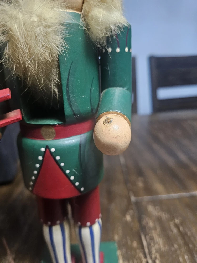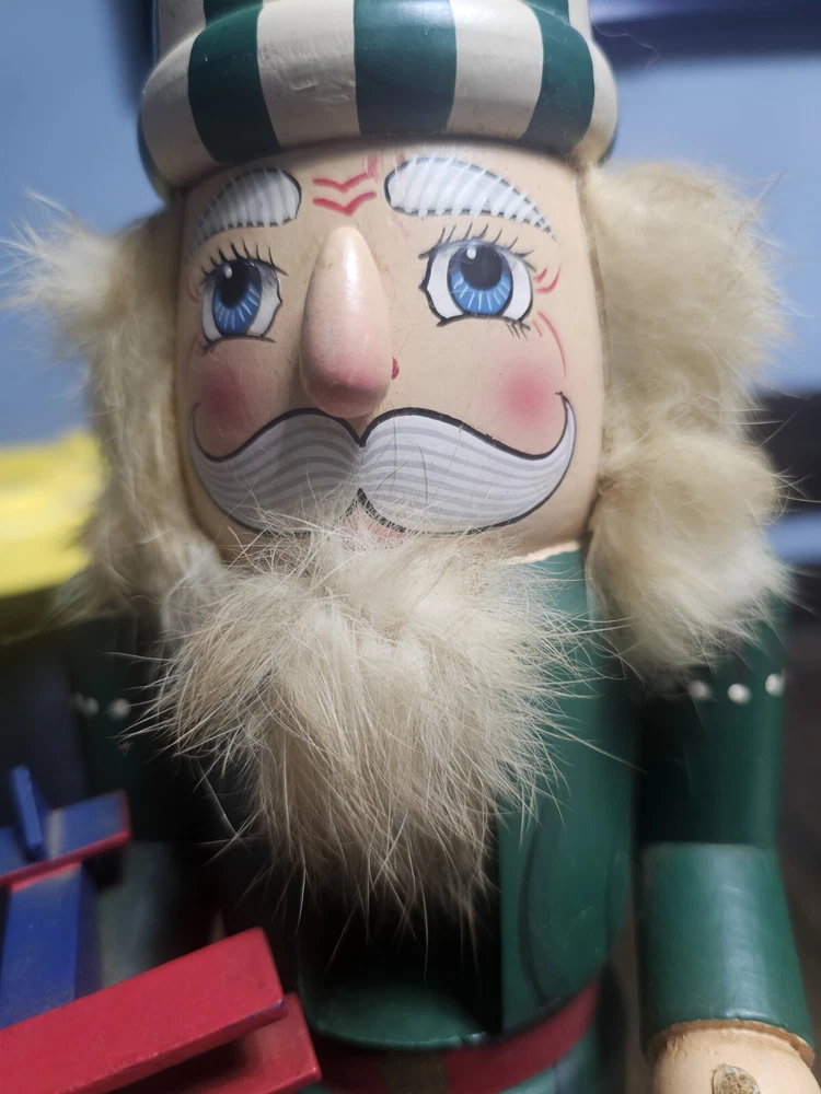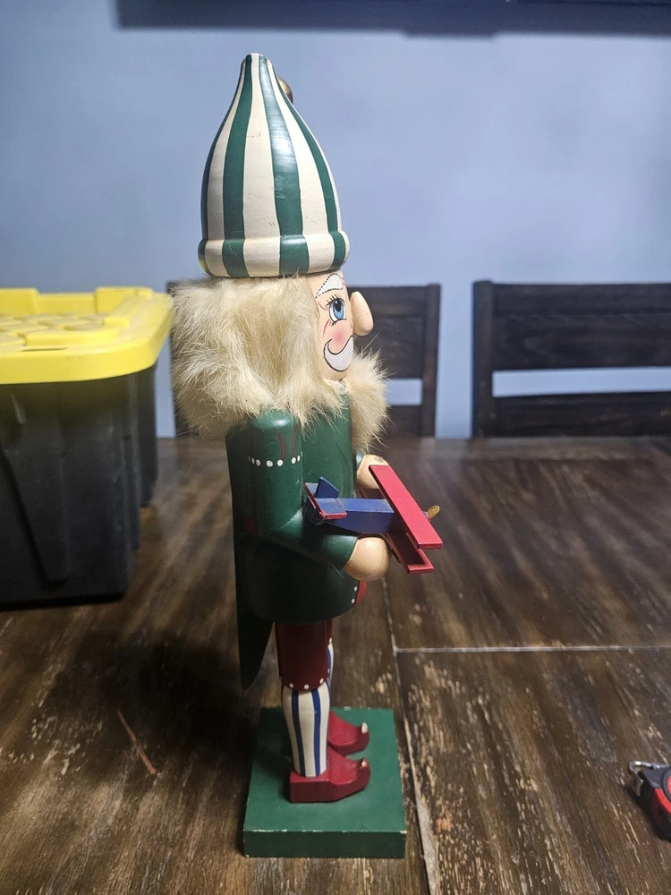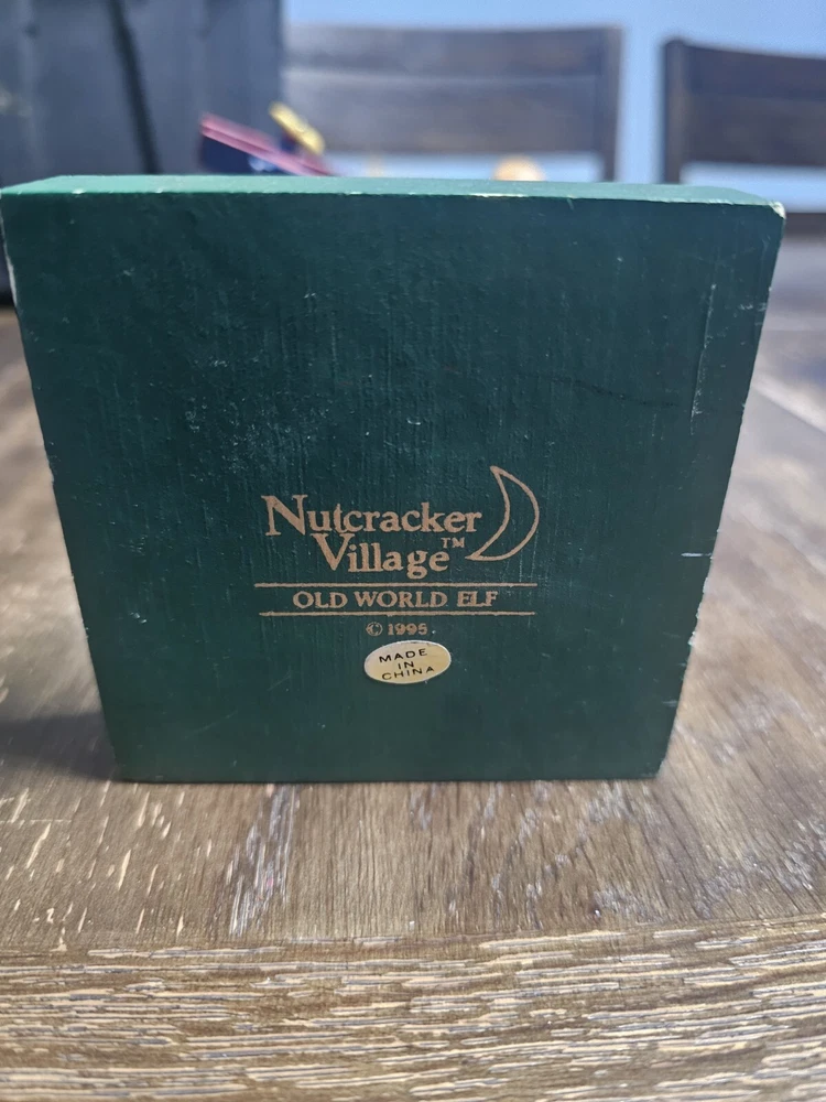 Nutcracker Village Old World Elf 1995 Elf w/Toys Preowned missing gift on left arm. Tips of shoes are broken, has some scratches , hair is stained see all photos