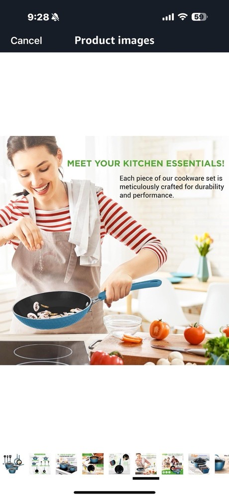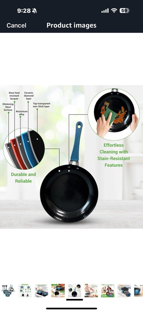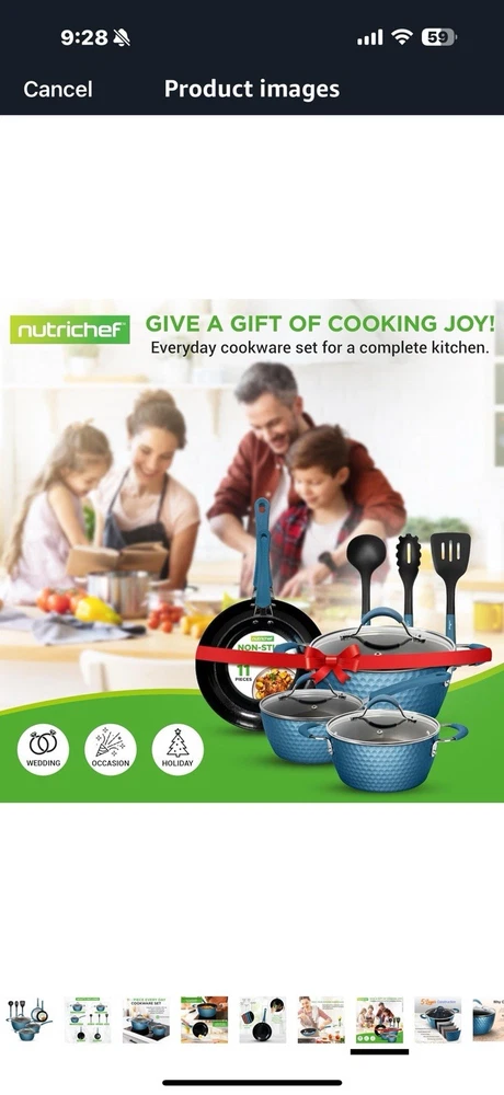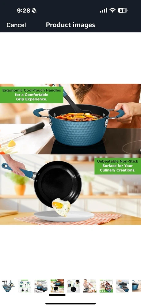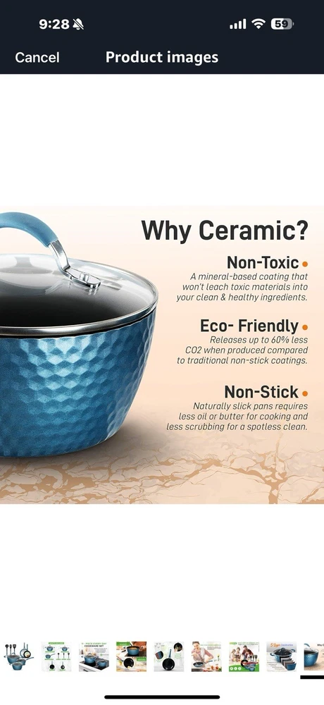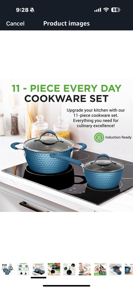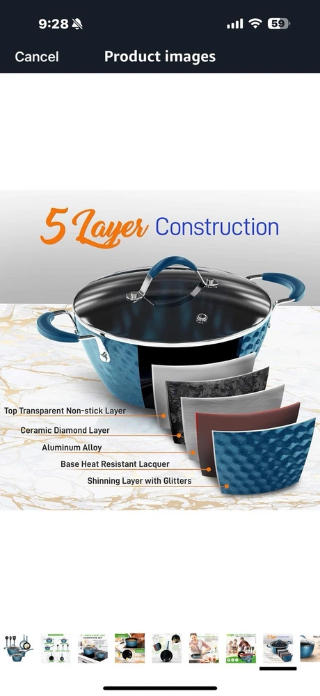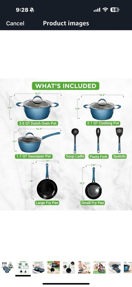 NutriChef 11 Pc Ceramic Cookware Set - Excilon Blue Diamond, Nonstick, Induction Ready, Includes Saucepan, Fry Pans, Dutch Oven, Utensils, Dishwasher Safe - NCCW11BD.7 Material Reinforced Forged Aluminum Metal, Engineered Nylon Silicone, Tempered Glass Color Light Blue Brand NutriChef Size One Size Handle Material Silicone Is Dishwasher Safe No 11-PIECE SET SIGNATURE SET: This offers a 11-piece nonstick cookware set which includes 1.7qt saucepan pot w/ lid, 3.6qt dutch oven pot w/ lid, 2.1qt cooking pot w/ lid, 11” large fry pan, 8” small fry pan, soup ladle, pasta fork, and spatula CERAMIC COATING: The non stick pot set cooking ware features a long lasting nonstick coating for easy tossing, cleaning & healthy cooking. Features PTFE/PFOA/APEO-free gold diamond ceramic exterior makes the pot more durable & w/ better heat transfer SILICONE TOUCH HANDLE GRIPS: This pots set features cool-touch ergonomic handles & also heat-resistant which ensures comfortable & safe cooking. Offers an elegant & sleek diamond-line pattern adding a stylish and modern touch to the pots and pans SEE-THROUGH LIDS: The non stick cookware is equipped with see through tempered glass lids w/ vent holes that allow steam to escape. The oven safe cookware set effectively distributes & retains heat for even cooking with maximum temperature of 500° F INDUCTION READY: These pots and skillet fry pans are safe for use in gas, electric, ceramic & induction counters. Made of reinforced forged aluminum w/ coating thickness of 25-35um, 3.5mm multi-layered. Includes heat-resistant nylon silicone utensils Materials & Care Material Type Reinforced Forged Aluminum Metal, Engineered Nylon Silicone, Tempered Glass Handle Material Silicone Is the item dishwasher safe? No Measurements Size One Size Features & Specs Compatibility Options Pots & Pans Safe for Gas, Electric, Ceramic & Induction Counter Cooktops Additional Features Manual User guide Is Oven Safe Yes