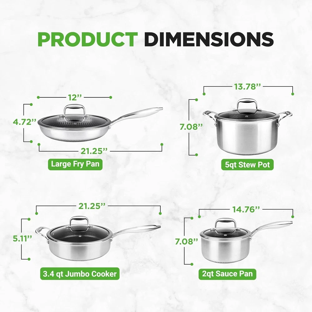 EVEN COOKING ALL-AROUND: Nutrichef stainless steel cookware sets are made w/ triply composite structure-aluminum core fuses between two layers of stainless steel for quick & even heat transfer for even cooking all-around. Oven safe up to 500° SCRATCH-RESISTANT: The stainless steel cooking set features a raised-up honeycomb fire textured pattern that forms an outstanding scratch-resistant surface & equipped w/ cool- ergonomic & heat-resistant handle ensuring comfortable & safe cooking PATENTED TECHNOLOGY: The PFOA/PFOS-free non stick pots and pans sets cooking ware features a stainless steel material w/ long-lasting non-stick coating inside & outside for easy food release/ tossing, cleaning, healthy cooking 8-PIECE SET: The stainless steel pots and pans set comes complete with a stew pot with a lid & handle, a saucepot with a lid & handle, a jumbo cooker with a lid & handle, and a large frypan with a lid & handle On Dec 15, 2024 at 18:42:57 PST, seller added the following information:
