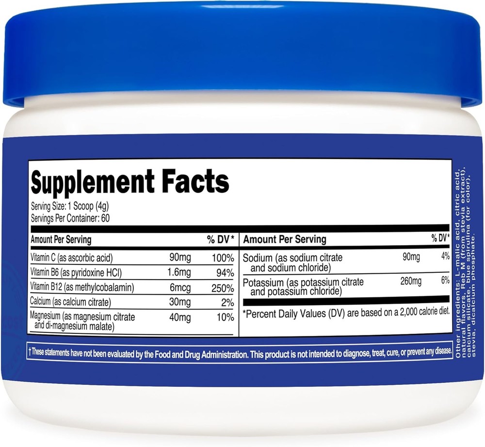 Nutricost Electrolyte Complex Powder (60 Servings, 60 Servings (Pack of 1) Description Features: Optimal Hydration Formula: Contains a balanced blend of electrolytes, vitamins, and minerals to support hydration and replenish the body’s essential electrolytes. Versatile Use: Ideal for use throughout the day or before, during, or after workouts to enhance hydration anytime you need an electrolyte boost. Easy to Use: Simply mix with water for a refreshing and revitalizing drink that aids in rapid hydration. Quality and Safety: Manufactured in a GMP Compliant facility, ensuring high standards of production and safety. Third-Party Tested: Each batch undergoes rigorous testing by independent laboratories, ensuring product purity and potency. Product Details: Product Dimensions : 3.5 x 3.5 x 2.87 inches; 10.6 ounces Item model number : NTC-10617 Manufacturer : Nutricost Brand: Nutricost Flavor: Blue Raspberry Unit Count: 8.4 Ounce Item Form: Powder Item Weight: 10.6 Ounces Item dimensions L x W x H: 3.5 x 3.5 x 2.87 inches Product Benefits: Hydrating Package Information: Bottle Number of Items: 1 UPC: 810139573319 Handling We will ship all orders within 1 business day of payment. Delivery We Do Not Ship Outside of the Continental US. Return Policy All items qualify for returns within 30 days of receipt. Buyer is responsible for return shipping on any item that is not damaged. Feedback We take our reputation seriously, we buy and sell online, so we understand the value of trust. If you are unsatisfied with your order, please contact us and we will work with you to resolve it to your satisfaction.