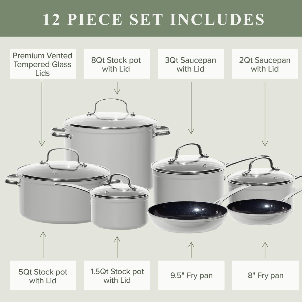 Nuwave Healthy Duralon Blue Ceramic Nonstick Cookware Set, Diamond Infused Scratch-Resistant, PFAS Free, Dishwasher & Oven Safe, Induction Ready & Evenly Heats, Tempered Glass Lids & Stay-Cool Handles Product information Material Ceramic,Stainless Steel,Aluminum,Tempered Glass Color Cool Gray Brand Nuwave Size 12pc Cookware Set Handle Material Stainless Steel Is Dishwasher Safe Yes Material Type Free Pfoa Free Compatibility Options induction oven Number of Pieces 12 Closure Material Stainless Steel Included Components 5QT Stockpot with Lid, 3QT Saucepan with Lid, 1.5QT Saucepan with Lid, 8QT Stockpot with Lid, 2QT Saucepan with Lid Is Oven Safe Yes Item Volume 27.54 Liters With Lid Yes Manufacturer Nuwave UPC 652185900455 Special Feature Induction Stovetop Compatible Package Dimensions 23 x 13 x 12.8 inches Item Weight 25.2 pounds Country of Origin China Item model number 12pc ceramic nonstick Grey Cookware Set PREMIUM FORGED CONSTRUCTION – Forging makes the cookware strong and durable yet lightweight and easy to handle. It is a work-of-art where form meets function. It is constructed to perform well under any situation at any skill level. HEALTHY DURALON BLUE COATING – The eco-friendly, ultra-non-stick Gen10 Duralon Blue is all-natural ceramic coating free of harmful chemicals like PFAS*, PTFE, PFOA, lead, and cadmium. It also does not emit toxic gases at higher temperatures. *Tested by TÜV Rheinland for 106 known PFAS elements and none were detected. GENERATION 10 (G10) CERAMIC – For more than a decade, we have continuously perfected our Duralon Ceramic Coating. G10 Duralon Blue is exceptional in every category. It heats fast and evenly; releases food effortlessly; and is extraordinarily durable. The ceramic coating is not *chemically* nonstick but gets pretty darn close. DURALON BLUE HARDNESS – Hardness is rated at 9H. Since diamond is rated at 10H, it is extremely strong. It has HIGH resistances to abrasion, corrosion, and acid meaning. It won’t chip or discolor and will retain its non-stick properties longer. INDUCTION READY & EVEN HEAT DISTRIBUTION – Every cookware is bonded and reinforced with anti-warp SS plate on the bottom to make it induction ready. This bonding delivers fast, even heat distribution, and superior heat retention at any temperature. Shipping We offer FREE shipping on all orders! We ship within Three business days of payment, usually sooner. We use a selection of shipping services such as UPS, FedEx, USPS etc. We only ship to the lower 48 states, no APO/FPO addresses or PO Boxes allowed. Local pickups and combined shipping options are not provided at this time. Return You can return a product for up to 30 days from the date you purchased it. Any product you return must be in the same condition you received it and in the original packaging. Please keep the receipt. Payment We accept payment by any of the following methods: PayPal Please pay as soon as possible after winning an auction, as that will allow us to post your item to you sooner! Feedback Customer satisfaction is very important to us. If you have any problem with your order, please contact us and we will do our best to make you satisfied. Contact Us If you have any queries, please contact us via ebay. We usually respond within 24 hours on weekdays. Please visit our eBay store to check out other items for sale! Thank you for shopping at our store.