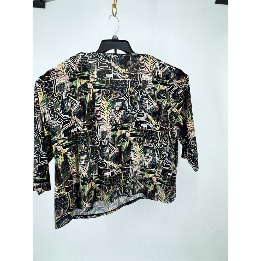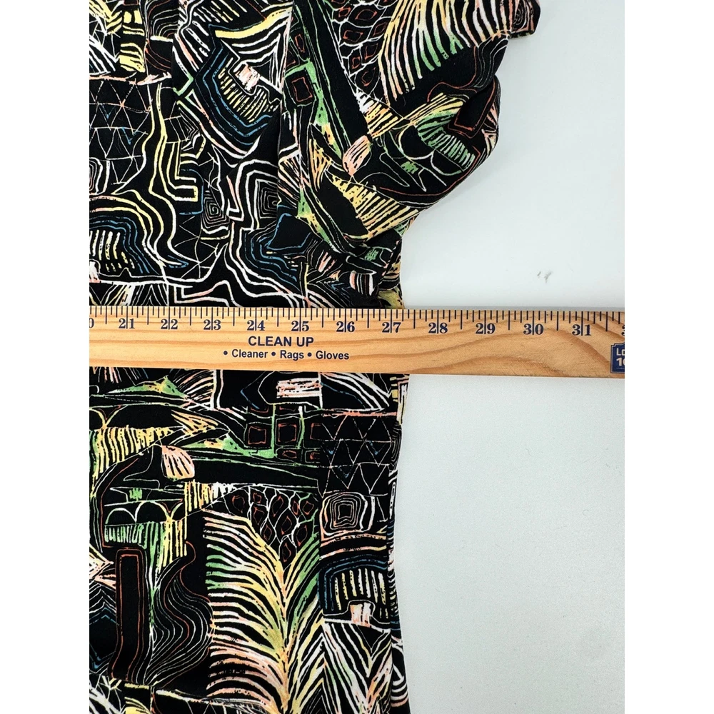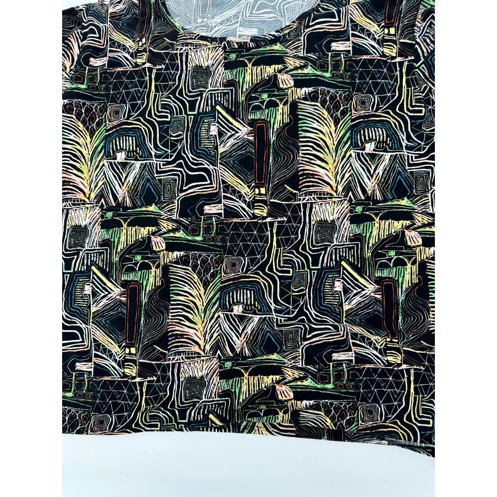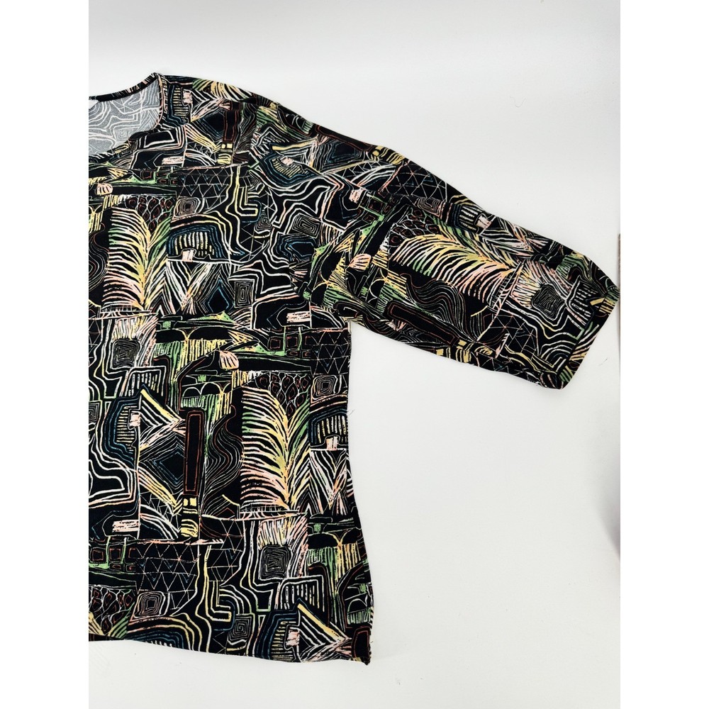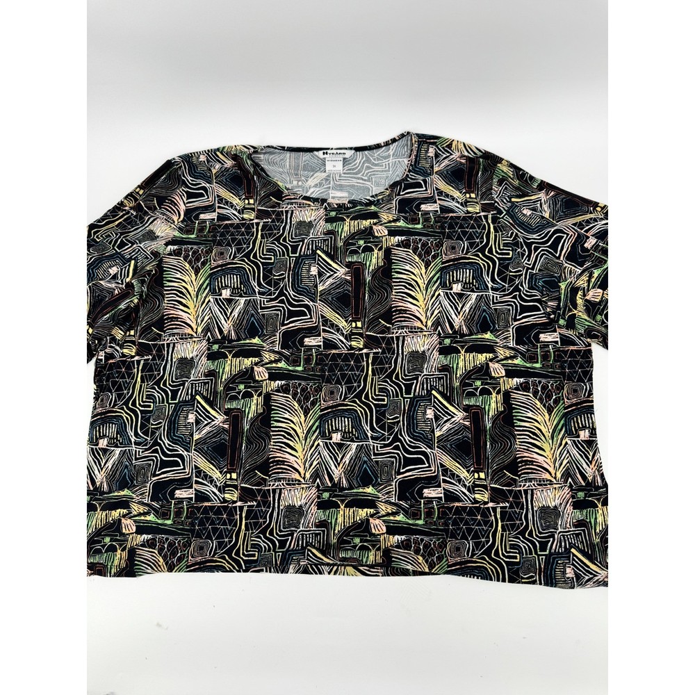 Nygard Collection short sleeve top features a vibrant, abstract geometric and palm leaf print in a multicolored palette over a black base. Crafted from a comfortable polyester and spandex blend, this lightweight knit shirt offers a relaxed fit with a classic crew neckline and dropped shoulders. The intricate pattern includes architectural lines and tribal-inspired motifs, making it a versatile piece for artistic or casual styling. Brand: Nygard Collection Material: 92% Polyester, 8% Spandex Pattern: Abstract Geometric Palm Sleeve Length: Short Sleeve Neckline: Crew Neck Style: Pullover Color: Multicolor/Black Fit: Relaxed Accents: Dropped Shoulder Country of Manufacture: China Measurements: • Pit to Pit: 27" (54" doubled) • Length: 25" Keywords: Art to Wear, Abstract, Tribal, Palm Leaf, Geometric, Colorful, Plus Size, Maximalist, Eclectic, Summer, Lightweight, Travel, Easy Care Our items are carefully examined measured and stored in a smoke free environment We do our best to our best to accurately describe all items. measurements are approximate see pictures. We offer a free 30 day return and all unused and unworn items. 100% authenticity guarantee. Items usually ship same or next business day. please contact me first I will do my best to answer all questions and resolve all issues thank you for stopping by Jeff and Kathy.