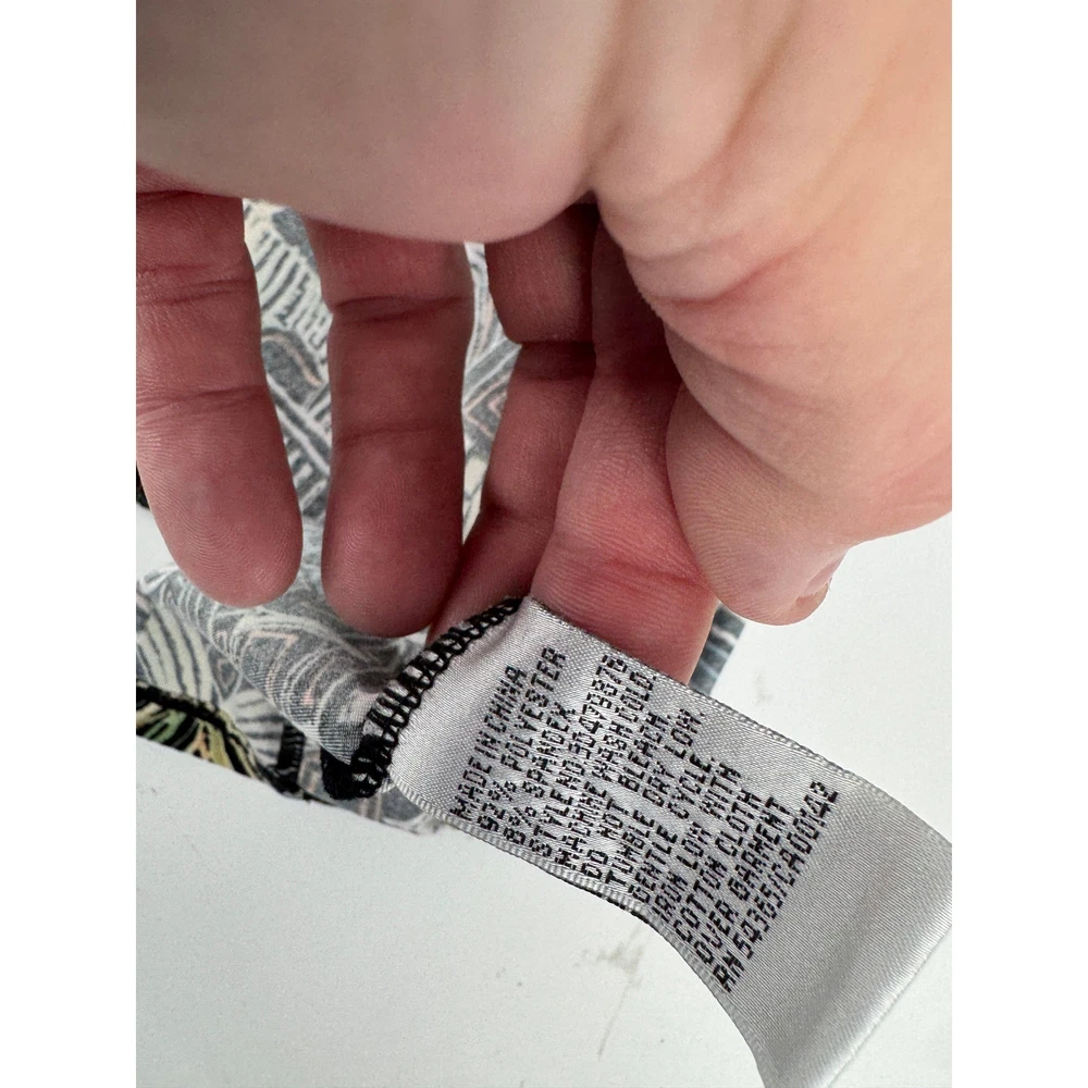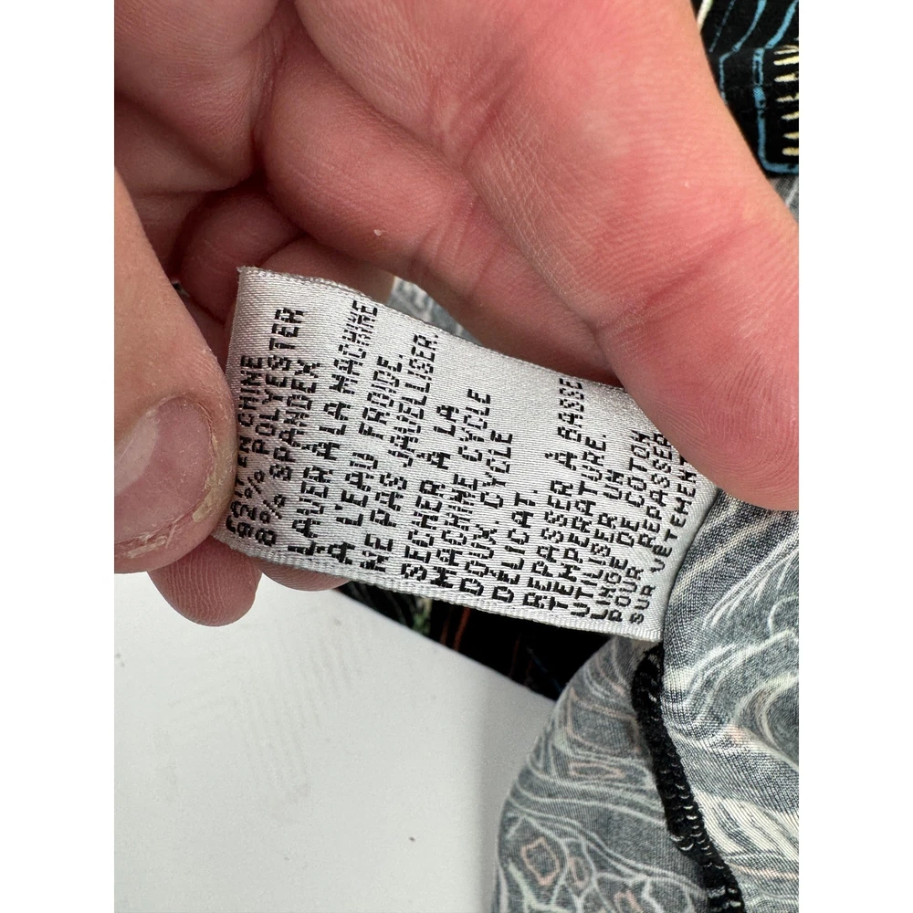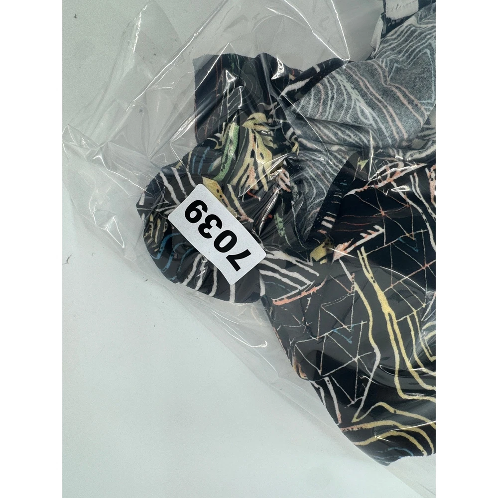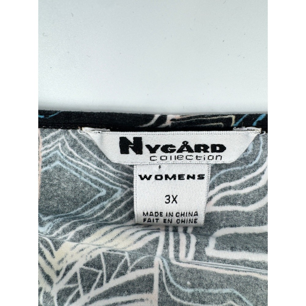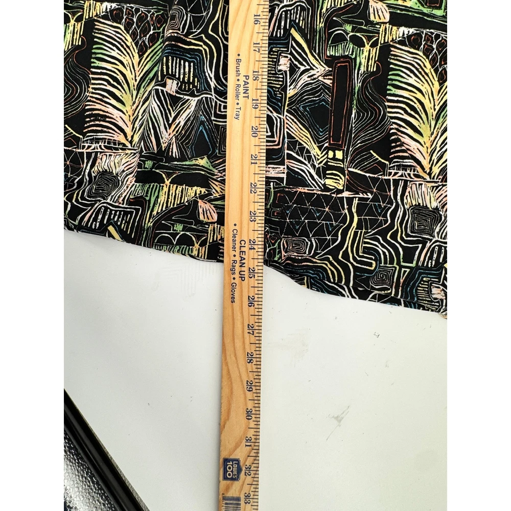 Nygard Collection short sleeve top features a vibrant, abstract geometric and palm leaf print in a multicolored palette over a black base. Crafted from a comfortable polyester and spandex blend, this lightweight knit shirt offers a relaxed fit with a classic crew neckline and dropped shoulders. The intricate pattern includes architectural lines and tribal-inspired motifs, making it a versatile piece for artistic or casual styling. Brand: Nygard Collection Material: 92% Polyester, 8% Spandex Pattern: Abstract Geometric Palm Sleeve Length: Short Sleeve Neckline: Crew Neck Style: Pullover Color: Multicolor/Black Fit: Relaxed Accents: Dropped Shoulder Country of Manufacture: China Measurements: • Pit to Pit: 27" (54" doubled) • Length: 25" Keywords: Art to Wear, Abstract, Tribal, Palm Leaf, Geometric, Colorful, Plus Size, Maximalist, Eclectic, Summer, Lightweight, Travel, Easy Care Our items are carefully examined measured and stored in a smoke free environment We do our best to our best to accurately describe all items. measurements are approximate see pictures. We offer a free 30 day return and all unused and unworn items. 100% authenticity guarantee. Items usually ship same or next business day. please contact me first I will do my best to answer all questions and resolve all issues thank you for stopping by Jeff and Kathy.