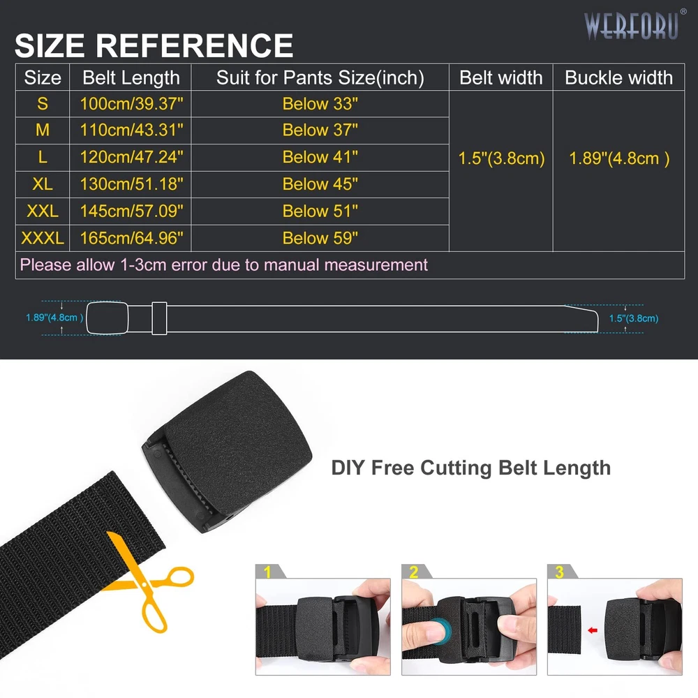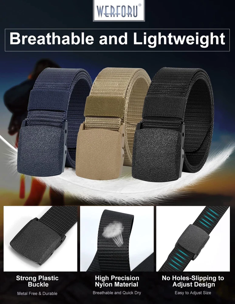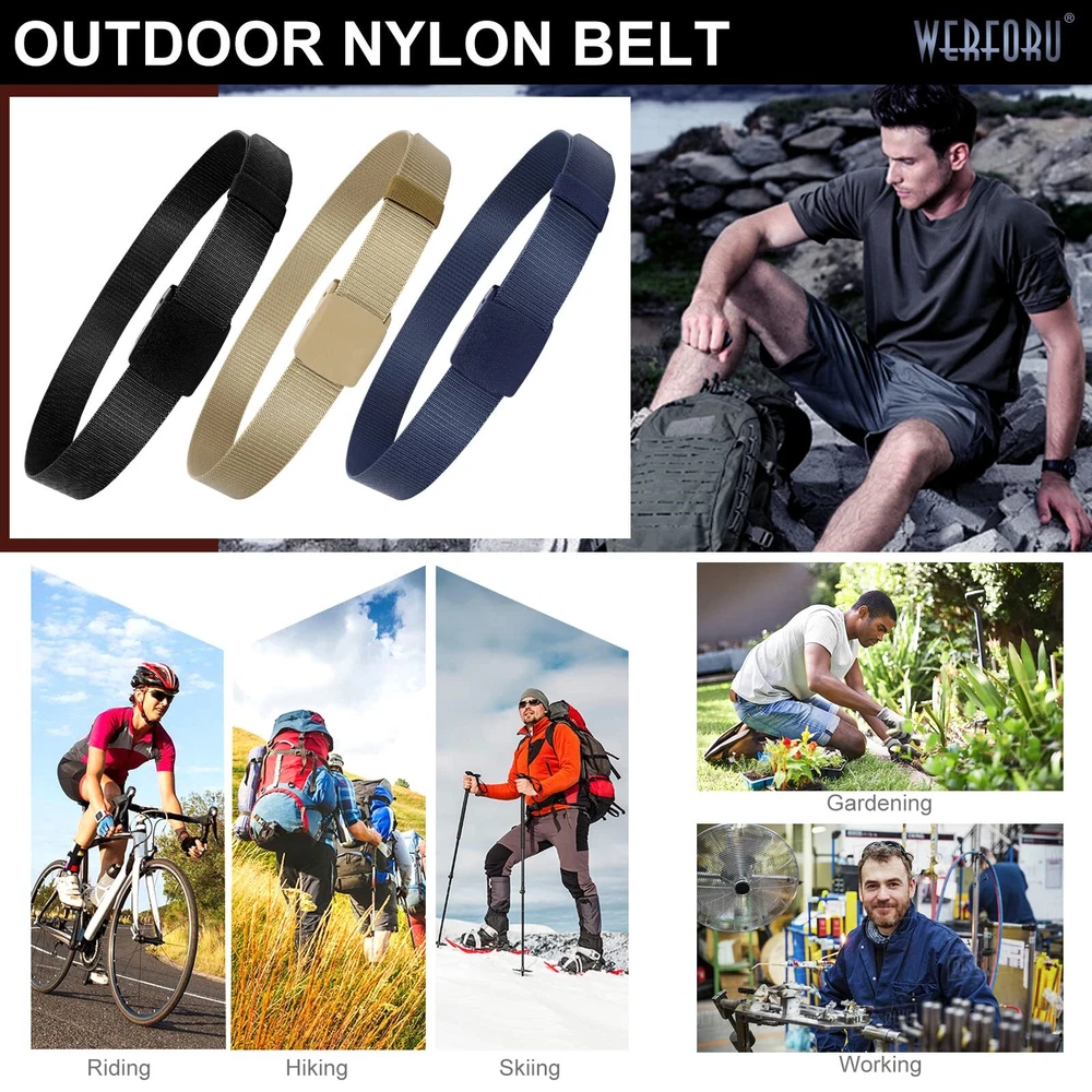 Nylon Belt for Men Military Tactical Belt Canvas Outdoor Web Belt with Plastic Buckle Premium Quality Nylon Material Men's nylon tactical belt is made of high-quality nylon material, it is lightweight and wear-resistant, with fast sweat evaporation, quick-drying, breathable. Strong Durable Plastic Buckle Nickel Free, Non-Allergic. Allow you to be able to go through a metal detector or airport security without having to take it off. The plastic buckle design is also a good choice for someone metal allergy to wear. No Hole Adjustable Belt No holes nylon webbing with flip top buckle design, hold tightly,supper easy to use, no longer worry about adjusting the strap holes. Just slide the strap into the buckle, adjust to fit your waist size then press to close. Trim to Perfect Size The buckle is removable, If the Strap is too long for you,you can cut the excess strap to the perfect size. Color: black,khaki,blue,gray ,coffee Four Kinds of Combination Black+khaki Black+khaki+Blue Black+khaki+Gray Black+khaki+Blue+Coffee Various Match Simple fashion style designed for men, you can wear it in your daily life, matching your jeans/pants/shorts/ski pants/golf dress/cargo pants. And it can also match many style military uniform. Full Occasions Support Awesome accessory for your outdoor sports and daily wearing. Such as hiking, camping, skiing, gardening ,riding ,hunting or fishing and and other casual occasions etc. QUALITY NYLON BELT-- Premium nylon webbing, lightweight, soft, breathable,flexible, sturdy and durable, sweat absorption and dry fast. Compare with the leather belt, the nylon belt won’t be cracked and aged after long times using. PLASTIC BUCKLE DESIGN---Designed with metal-free plastic buckle, which is not easy to crack and breakage. Nickel free plastic buckle, feel comfortable and easy to wear. Non-metallic buckle belt allow you a easy/quick clearance at the security checkpoint at the airport. And especially suitable for metal allergy to wear. VARIOUS COLLOCATION---We have 2 pack,3 pack,4 pack nylon belt for your choice.Different colors nylon belt meet your different daily wear needs. Lightweight, quick dry, comfort nylon material strap with plastic buckle suitable for daily wearing with all pants, and outdoor heavy duty work or sports (hiking pants, ski pants, snow pants etc). A great gift for your friend and relatives! OCCASION---Available in black,khaki,blue,gray ,coffee 5 colors for choose,enough quantity and color to match all your daily outfit. This nylon belt is not only for daily wear, but also more suitable to outdoor sports, such as: climbing mountains, hiking, golf, hunting, fishing ,skiing and so on. FULLY ADJUSTABLE---6 size for your choice,meet most people needs. Belt strap width is 1.5 inches,easy to pass through most pants. No holes belt design, so its tightness and length can be adjusted freely to meet different wearing requirements. If the strap is too long for you, you can trim the strap length to fit your size. The ratchet buckle design makes the belt non-slip, stay tight full day.
