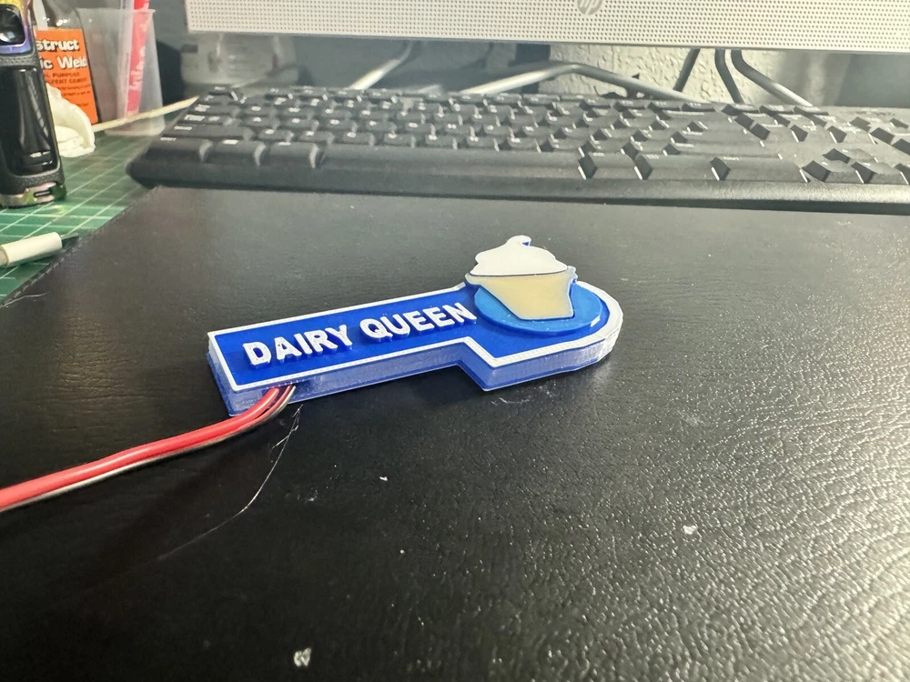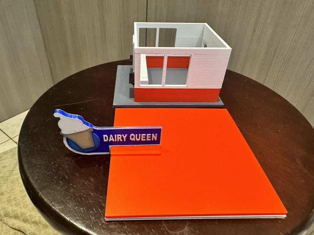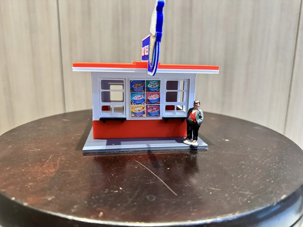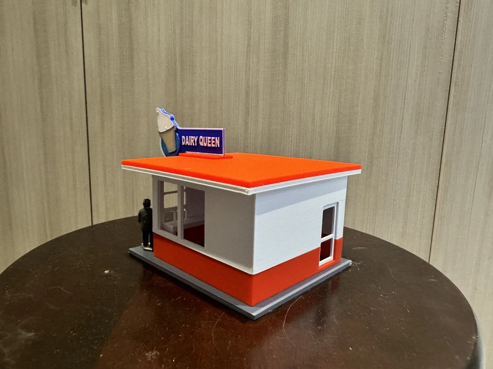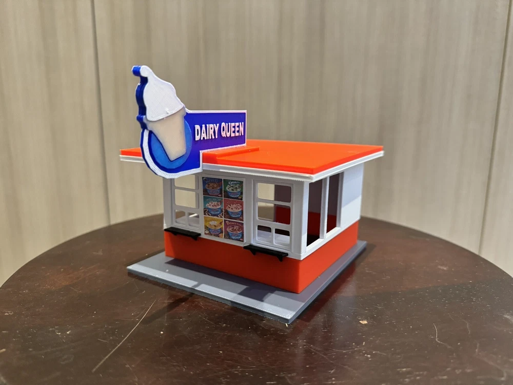 UPDATED 7/5 - added the ability to light up the Dairy Queen Sign ( Thanks to Youtube Friend Suggestion). See attached photos…(strip light & wires not included sorry). Here is a building we have all visited, this kit comes with everything shown, printed in color as displayed. I will also include a printout photocopy of the sign if you wanna use it. This building is approximately 5 x 4 1/2 x 4 1/2 H, to the top of the sign high if used with the included base. Sorry Bob is our resident helper and not included in listing. Sorry US Shipping only Contact me with any questions. Assembly video available on my youtube page @flrailroaddog
