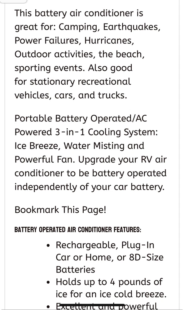 Stay cool all summer long with the O2Cool large portable battery powered air conditioner cool box with misting fan. This portable battery air conditioning fan operates on battery power or an AC home wall adapter (included) . A battery operated air conditioner fan is a must for those long hot summer nights or during those long days when the power goes out for hurricanes or earthquakes. This 12 volt O2Cool battery cool box fan goes anywhere and last for hours on a single set of alkaline batteries. Always plan ahead and stay cool! Great for portable RV air conditioner. This powerful long lasting battery powered fan has more cooling power than any other.