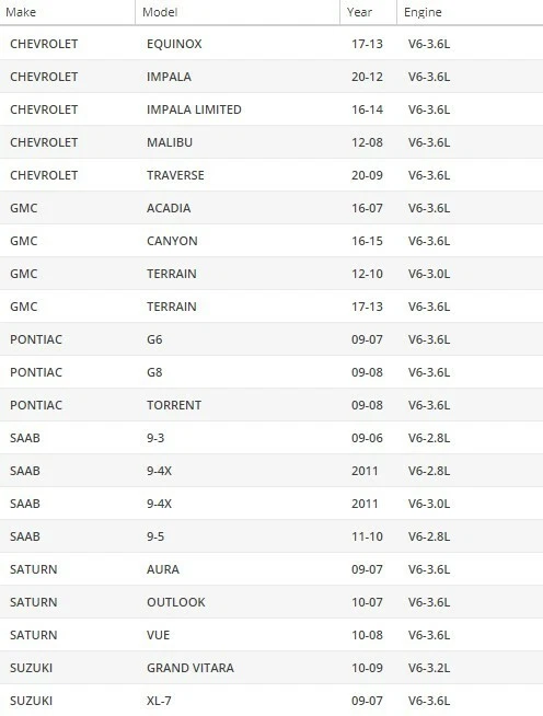 New OAW Water Pump with Gasket Buick Enclave/ Cadillac CTS, SRX / Chevrolet Camaro, Malibu/ GMC Acadia, Terrain / Pontiac G6, G8/ Saab 9-3/ Saturn Aura, Outlook/ Suzuki Grand Vitara V6 Engine 2004 - 2017 Interchange with GMB# 130-5130 and Airtex# AW5103 Please refer to the complete application guide below to ensure proper fitment. Complete applications: BUICK (26) 2004-2014 ALLURE (CAN) (6) 2005-2010 2010 V6-182ci 3.0L F/I Vin G 2010 V6-217ci 3.6L F/I Vin V 2008 V6-217ci 3.6L F/I Vin 7 (CXS) 2007 V6-217ci 3.6L F/I Vin 7 (CXS) 2006 V6-217ci 3.6L F/I Vin 7 (CXS) 2005 V6-217ci 3.6L F/I Vin 7 (CXS) ENCLAVE (7) 2008-2014 2014 V6-217ci 3.6L F/I 2013 V6-217ci 3.6L F/I Vin D/LLT 2012 V6-3564cc 3.6L F/I Vin D 2011 V6-3564cc 3.6L F/I Vin D 2010 V6-217ci 3.6L F/I Vin D 2009 V6-217ci 3.6L F/I Vin D 2008 V6-217ci 3.6L F/I Vin 7 LACROSSE (10) 2005-2014 2014 V6-217ci 3.6L FLEX/FI 2013 V6-217ci 3.6L FLEX/FI Vin 3 2012 V6-3564cc 3.6L FLEX/FI Vin 3 2011 V6-3564cc 3.6L F/I Vin D 2010 V6-217ci 3.6L F/I Vin V 2010 V6-182ci 3.0L F/I Vin G 2008 V6-217ci 3.6L F/I Vin 7 (CXS) 2007 V6-217ci 3.6L F/I Vin 7 (CXS) 2006 V6-217ci 3.6L F/I Vin 7 (CXS) 2005 V6-217ci 3.6L F/I Vin 7 (CXS) RENDEZVOUS (3) 2004-2006 2006 V6-217ci 3.6L F/I Vin 7 2005 V6-217ci 3.6L F/I Vin 7 2004 V6-217ci 3.6L F/I Vin 7 CADILLAC (48) 2004-2014 ATS (2) 2013-2014 2014 V6-217ci 3.6L FLEX/FI Vin 3 2013 V6-217ci 3.6L FLEX/FI Vin 3 CTS (23) 2004-2014 2014 V6-217ci 3.6L FLEX/FI 2014 V6-217ci 3.6L F/I TURBO 2014 V6-182ci 3.0L F/I Vin 5 2013 V6-182ci 3.0L FLEX/FI Vin 5 2013 V6-217ci 3.6L FLEX/FI Vin 3 2012 V6-217ci 3.6L F/I Vin 3 2012 V6-183ci 3.0L F/I Vin 5 2011 V6-217ci 3.6L F/I Vin D 2011 V6-183ci 3.0L F/I Vin Y 2010 V6-217ci 3.6L F/I Vin 7 2010 V6-217ci 3.6L F/I Vin V 2010 V6-182ci 3.0L F/I Vin G 2009 V6-217ci 3.6L F/I Vin 7 2009 V6-217ci 3.6L F/I Vin V 2008 V6-217ci 3.6L F/I Vin V 2008 V6-217ci 3.6L F/I Vin 7 2007 V6-217ci 3.6L F/I Vin 7 2007 V6-170ci 2.8L F/I Vin T 2006 V6-217ci 3.6L F/I Vin 7 2006 V6-170ci 2.8L F/I Vin T 2005 V6-170ci 2.8L F/I Vin T 2005 V6-217ci 3.6L F/I Vin 7 2004 V6-217ci 3.6L F/I Vin 7 SRX (13) 2004-2014 2014 V6-217ci 3.6L FLEX/FI 2013 V6-217ci 3.6L FLEX/FI Vin LFX 2012 V6-217ci 3.6L F/I Vin 3 2011 V6-2792cc 2.8L F/I Vin 6 2011 V6-183ci 3.0L F/I Vin Y 2010 V6-173ci 2.8L F/I TURBO Vin 4 2010 V6-182ci 3.0L F/I Vin Y/LF1 2009 V6-217ci 3.6L F/I Vin 7 2008 V6-217ci 3.6L F/I Vin 7 2007 V6-217ci 3.6L F/I Vin 7 2006 V6-217ci 3.6L F/I Vin 7 2005 V6-217ci 3.6L F/I Vin 7 2004 V6-217ci 3.6L F/I Vin 7 STS (7) 2005-2011 2011 V6-217ci 3.6L F/I Vin D 2010 V6-217ci 3.6L F/I Vin V 2009 V6-217ci 3.6L F/I Vin V 2008 V6-217ci 3.6L F/I Vin V 2007 V6-217ci 3.6L F/I Vin 7 2006 V6-217ci 3.6L F/I Vin 7 2005 V6-217ci 3.6L F/I Vin 7 XTS (3) 2013-2014 2014 V6-217ci 3.6L FLEX/FI 2014 V6-217ci 3.6L F/I TURBO 2013 V6-217ci 3.6L FLEX/FI Vin 3 CHEVROLET (31) 2008-2014 CAMARO (5) 2010-2014 2014 V6-217ci 3.6L F/I 2013 V6-217ci 3.6L FLEX/FI Vin 3 2012 V6-217ci 3.6L F/I Vin 3 2011 V6-217ci 3.6L F/I Vin D 2010 V6-217ci 3.6L F/I Vin V CAPRICE (3) 2012-2014 2014 V6-217ci 3.6L FLEX/FI 2013 V6-217ci 3.6L FLEX/FI Vin 3 2012 V6-217ci 3.6L F/I Vin 3 CAPTIVA SPORT (1) 2012-2012 2012 V6-182ci 3.0L FLEX/FI Vin 5 EQUINOX (7) 2008-2014 2014 V6-217ci 3.6L FLEX/FI 2013 V6-217ci 3.6L FLEX/FI Vin 3/LFX 2012 V6-182ci 3.0L FLEX/FI Vin 5 2011 V6-182ci 3.0L F/I Vin 5 2010 V6-182ci 3.0L F/I Vin Y 2009 V6-217ci 3.6L F/I Vin 7 2008 V6-217ci 3.6L F/I Vin 7 (SPORT) IMPALA (4) 2012-2014 2014 V6-217ci 3.6L FLEX/FI Vin 3 2014 V6-217ci 3.6L F/I Vin 3 2013 V6-217ci 3.6L FLEX/FI Vin 3 2012 V6-217ci 3.6L FLEX/FI Vin 3 MALIBU (5) 2008-2012 2012 V6-217ci 3.6L F/I Vin 7 2011 V6-217ci 3.6L F/I Vin 7 2010 V6-217ci 3.6L F/I Vin 7 2009 V6-217ci 3.6L F/I Vin 7 2008 V6-217ci 3.6L F/I Vin 7 TRAVERSE (6) 2009-2014 2014 V6-217ci 3.6L F/I 2013 V6-217ci 3.6L F/I Vin D/LLT 2012 V6-217ci 3.6L F/I Vin D 2011 V6-217ci 3.6L F/I Vin D 2010 V6-217ci 3.6L F/I Vin D 2009 V6-217ci 3.6L F/I Vin D GMC (14) 2007-2014 ACADIA (8) 2007-2014 2014 V6-217ci 3.6L F/I 2013 V6-217ci 3.6L F/I Vin D/LLT 2012 V6-217ci 3.6L F/I Vin D 2011 V6-217ci 3.6L F/I Vin D 2010 V6-217ci 3.6L F/I Vin D 2009 V6-217ci 3.6L F/I Vin D 2008 V6-217ci 3.6L F/I Vin 7 2007 V6-217ci 3.6L F/I Vin 7 TERRAIN (6) 2010-2014 2014 V6-217ci 3.6L FLEX/FI Vin 3 2014 V6-217ci 3.6L F/I Vin 3 2013 V6-217ci 3.6L FLEX/FI Vin 3 2012 V6-182ci 3.0L FLEX/FI Vin 5 2011 V6-182ci 3.0L F/I Vin 5 2010 V6-182ci 3.0L F/I Vin Y PONTIAC (7) 2007-2009 G6 (3) 2007-2009 2009 V6-217ci 3.6L F/I Vin 7 2008 V6-217ci 3.6L F/I Vin 7 2007 V6-217ci 3.6L F/I Vin 7 G8 (2) 2008-2009 2009 V6-217ci 3.6L F/I Vin 7 2008 V6-217ci 3.6L F/I Vin 7 TORRENT (2) 2008-2009 2009 V6-217ci 3.6L F/I Vin 7 (GXP) 2008 V6-217ci 3.6L F/I Vin 7 SAAB (7) 2006-2011 9 - 3 (5) 2006-2009 2009 V6-2792cc 2.8L F/I TURBO Vin B284R (AERO) 2008 V6-2792cc 2.8L F/I TURBO Vin B284R 2008 V6-2792cc 2.8L F/I TURBO Vin B284 2007 V6-2792cc 2.8L F/I TURBO Vin B284 2006 V6-2792cc 2.8L F/I TURBO Vin B284 9 - 5 (2) 2010-2011 2011 V6-2792cc 2.8L F/I TURBO Vin A28NER 2010 V6-2792cc 2.8L F/I Vin A28NER SATURN (11) 2007-2010 AURA (3) 2007-2009 2009 V6-217ci 3.6L F/I Vin 7 2008 V6-217ci 3.6L F/I Vin 7 2007 V6-217ci 3.6L F/I Vin 7 OUTLOOK (4) 2007-2010 2010 V6-217ci 3.6L F/I Vin D 2009 V6-217ci 3.6L F/I Vin D 2008 V6-217ci 3.6L F/I Vin 7 2007 V6-217ci 3.6L F/I Vin 7 VUE (4) 2008-2010 2010 V6-217ci 3.6L F/I Vin 7 2009 V6-217ci 3.6L F/I Vin 7 2009 V6-217ci 3.6L F/I Vin 7 (RED LINE) 2008 V6-217ci 3.6L F/I Vin 7 SUZUKI (5) 2007-2010 GRAND VITARA (2) 2009-2010 2010 V6-3195cc 3.2L F/I Vin N32A 2009 V6-3195cc 3.2L F/I Vin N32A XL-7 (3) 2007-2009 2009 V6-3564cc 3.6L F/I Vin N36A 2008 V6-3564cc 3.6L F/I Vin N36A 2007 V6-3564cc 3.6L F/I Vin N36A