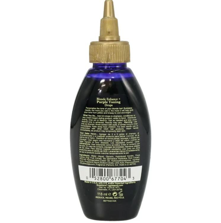 OGX Blonde Enhance + Purple Toning Drops 118ml 4 fl oz Say buhbye to brass with OGX Blonde Enhance Purple Toning Drops This highly pigmented and potent dark purple liquid dispenses into drops to add to your favorite shampoo conditioner and creambased styling products. Use it to brighten and colorcorrect yellow tones on silver prelightened or natural blonde hair with strengthening ingredients like Keratin purple fig and iris. Rinse out or leavein. However you use these customizable drops banish unwanted brassy tones. Ideal for silver prelightened or natural blonde hair Add 35 drops to any shampoo conditioner or creambased styling product A highly pigmented formula to brighten and colorcorrect yellow tones and protect from color fade Made with keratin purple fig and iris to give your hair that fresh and vibrant look and feel Free of sulfated surfactants and parabens