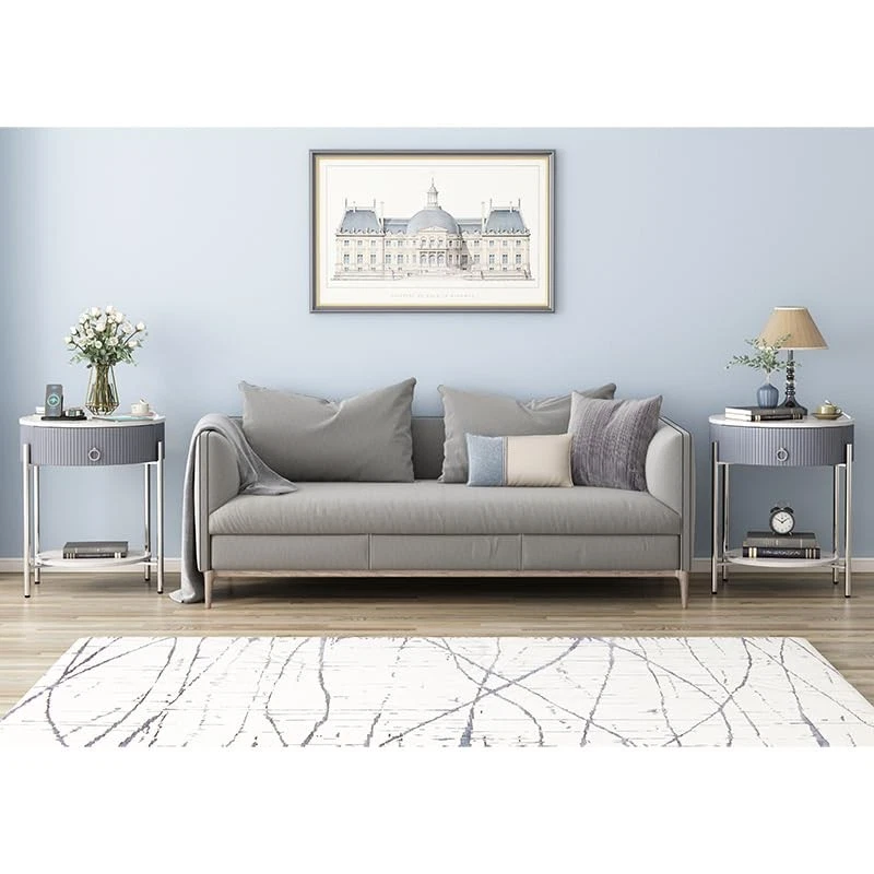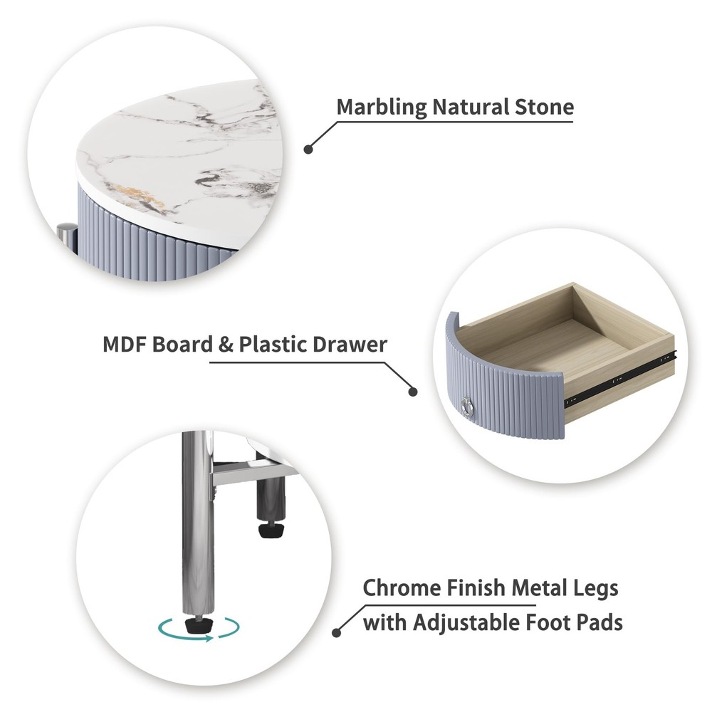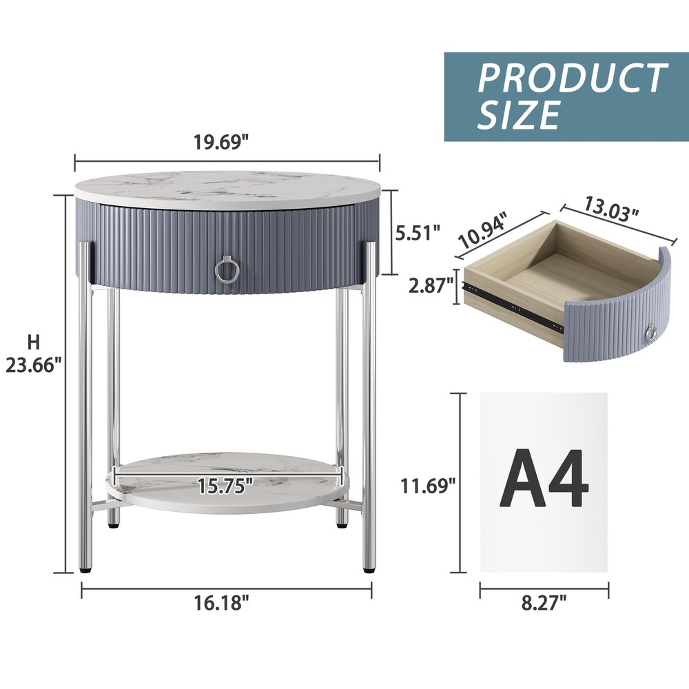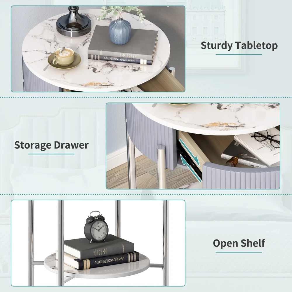 ○Side Table with Drawer:The silver night stand is designed with a drawer and an open shelf for storing or display which provides additional storage space for your books,photos, extra decorative things. ○Versatile Nightstand:The silver end table is made of high-quality material and solid metal frame. The sturdy construction ensures this end tables are for long-term use. ○End Tables for Living Room:This silver side table is ideal for any bedroom, or living room next to your sofa. Four adjustable foot pads protect your floor from scratching. Modern End Table:The modern minimalist style end table features a closed drawer storage design for more privacy, and the combination of beautiful line design and practicality makes this silver side table more suitable for various styles of home decor, which can meet your storage needs Sufficient Storage Space:Measurements 21.26 "L x 21.26 "W x 23.66 "H. The tabletop weight capacity is 80lbs, and the drawer capacity 20lbs. The tabletop, drawer and open shelf of this night stand provide enough storage space. The tabletop can display cups and lamps. Open shelf can hold books and baskets. And the drawers can store small items for all your storage needs. You can easily put it in small or tight spaces to make the whole space look more neat and comfortable Durable Quality:The tabletop and open shelf of this nightstand are made of good quality marbling natural stone, which is waterproof, stain-resistant, durable, and easy to clean. The material of the striped drawer side is MDF board. And the drawer's ring knob is made of aluminum alloy. The 4 silver chrome finish metal legs improve stability and sturdiness, and suitable height with adjustable legs, increasing stability while protecting the floor from scratches Multifunctional Side Table:This sturdy round nightstand with drawer is made of marbling natural stone and chrome finish metal legs, capable of holding up to 220lbs, reflecting a modern and minimalist style, suitable for a variety of home decoration styles. The table can meet your various storage needs and can be placed in your living room or bedroom as a side table or nightstand to display your items Easy Assembly:To make your installation easier, this stone nightstand comes with instructions and tool accessories, following the instructions will allow you to complete the assembly quickly. Please let us know if you have any replacement or damage problems with this end table