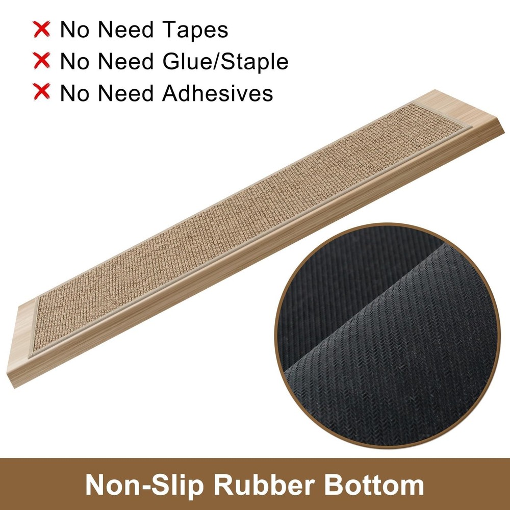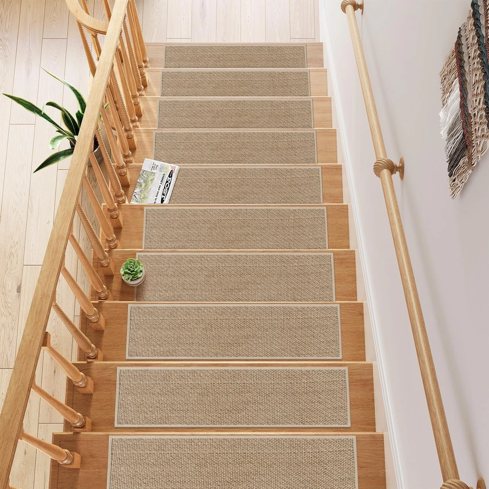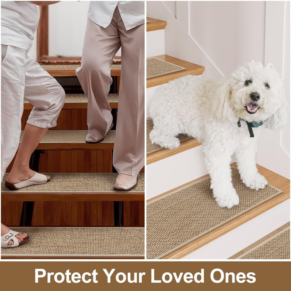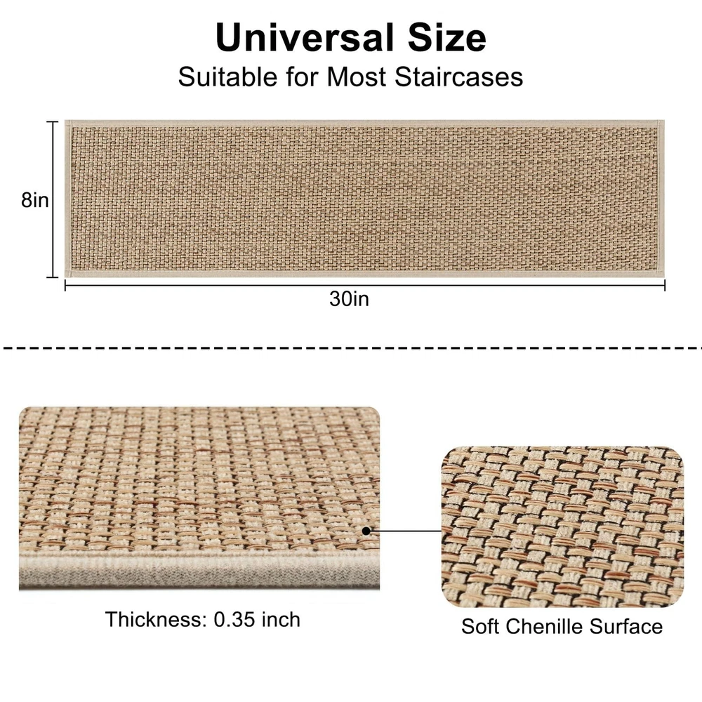 OJIA Stair Treads for Wooden Steps Indoor Washable Stair Carpet Non-Slip 15PCS 30"x8" Rubber Backing Stair Mats Stair Runners for Kids, Elders and Dogs, Staircase Step Treads Stair Covers Product Details Size: 15PCS Color: Natural Number of Items: 15 Brand: OJIA MPN: ST-XNE-BZXNETHXJKS-15PCS UPC: Does not apply EAN: Does not apply Material: Chenille Brand: OJIA Color: Natural Shape: Rectangular Item Form: Sheet Item Weight: 9.8 Pounds Grade Rating: Residential Number of Items: 15 Item Weight: 9.8 pounds Package Dimensions: 17.6 x 11.14 x 5 inches Country of Origin: China Date First Available: August 12, 2024 Non-Slip Stair Treads: Because of its sturdy anti-slip rubber backing, you don't need to purchase another tape or adhesive. Our stair treads can stick to wooden, tile, and marble surfaces tightly, stay put, and stay in place. No Installation, No Residue: No need for adhesive tapes or permanent glue, the rubber backing stair treads carpet won't cause damage to the surface when you try to remove them. No extra steps needed, just clean the stairs and put it on. Safer and Quiter: Makes going up and down the stairs easier and safer for both the dogs and the cat; helps soften the sounds of both people and animals going up and down the creaky wooden stairs. Perfect for all clean smooth flat stairs, including marble, hardwood, or other hard smooth surfaces. Great Protection: The carpet stair treads for wooden steps has a strong protective effect, which can protect the paint of the wooden pedal and prolong the service life of the stairs even protecting your family from slipping accidents. Easy to Clean: Our indoor stair runners are easy to clean and can be cleaned by vacuuming or machine washing, so don't worry about cleaning the hair and dust on the stair treads.