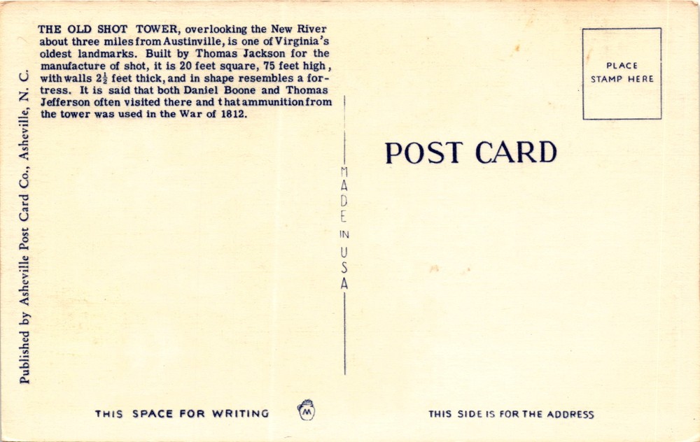 MAKE AN OFFER. THE MORE YOU BUY THE BETTER DEAL I WILL ACCEPT The postcard features an image of the Old Shot Tower, built in 1807, located between Hillsville and Wytheville, Virginia. The tower, overlooking the New River near Austinville, is a historic landmark in Virginia. It was constructed by Thomas Jackson for the production of shot ammunition.
