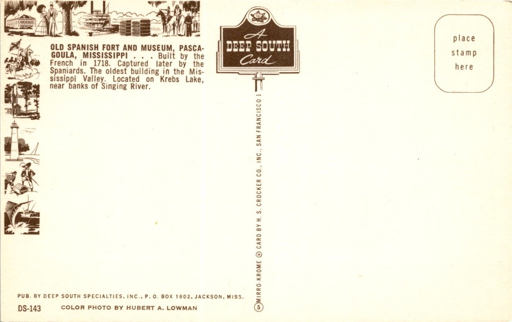 MAKE AN OFFER. THE MORE YOU BUY THE BETTER DEAL I WILL ACCEPT The postcard features an image of the Old Spanish Fort and Museum in Pascagoula, Mississippi. The fort was built by the French in 1718 and later captured by the Spaniards. It is known as the oldest building in the Mississippi Valley and is located on Krebs Lake near the banks of the Singing River.