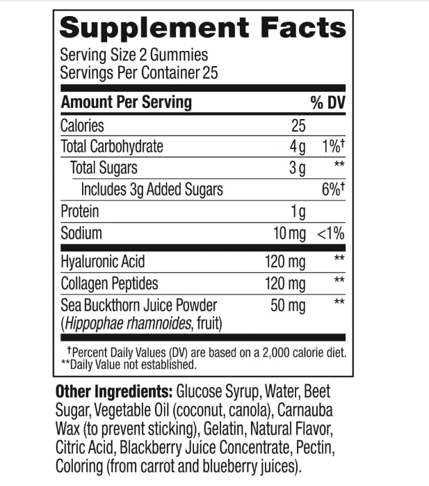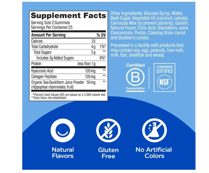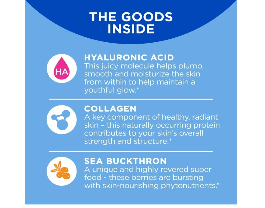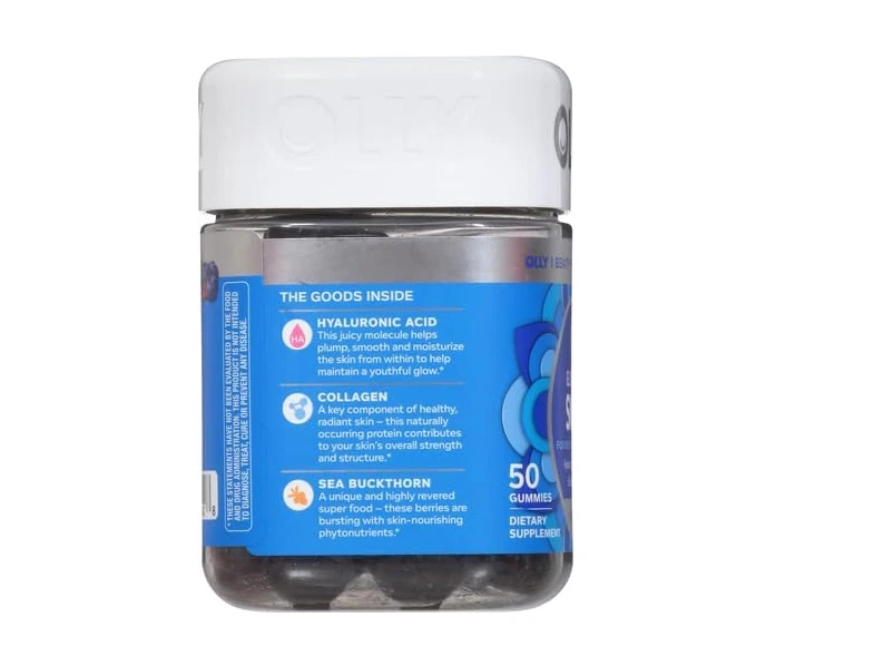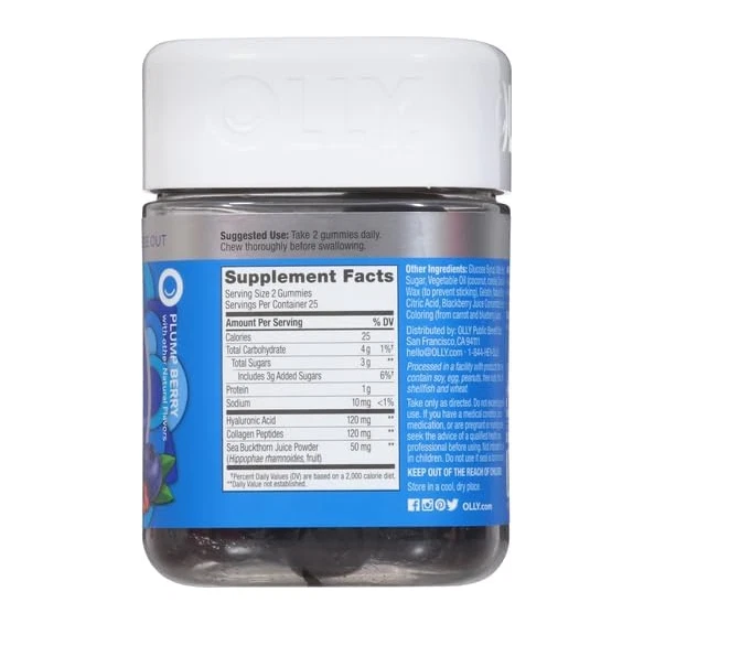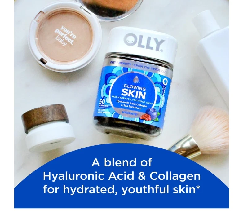 OLLY GLOWING SKIN: This unique blend of super nutrients helps replenish and hydrate your skin for a youthful glow. The delicious beauty gummies deliver a low molecular weight form of Hyaluronic Acid to optimize absorption* THE GOODS INSIDE: Hyaluronic Acid, a juicy molecule that helps plump, smooth and moisturize the skin from within. Collagen a key component of healthy, radiant skin and Sea Buckthorn a unique and highly revered super food* HOW TO TAKE: Chew two gummies, no food or water needed NATURALLY DELICIOUS: Naturally flavored Plump Berry with no artificial colors or flavors and are gluten free. 50 gummies per bottle (25 day supply) MIX AND MATCH: Delightful and delicious OLLY products can be taken together—mix and match as you please