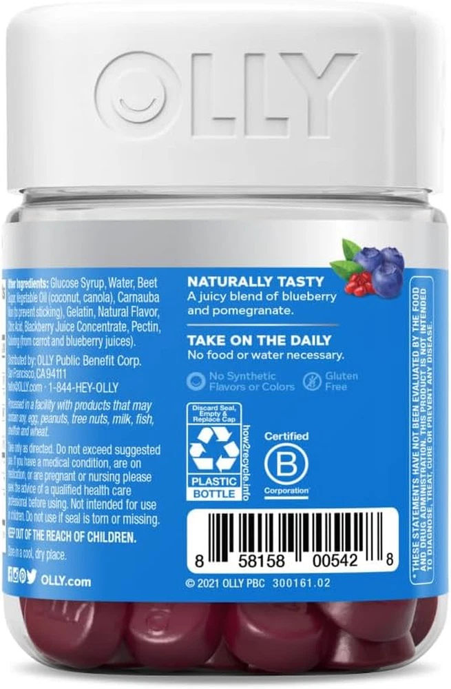 OLLY GLOWING SKIN: This unique blend of super nutrients helps replenish and hydrate your skin for a youthful glow. The delicious beauty gummies deliver a low molecular weight form of Hyaluronic Acid to optimize absorption* THE GOODS INSIDE: Hyaluronic Acid, a juicy molecule that helps plump, smooth and moisturize the skin from within. Collagen a key component of healthy, radiant skin and Sea Buckthorn a unique and highly revered super food* HOW TO TAKE: Chew two gummies, no food or water needed NATURALLY DELICIOUS: Naturally flavored Plump Berry with no artificial colors or flavors and are gluten free. 50 gummies per bottle (25 day supply) MIX AND MATCH: Delightful and delicious OLLY products can be taken together—mix and match as you please OLLY Glowing Skin is a unique blend of super nutrients helps replenish and hydrate your skin from within for a youthful glow.* OLLY beauty gummies feature Hyaluronic Acid, a juicy molecule that helps plump, smooth and moisturize the skin from within. Collagen is a key component of healthy, radiant skin (it's a naturally occurring protein that contributes to your skin's strength and structure), and Sea Buckthorn is a unique and highly revered super food—these berries have been used for centuries to nourish and revitalize the skin.* Good health is at the center of everything we do. That's why we’ve made it our mission to make nutrition easy to understand. We do it by crafting products that are as effective as they are delicious—because we know when something feels good, you’re more likely to do it.* *These statements have not been evaluated by the Food and Drug Administration. This product is not intended to diagnose, treat, cure or prevent any disease.