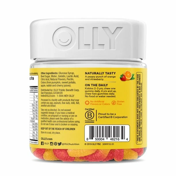 About This Item We aim to show you accurate product information. Manufacturers, suppliers and others provide what you see here, and we have not verified it. Wiggle away! OLLY Kids Multivitamin Gummy Worms are playful nutrient-packed gummies made with a complete blend of daily vitamins and minerals to help kiddos thrive and promote overall wellness.* These OLLY Kids Vitamins deliver a daily dose of essential vitamins and minerals A, C, D, E, Bs and Zinc to support growing kiddos and fill the gaps when eating habits are less than perfect (because lets face it, not all wiggle worms love to eat their veggies!). The chewable daily vitamin comes in a delicious Sour Fruity Punch flavor. Support growing kiddos and fill the gaps when eating habits are less than perfect* Kiddos 2-3 years, chew one gummy daily. 4 years and up, chew two gummies daily Sour Fruity Punch flavor Made with no artificial colors or flavors and gluten free 70 gummies per bottle for a 35 day supply The Goods Inside VITAMINS: Packed with all the good stuff kiddos need to thrive* ZINC: An essential mineral that helps keep immune cells functioning in tip-top shape* Our Passion At OLLY, wellness is at the center of everything we do. That's why we've made it our personal mission to make nutrition easy to understand, so you can pursue good health without compromise. We do it by crafting products that are just as effective as they are delightful and delicious. Because we know when something feels good, you're a lot more likely to do it. *These statements have not been evaluated by the Food and Drug Administration. This product is not intended to diagnose, treat, cure or prevent any disease. Indications: Health Concern: Children's Health General Wellness Ingredients: Ingredients: Glucose Syrup, Beet Sugar, Water, Gelatin, Lactic Acid, Citric Acid, Natural Flavors, Pectin, Colors (from pumpkin, sweet potato, apple, radish and cherry juices) Directions: Dosage: 10mg Instructions: On The Daily: Kiddos 2-3 yrs, chew one gummy daily. 4 yrs and up, chew two gummies daily. No food or water added. Suggested Use: Ages 2-3, take 1 gummy daily. Ages 4+, take 2 gummies daily. Chew thoroughly before swallowing. Store in a cool. dry place. Explore this item Specifications Nutrition Facts Brand OLLY Vitamin & Supplement Type Immunity Supplements, Multivitamins, Mineral Supplements, Zinc Assembled Product Weight 0.6 lb Manufacturer Olly Public Benefit Model 850004462164 Gender Unisex Age Group Child Form Gummies Assembled Product Dimensions (L x W x H) 3.50 x 3.50 x 4.13 Inches ~ Will be wrapped with care. ~ ~FREE SHIPPING~ Any questions, please feel free to contact us.Buy with confidence! Thanks for looking!