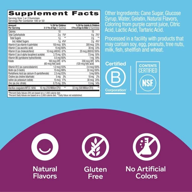 About This Item We aim to show you accurate product information. Manufacturers, suppliers and others provide what you see here, and we have not verified it. Good stuff kiddos need A win-win. This bite-sized kids multivitamin is packed with all the good stuff kiddos need to thrive, like Vitamins A, C, D, Bs and Zinc, in a delicious gummy they'll actually enjoy. The chewable daily vitamin also delivers a super dose of probiotics to help support healthy belly bacteria and a strong immune system.* OLLY kids vitamins are naturally delicious, scientifically formulated and gluten free. Kiddos 2-3 years, chew one vitamin daily and 4 years and up, chew two daily. No food or water needed.* These chewable daily vitamins support overall wellness and help fill nutritional gaps* Kiddos 2-3 years, chew one gummy daily. 4 years and up, chew two gummies daily. No food or water needed Yum Berry Punch flavor Made with no artificial colors or flavors and gluten free 100 gummies per bottle The Goods Inside PROBIOTICS: Help support healthy belly bacteria and a strong immune system* VITAMINS: Packed with all the good stuff kiddos need to thrive* ZINC: An essential mineral that helps keep immune cells functioning in tip-top shape* Our Passion At OLLY, wellness is at the center of everything we do. That's why we've made it our personal mission to make nutrition easy to understand, so you can pursue good health without compromise. We do it by crafting products that are just as effective as they are delightful and delicious. Because we know when something feels good, you're a lot more likely to do it. *These statements have not been evaluated by the Food and Drug Administration. This product is not intended to diagnose, treat, cure or prevent any disease. Indications: Health Concern: Children's Health Ingredients: Ingredients: Cane Sugar, Glucose Syrup, Water, Gelatin, Coloring from purple carrot juice, Natural Flavors, Citric Acid, Lactic Acid, Mixed Tocopherols (antioxidant), Tartaric Acid Directions: Dosage: 10mg Instructions: Kids 2-3 years, chew one gummy daily. 4 years and up, chew two gummies daily. No food or water needed Specifications Brand OLLY Vitamin & Supplement Type Immunity Supplements, Multivitamins, Zinc Assembled Product Weight 0.84 lb Manufacturer Olly Public Benefit Model 852933008048 Gender Unisex Age Group Toddler, Child Form Gummies Assembled Product Dimensions (L x W x H) 3.50 x 3.50 x 5.13 Inches ~ Will be wrapped with care. ~ ~FREE SHIPPING~ Any questions, please feel free to contact us.Buy with confidence! Thanks for looking!