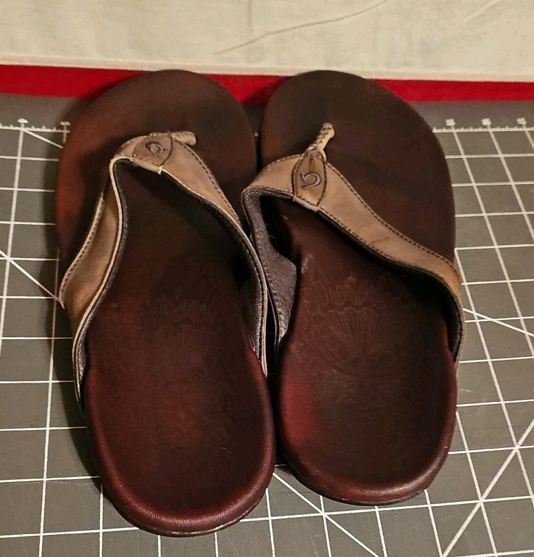 OLUKAI Dark Brown Leather Nui Thong Beach Comfort Sandals Flip Flops Men's Sz 8. Condition is Pre-owned. Shipped with USPS Ground Advantage.