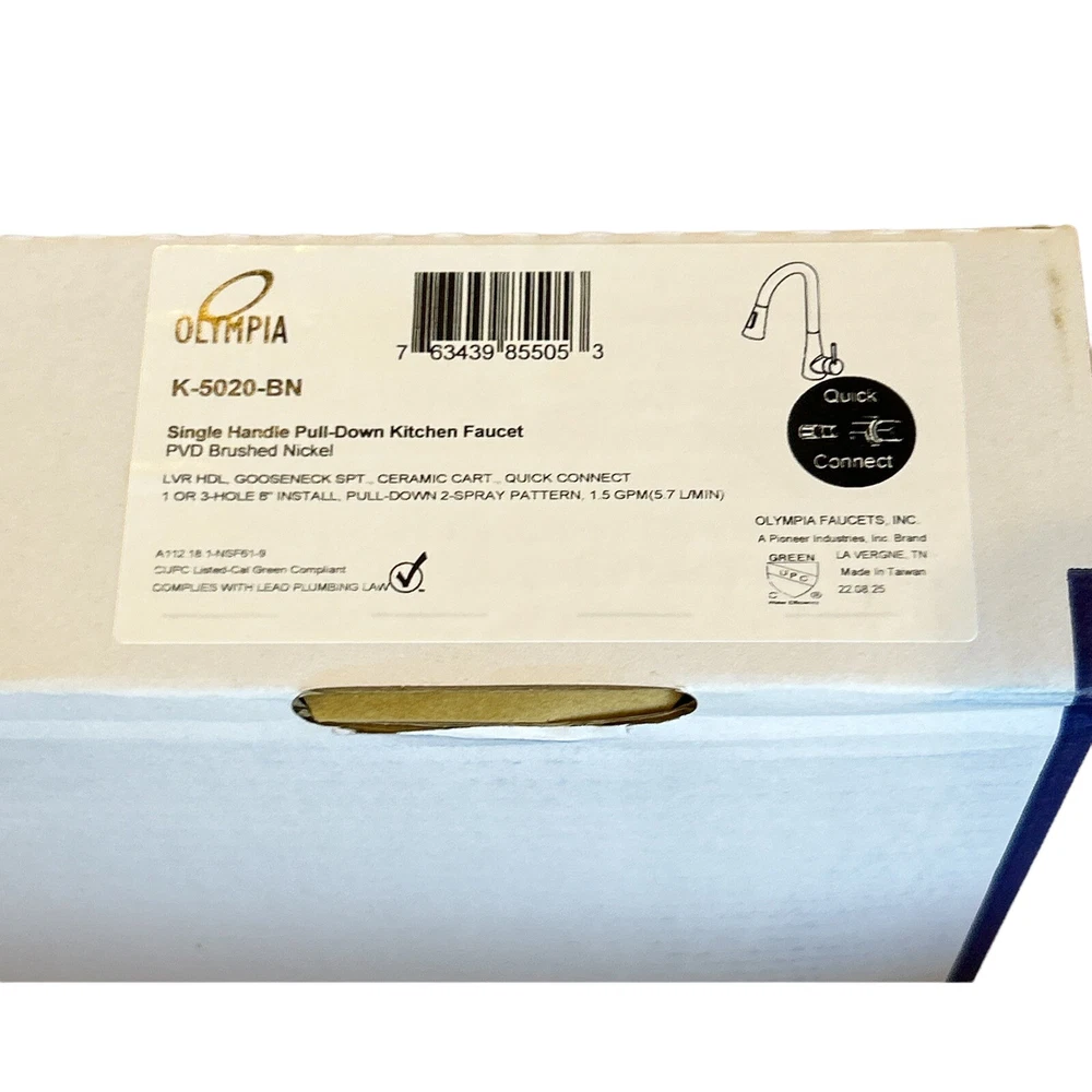 Brand Olympia Faucets MFR # K-5020-BN Country of Origin Taiwan, Province of China Category Kitchen Faucets Dimensions Overall Width 4.06" Overall Height 15.38" Connection Size 3/8" Center-Center Fitting Size Single Hole Details Number of Holes 1 or 3 Finish Brushed Nickel ADA Compliant Yes Valve Type Ceramic Disc Flow Rate (GPM) 1.5 Weight 6 Handle Included Yes Style Modern Mount Type Single Hole Connection Type Compression Hose Spout Reach 7.63" Handle Style Lever Installation Deck Mount
